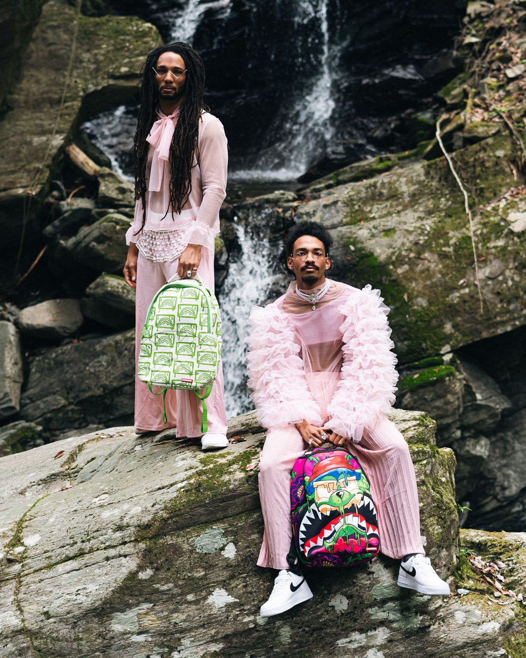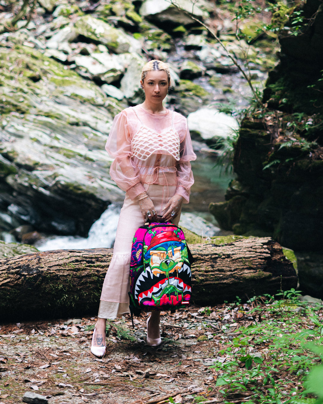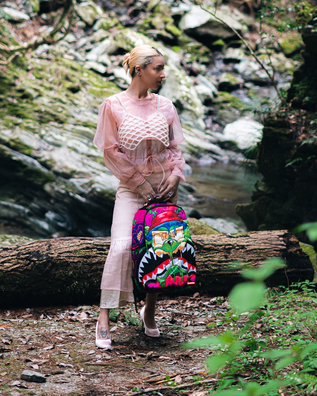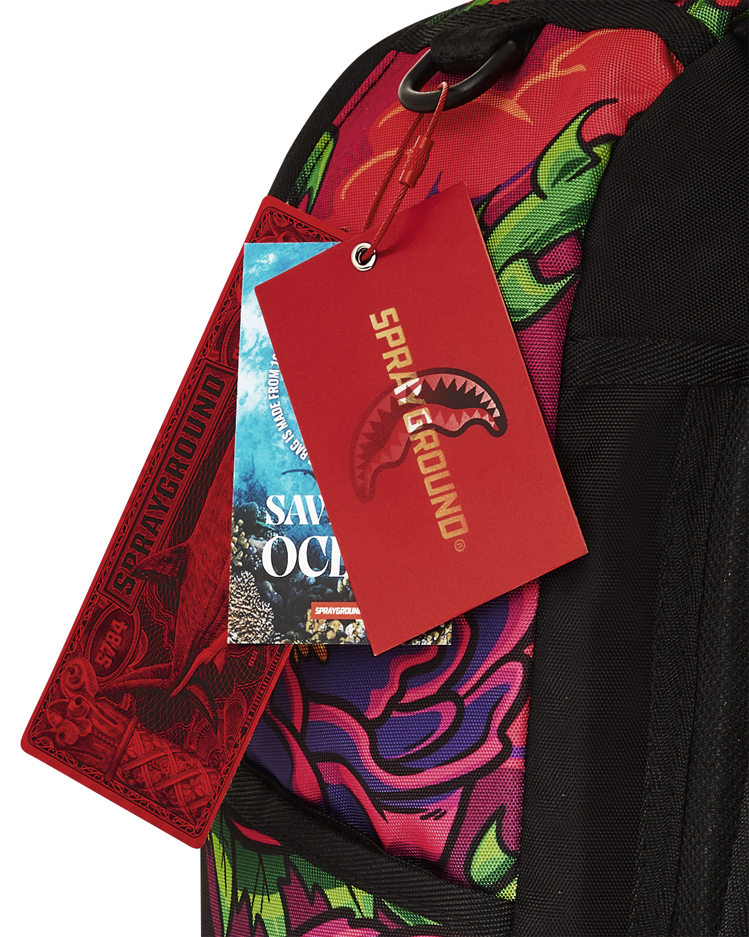 Dimensions: 18' x 6' x 11.5' • Front zipper pocket • Side pockets • Zippered Stash pocket • Separate velour sunglass compartment • Ergonomic mesh back padding • Adjustable Straps for custom sizing • Gold zippers with metal hardware • Metal 'Sprayground Authentic' badge • Slide through back sleeve connects to carry-on luggage to free your hands