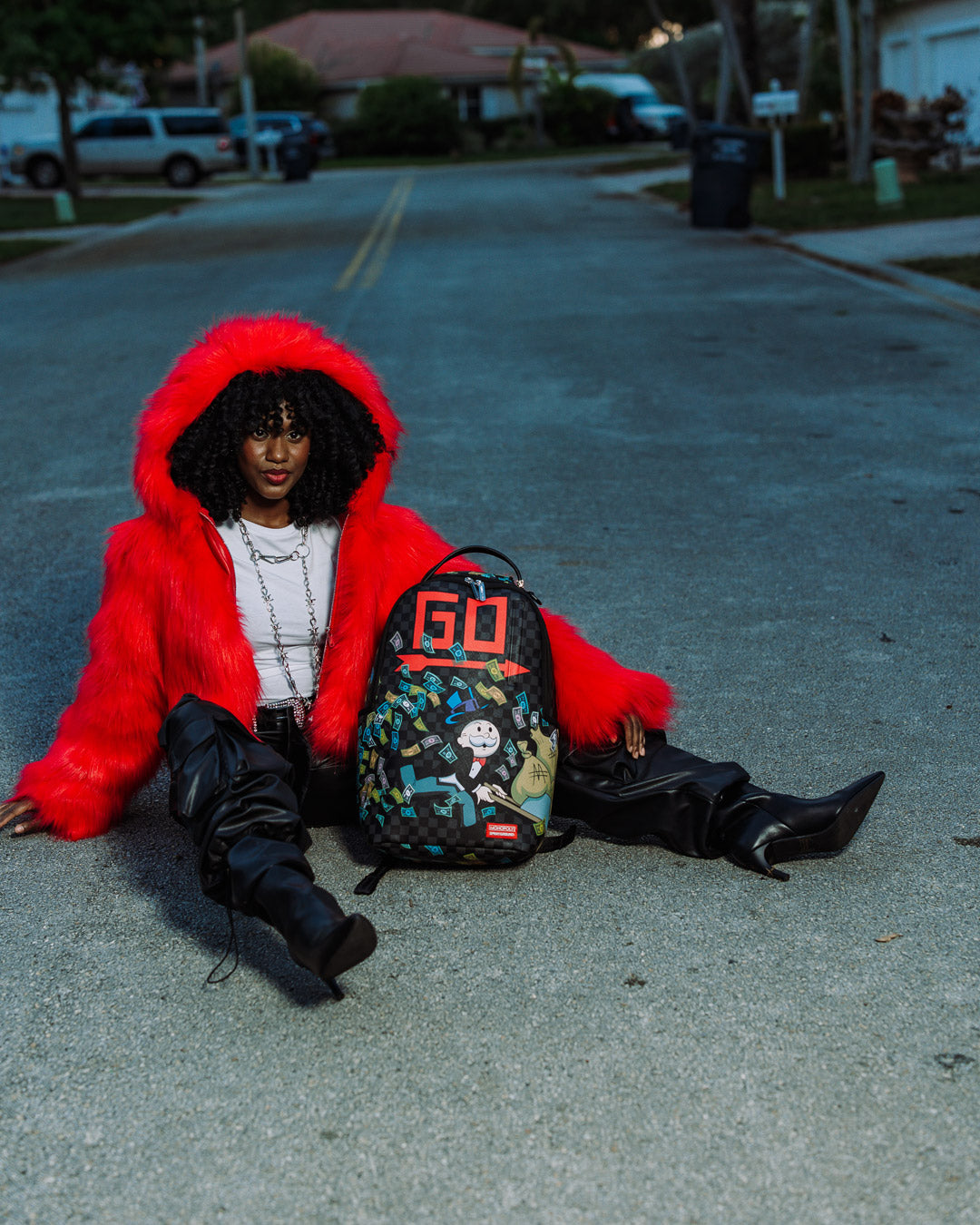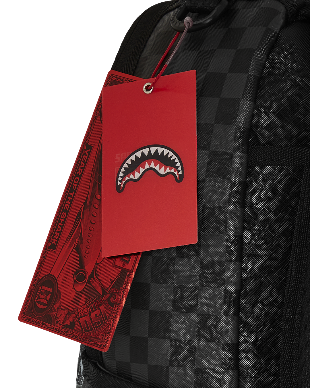 Dimensions: 18' x 6' x 11.5' • Front zipper pocket • Side pockets • Zippered Stash pocket • Separate velour sunglass compartment • Ergonomic mesh back padding • Adjustable Straps for custom sizing • Gold zippers with metal hardware • Metal 'Sprayground Authentic' badge • Slide through back sleeve connects to carry-on luggage to free your hands
