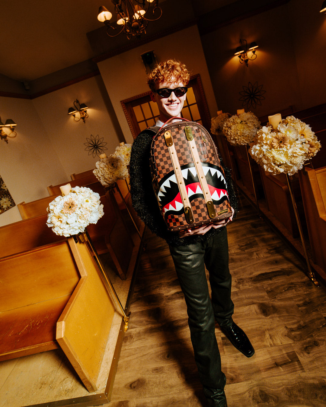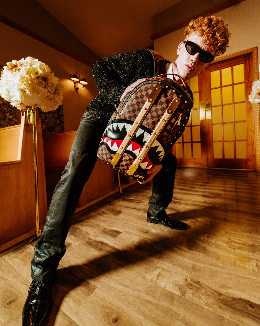 Dimensions: 18' x 6' x 11.5' • Front zipper pocket • Side pockets • Zippered Stash pocket • Separate velour sunglass compartment • Ergonomic mesh back padding • Adjustable Straps for custom sizing • Gold zippers with metal hardware • Metal 'Sprayground Authentic' badge • Slide through back sleeve connects to carry-on luggage to free your hands