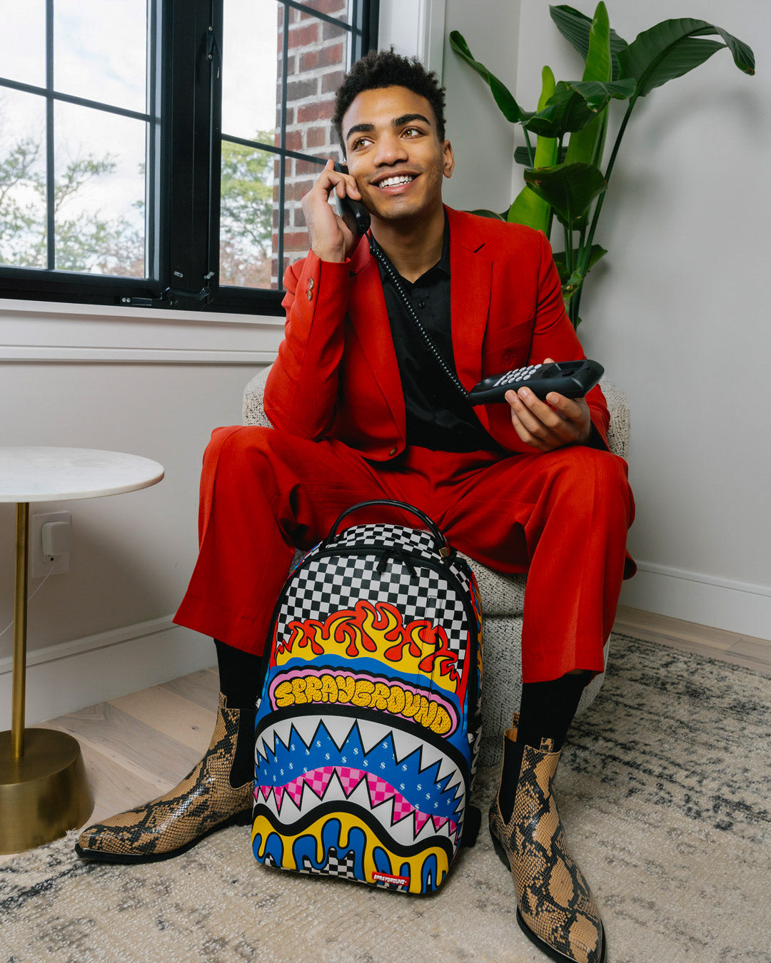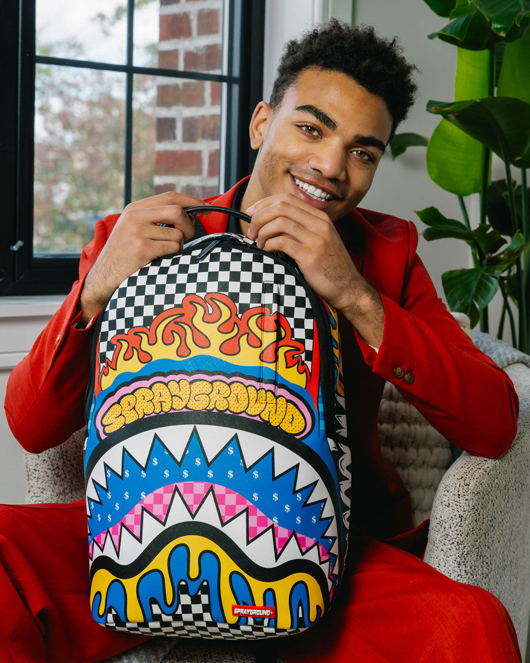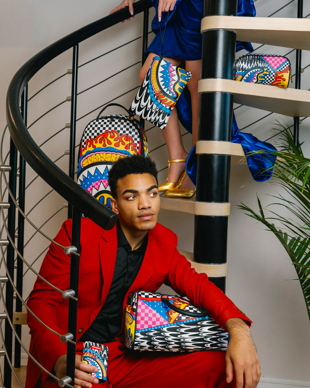 Dimensions: 18' x 6' x 11.5' • Front zipper pocket • Side pockets • Zippered Stash pocket • Separate velour sunglass compartment • Ergonomic mesh back padding • Adjustable Straps for custom sizing • Gold zippers with metal hardware • Metal 'Sprayground Authentic' badge • Slide through back sleeve connects to carry-on luggage to free your hands