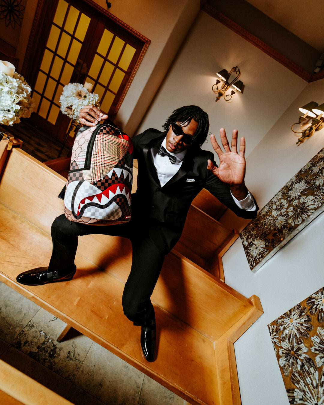 Dimensions: 18' x 6' x 11.5' • Front zipper pocket • Side pockets • Zippered Stash pocket • Separate velour sunglass compartment • Ergonomic mesh back padding • Adjustable Straps for custom sizing • Gold zippers with metal hardware • Metal 'Sprayground Authentic' badge • Slide through back sleeve connects to carry-on luggage to free your hands