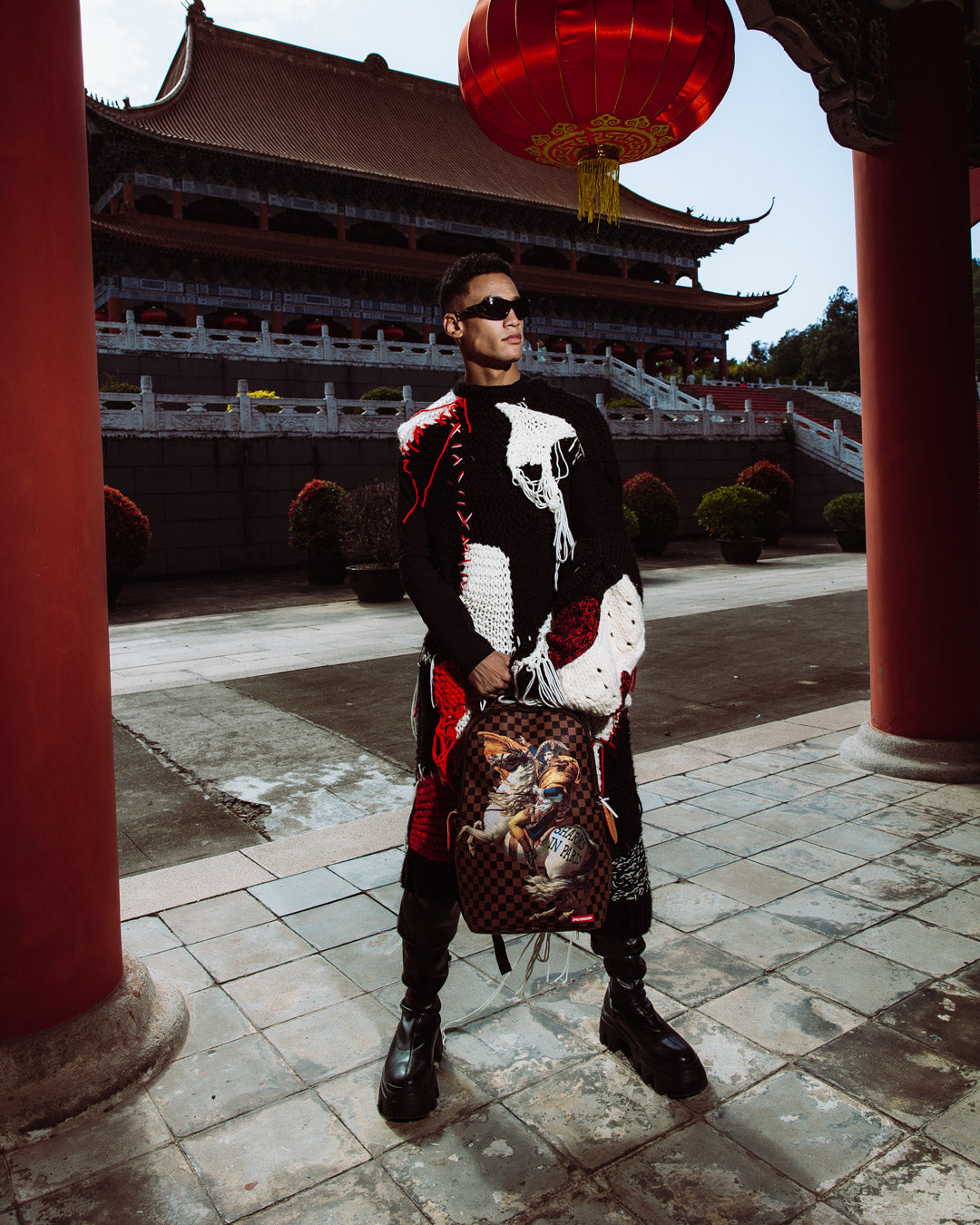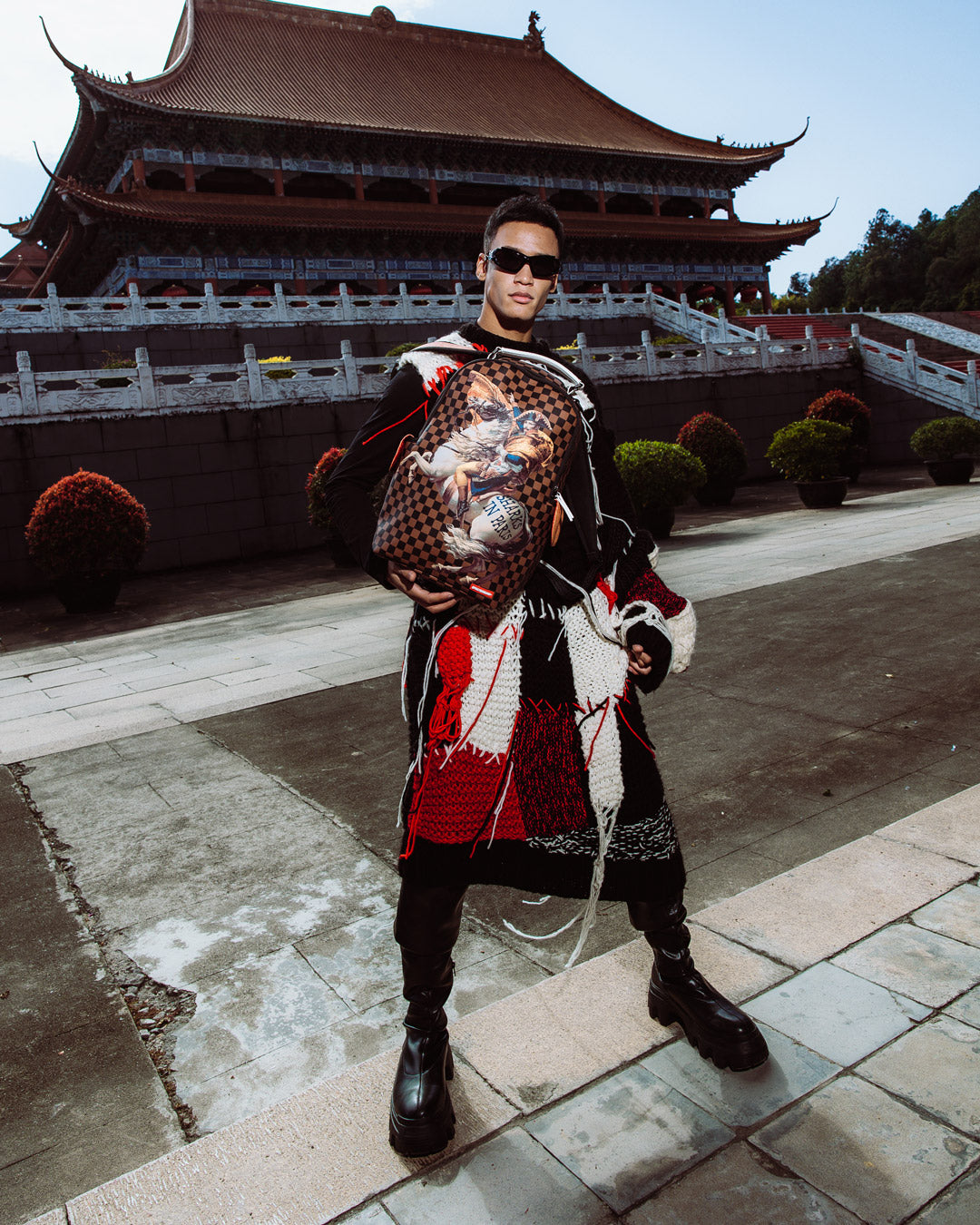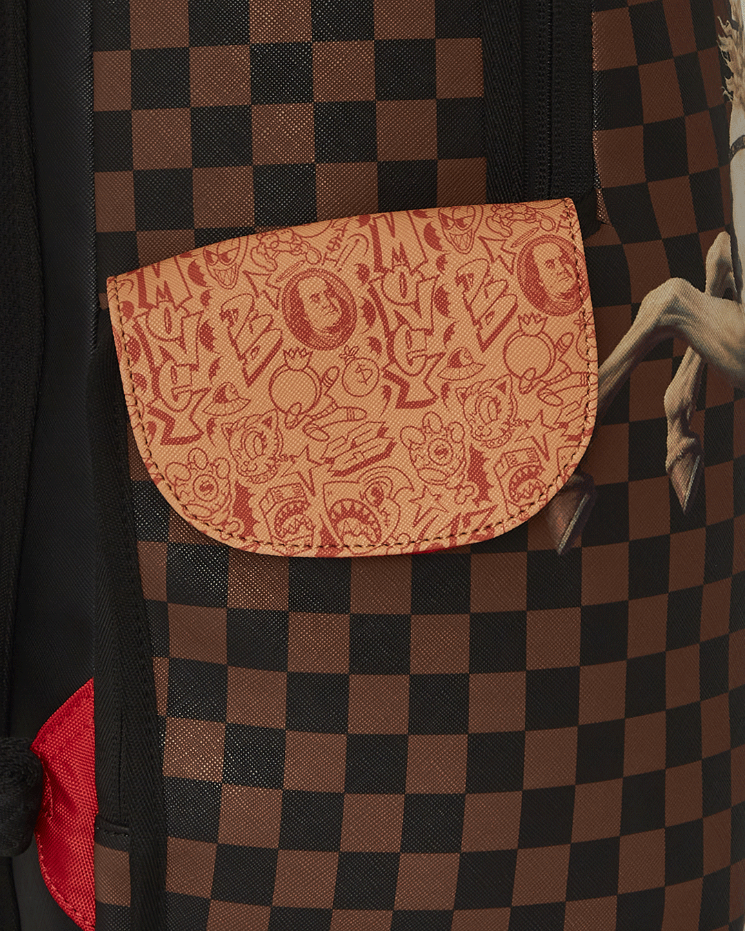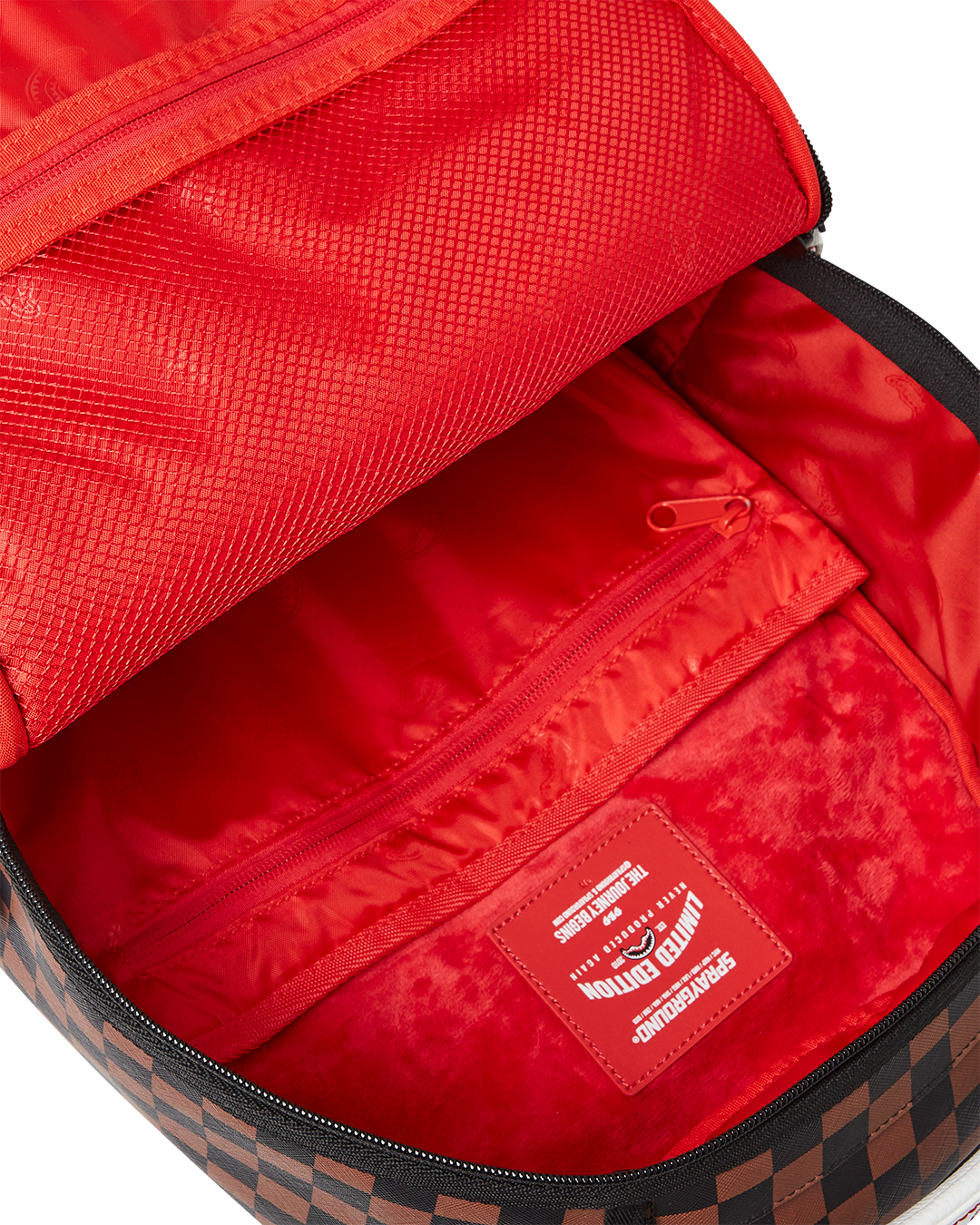 Dimensions: 18' x 6' x 11.5' • Front zipper pocket • Side pockets • Zippered Stash pocket • Separate velour sunglass compartment • Ergonomic mesh back padding • Adjustable Straps for custom sizing • Gold zippers with metal hardware • Metal 'Sprayground Authentic' badge • Slide through back sleeve connects to carry-on luggage to free your hands