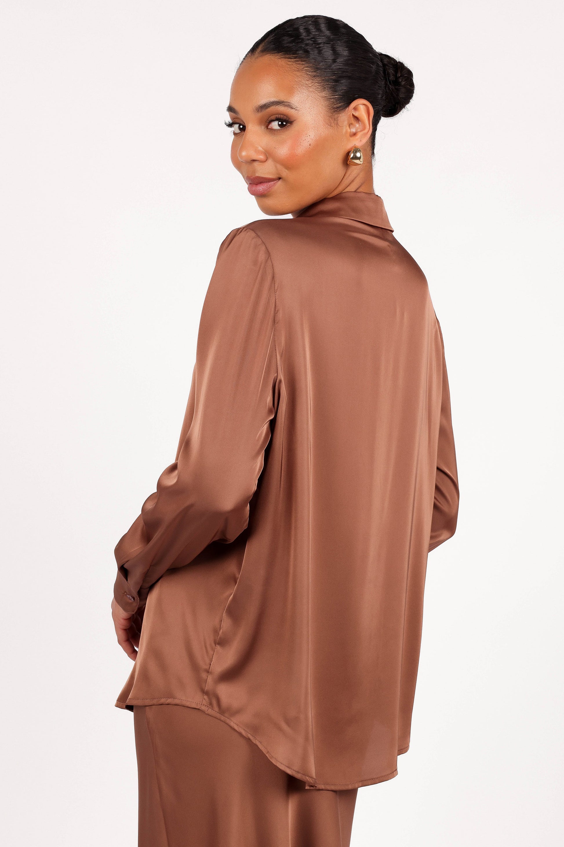 DETAILS This chic satin button down shirt is the perfect choice for any occasion. Its classic spread collar and v neckline provide a timeless silhouette, while long sleeves with button close cuffs offer a flattering fit. With functional buttons down the front, this piece can easily be dressed up or down to suit your style.