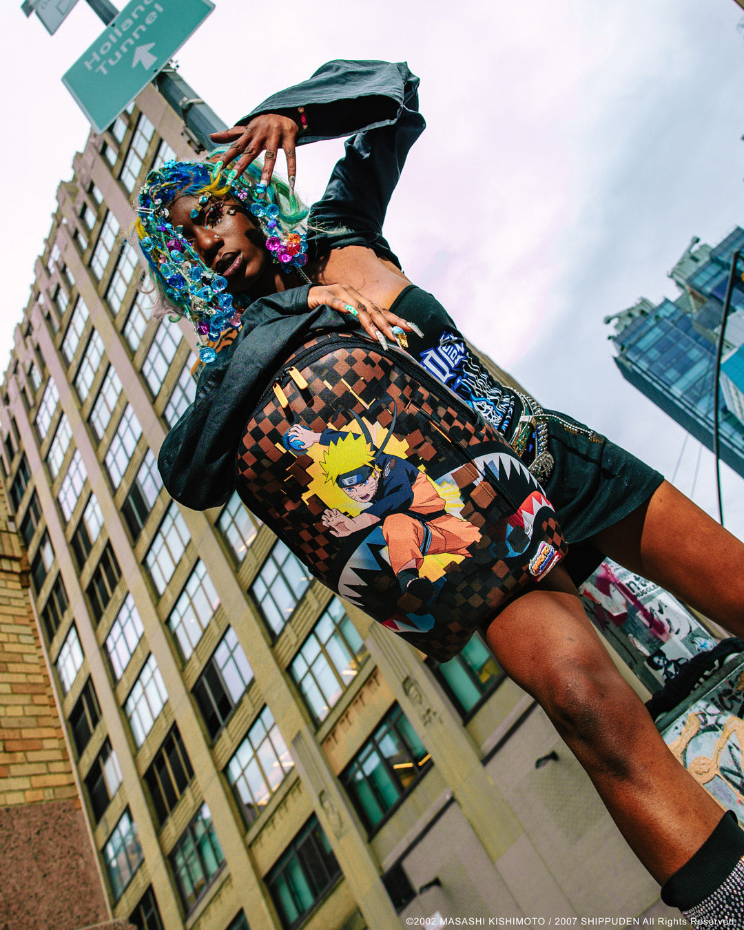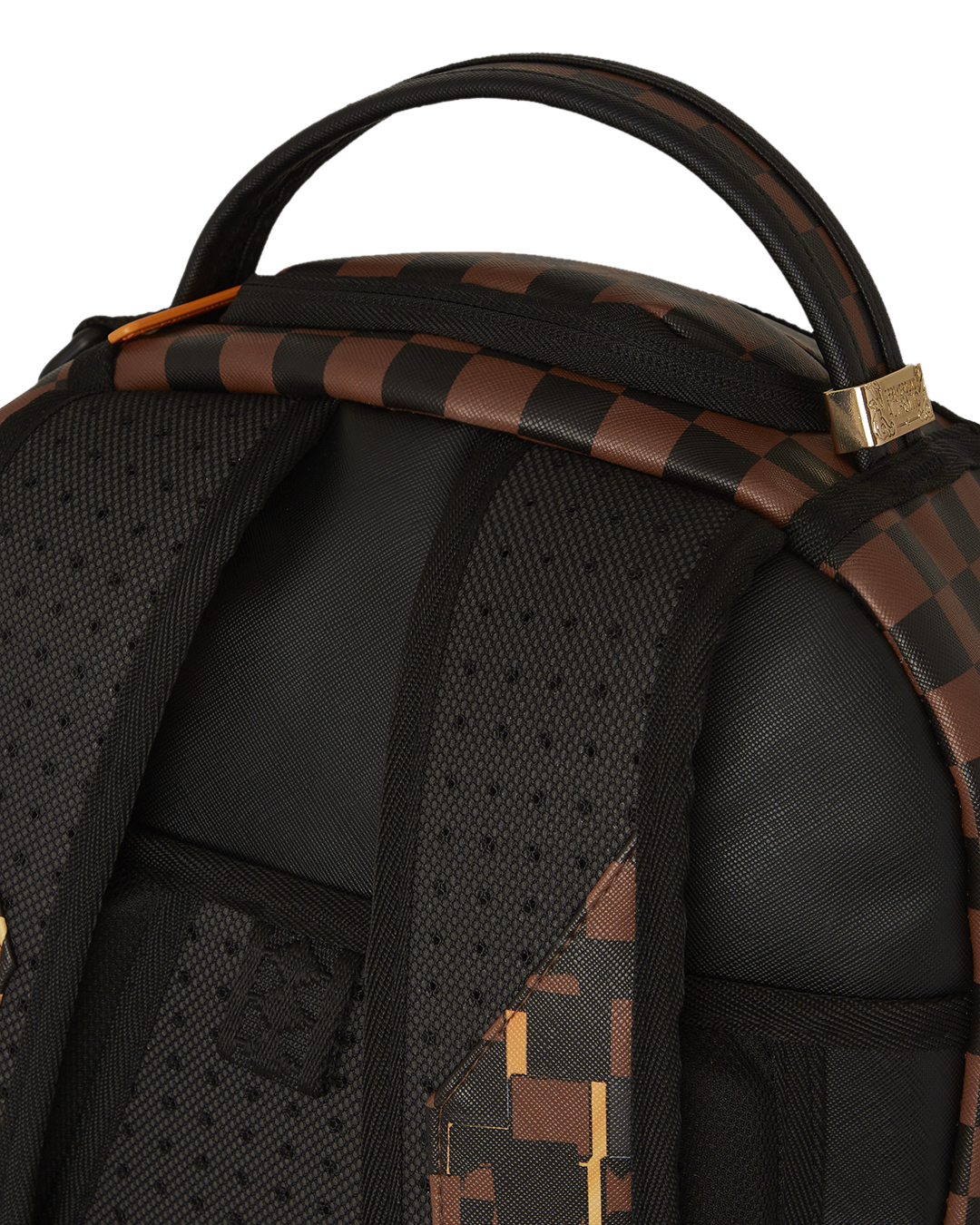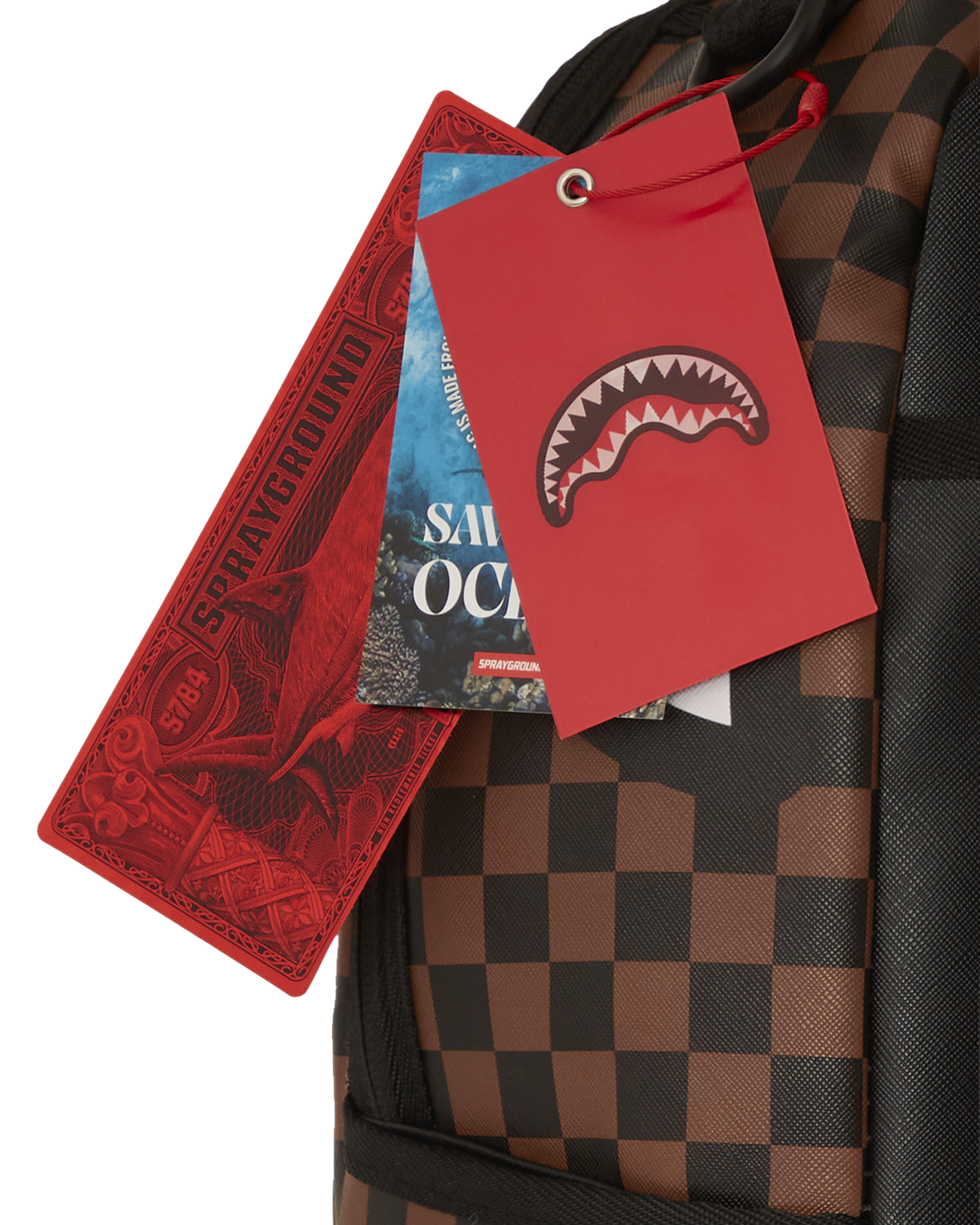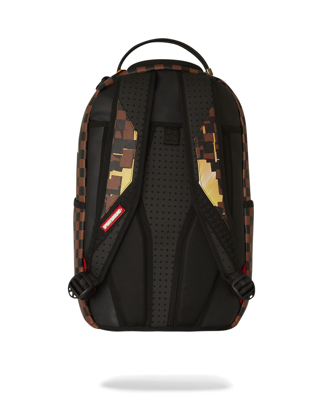 Dimensions: 18' x 6' x 11.5' • Front zipper pocket • Side pockets • Zippered Stash pocket • Separate velour sunglass compartment • Ergonomic mesh back padding • Adjustable Straps for custom sizing • Gold zippers with metal hardware • Metal 'Sprayground Authentic' badge • Slide through back sleeve connects to carry-on luggage to free your hands