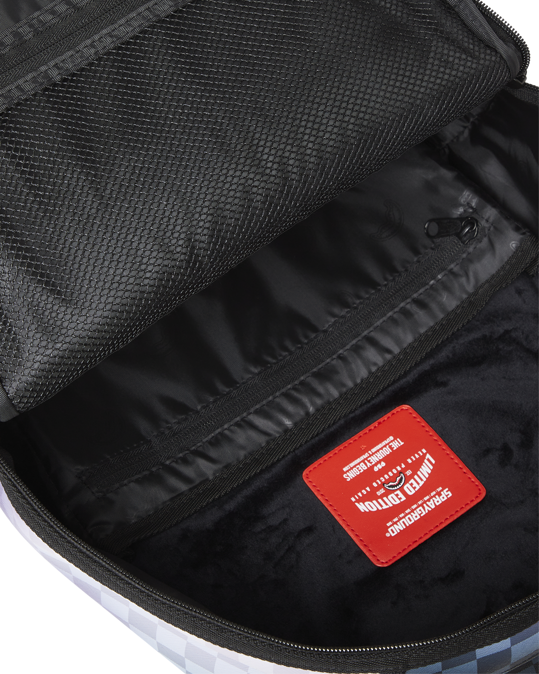 Dimensions: 18' x 6' x 11.5' • Front zipper pocket • Side pockets • Zippered Stash pocket • Separate velour sunglass compartment • Ergonomic mesh back padding • Adjustable Straps for custom sizing • Gold zippers with metal hardware • Metal 'Sprayground Authentic' badge • Slide through back sleeve connects to carry-on luggage to free your hands