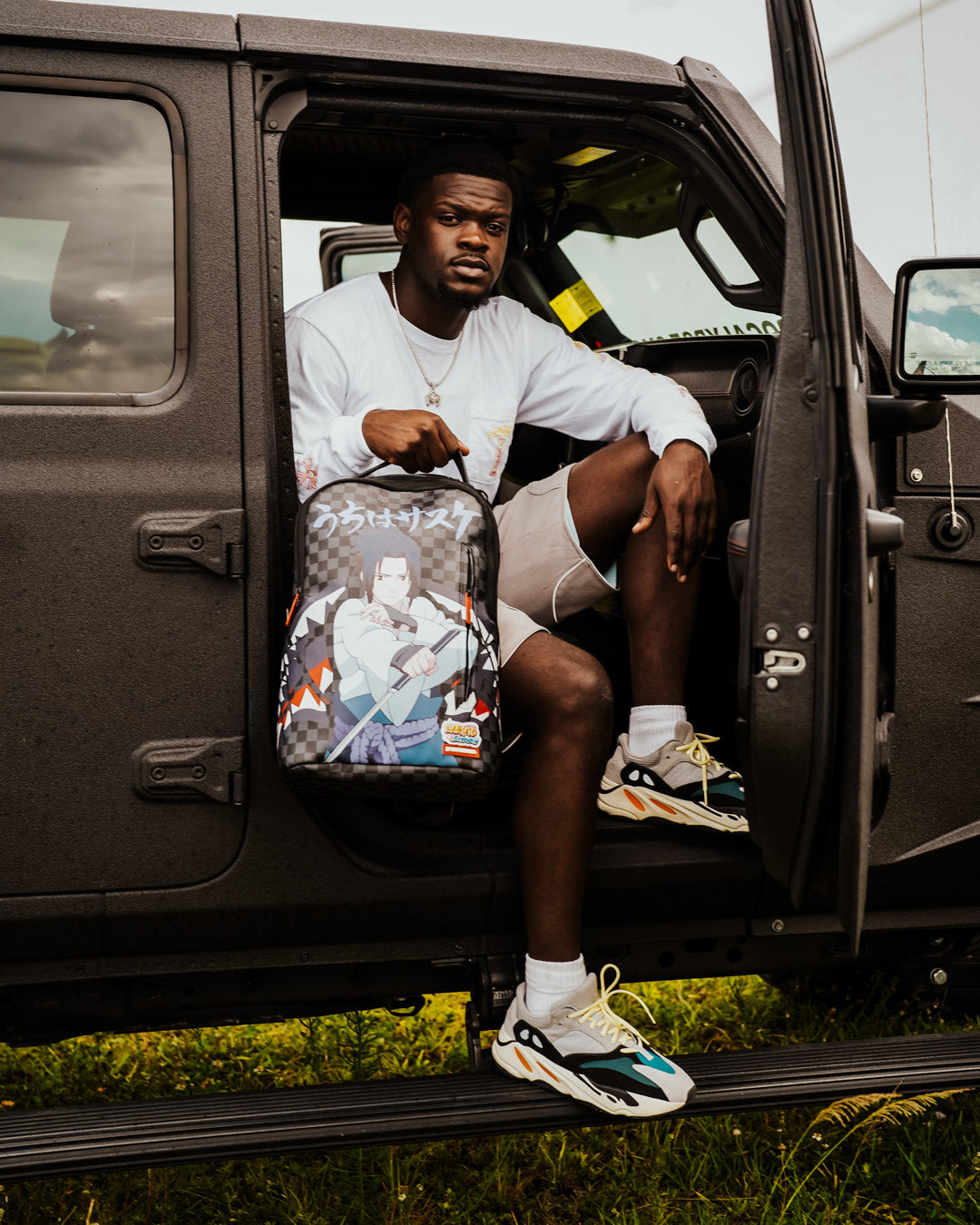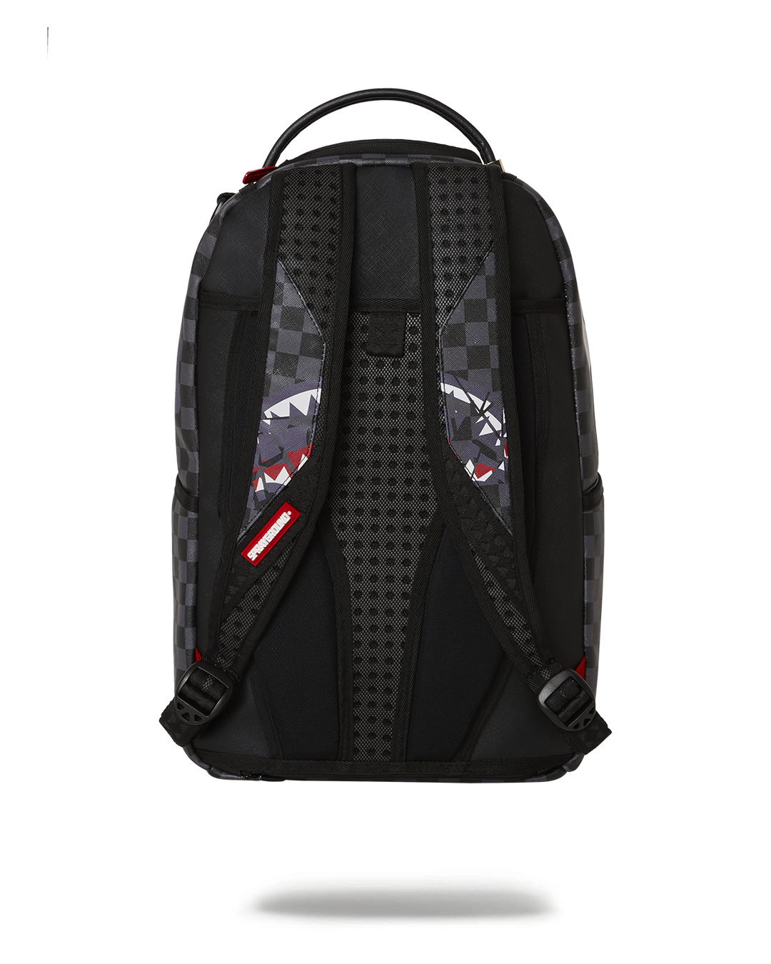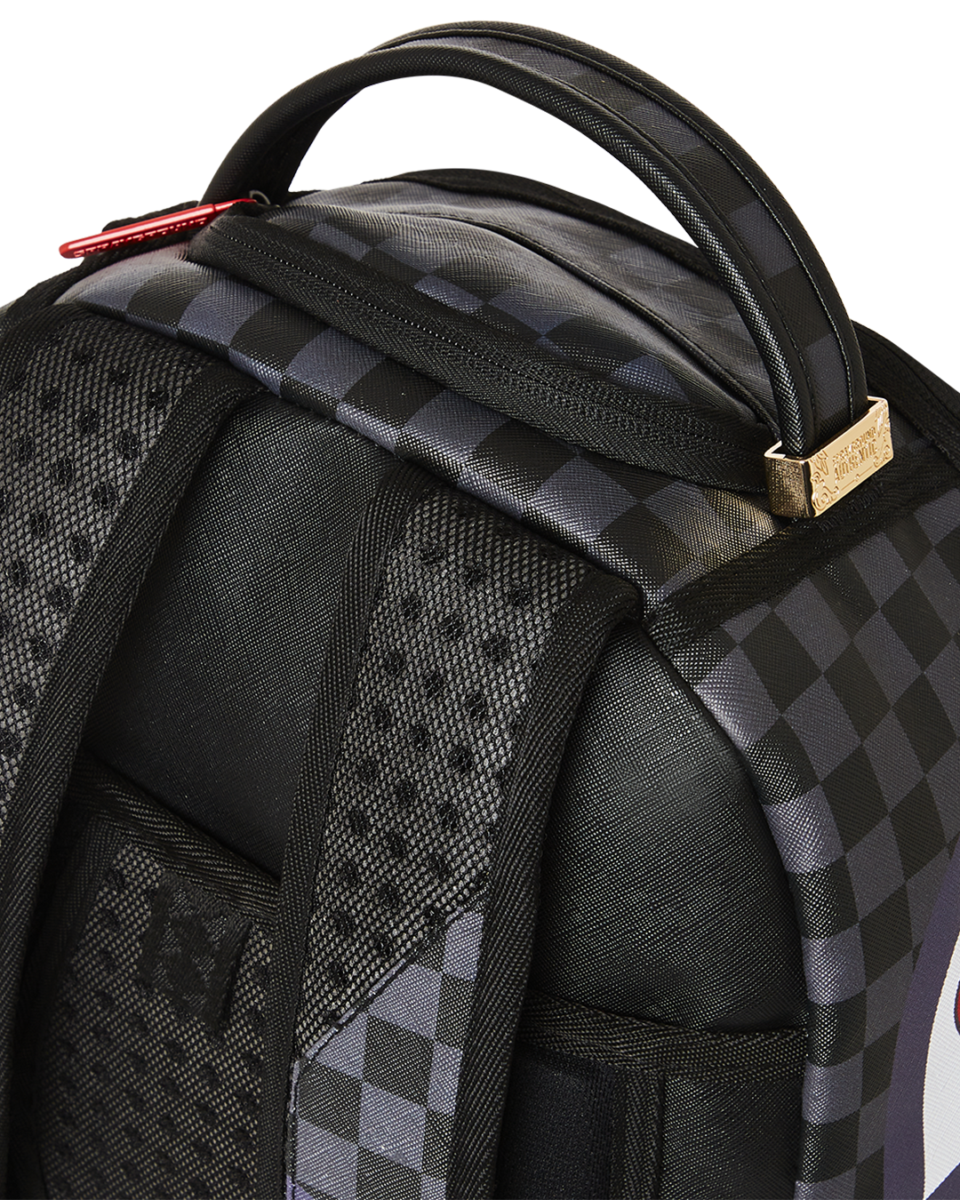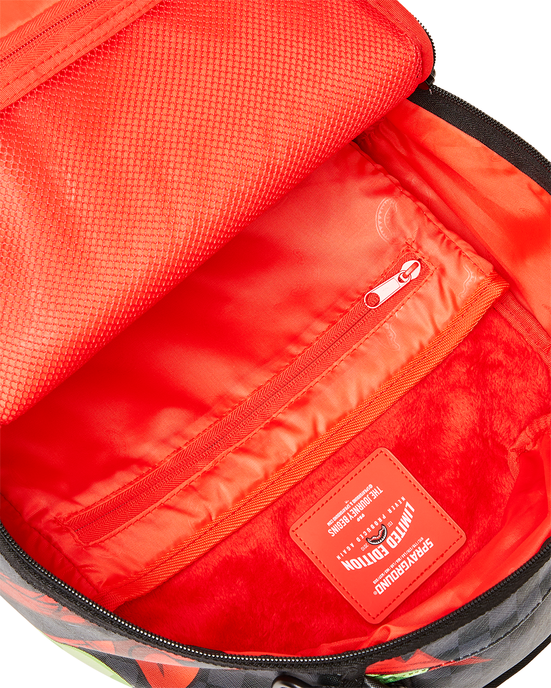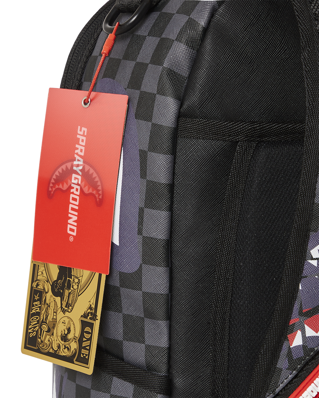 Dimensions: 18' x 6' x 11.5' • Front zipper pocket • Side pockets • Zippered Stash pocket • Separate velour sunglass compartment • Ergonomic mesh back padding • Adjustable Straps for custom sizing • Gold zippers with metal hardware • Metal 'Sprayground Authentic' badge • Slide through back sleeve connects to carry on luggage to free your hands