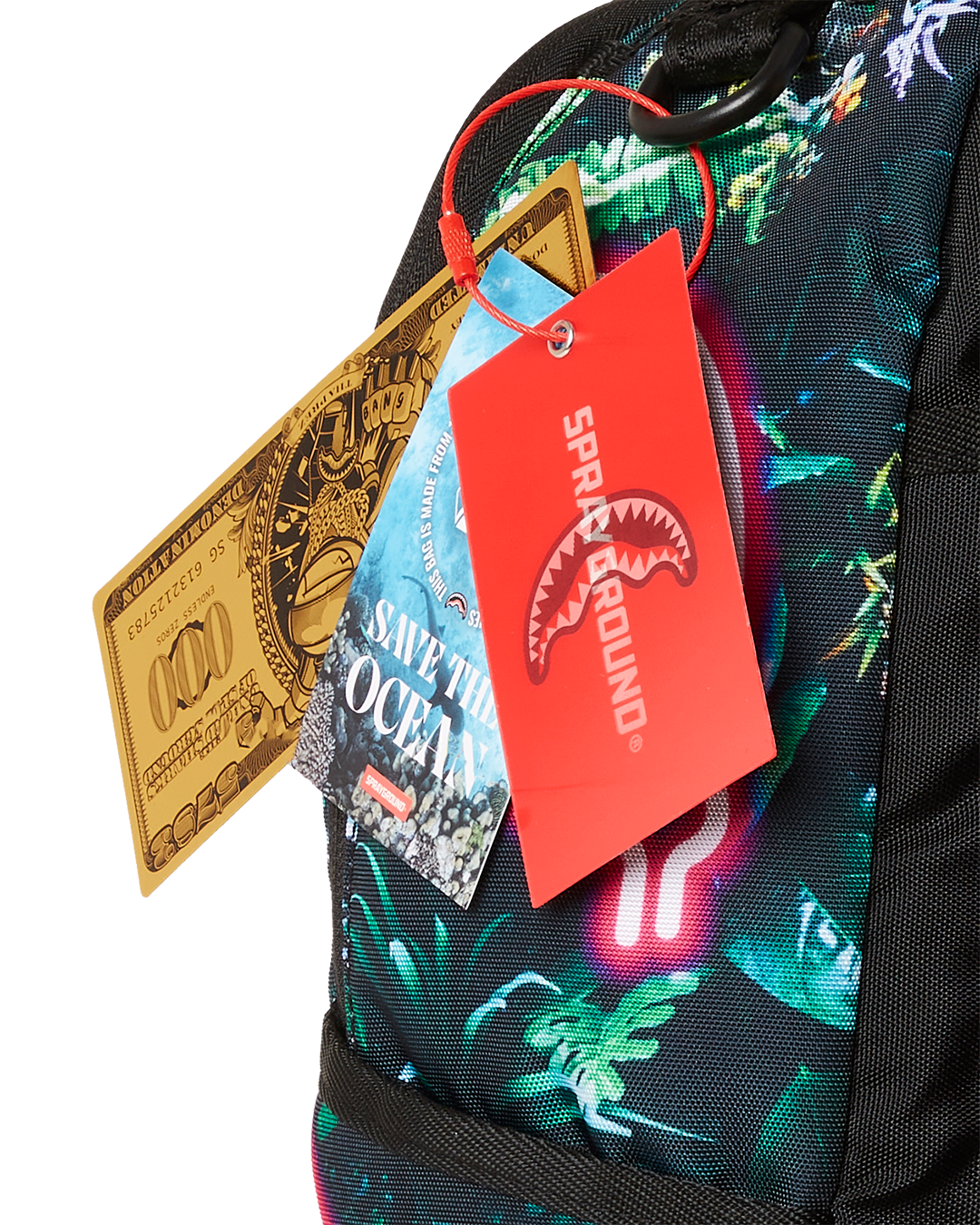 Dimensions: 18' x 6' x 11.5' • Front zipper pocket • Side pockets • Zippered Stash pocket • Separate velour sunglass compartment • Ergonomic mesh back padding • Adjustable Straps for custom sizing • Gold zippers with metal hardware • Metal 'Sprayground Authentic' badge • Slide through back sleeve connects to carry-on luggage to free your hands
