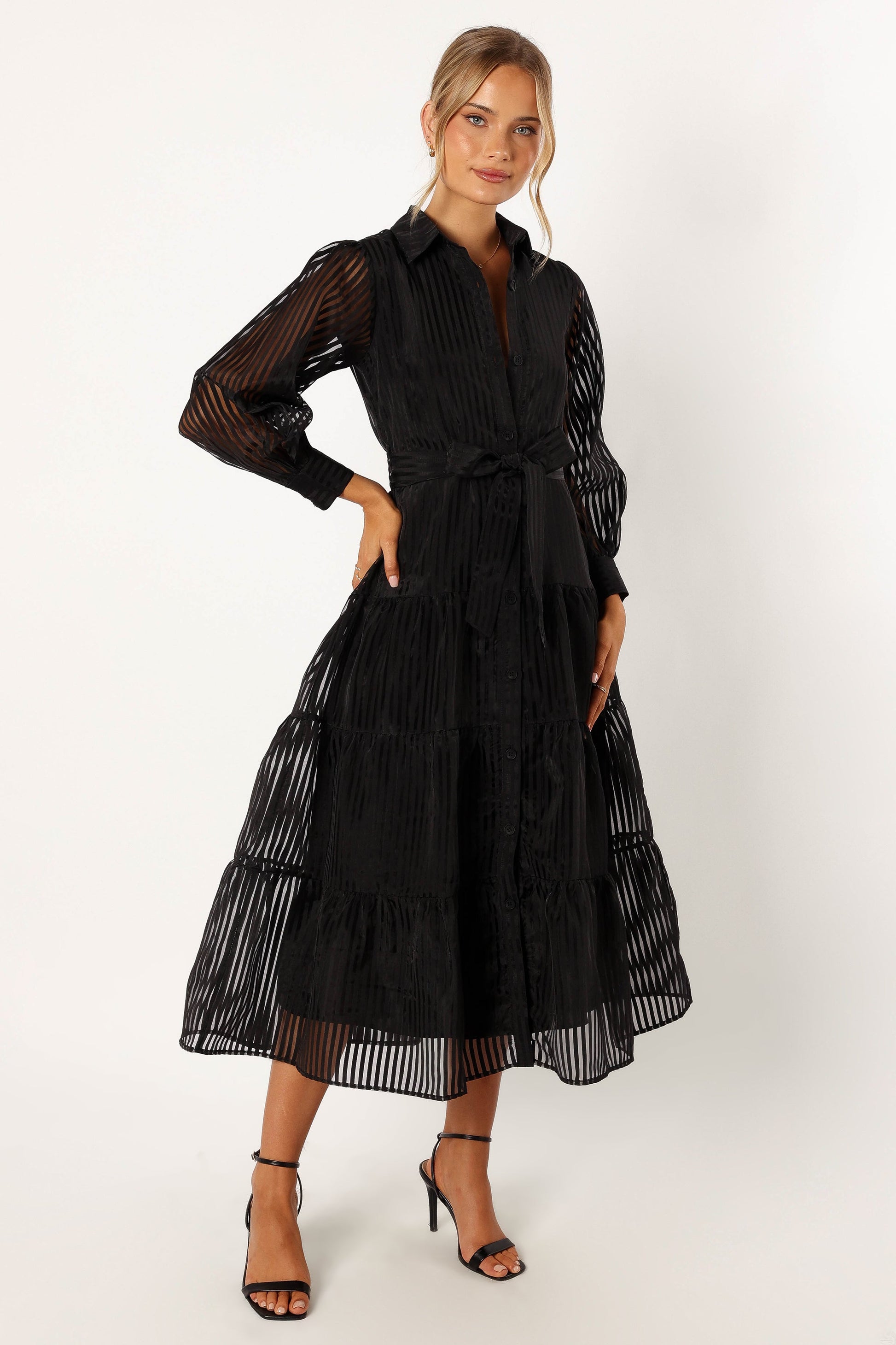 DETAILS The Neve Longsleeve Maxi Dress in Black is the perfect statement piece for any fashion-forward wardrobe. Featuring a flattering maxi length, collard neckline, and v neckline, this dress is both playful and trendy.