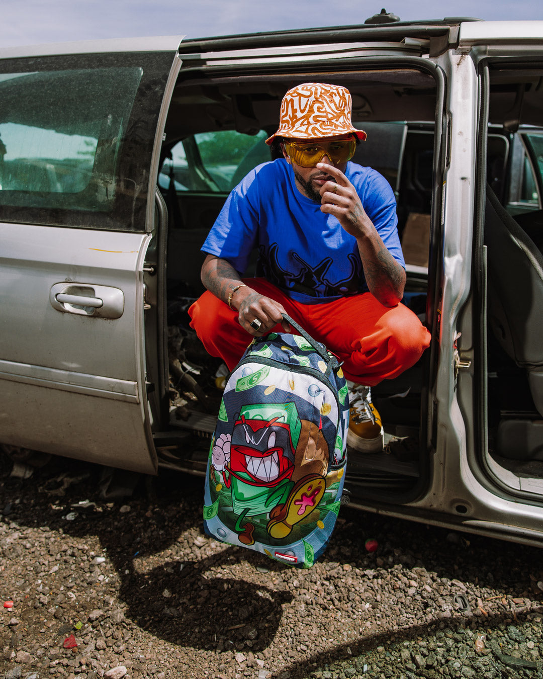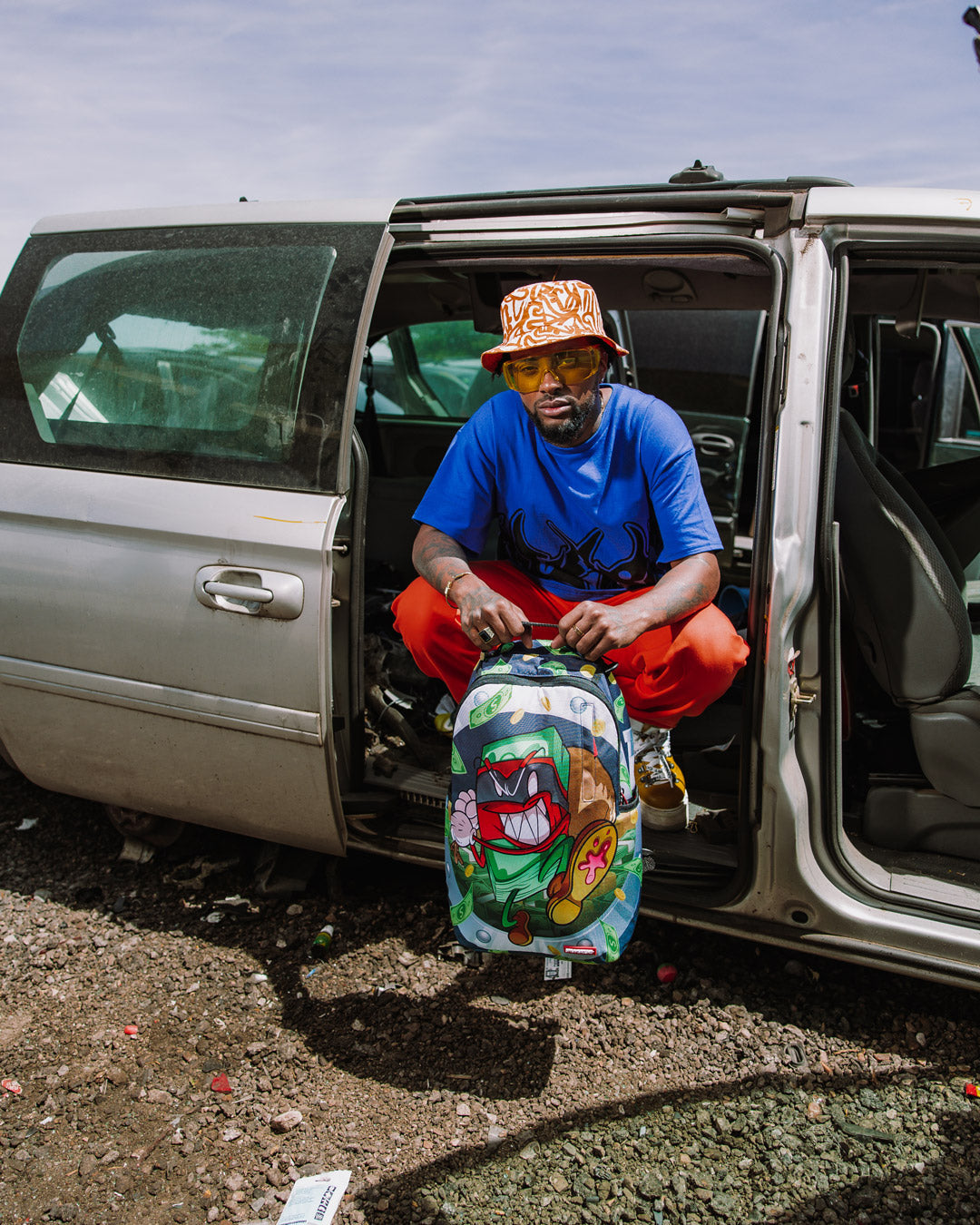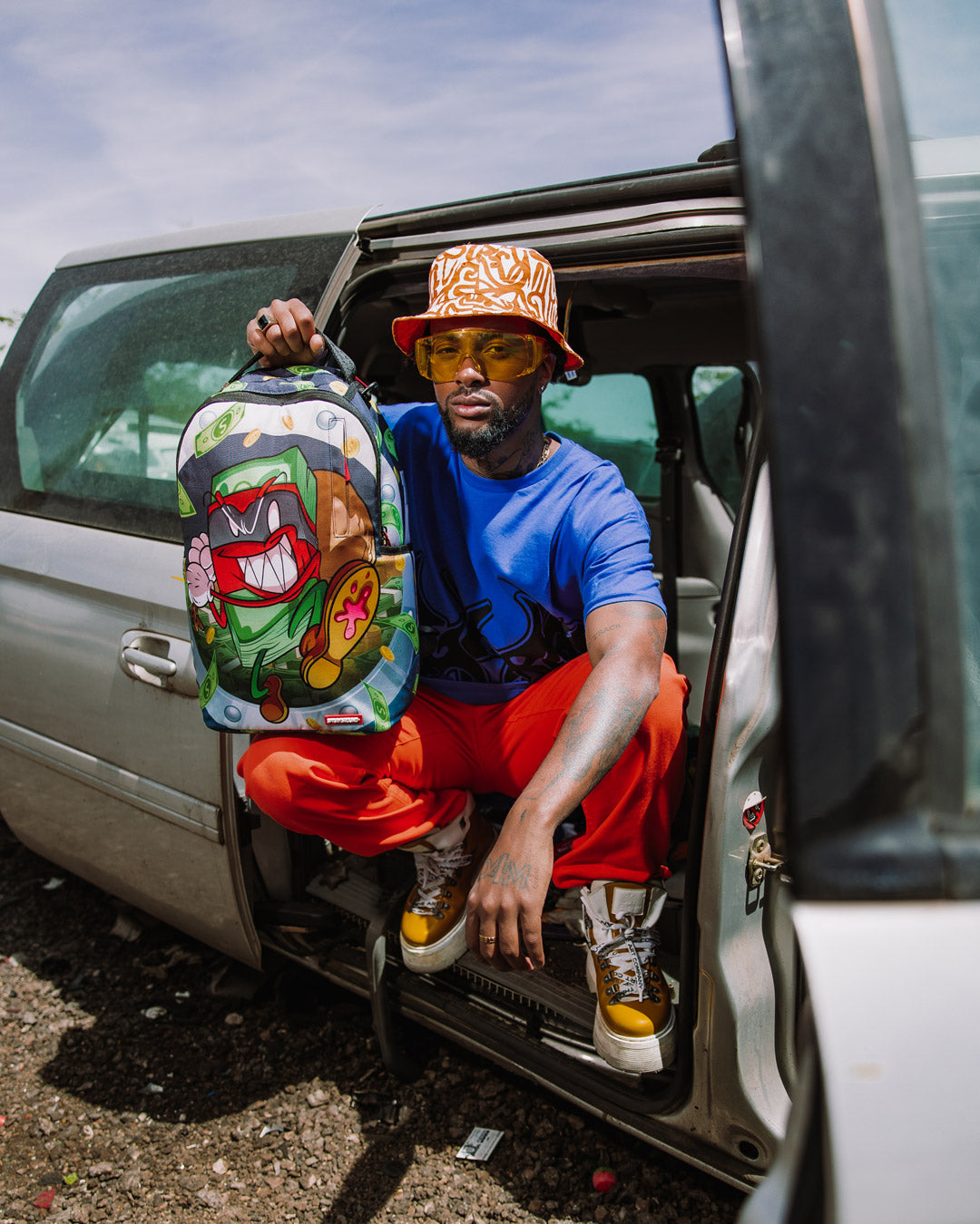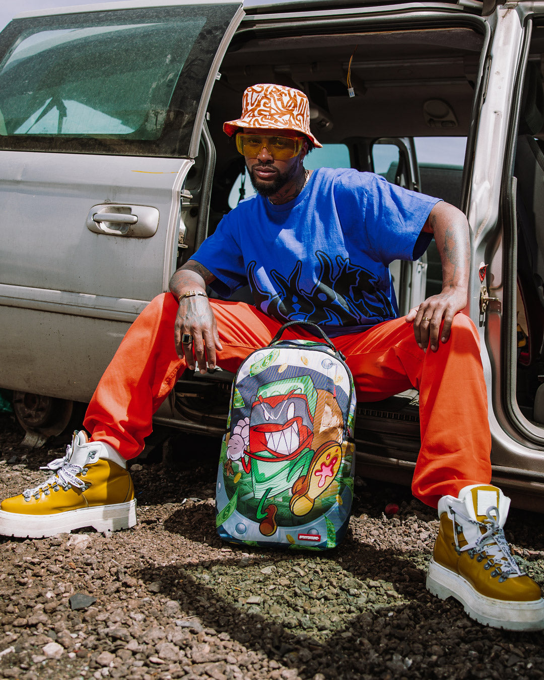 Dimensions: 18' x 6' x 11.5' • Front zipper pocket • Side pockets • Zippered Stash pocket • Separate velour sunglass compartment • Ergonomic mesh back padding • Adjustable Straps for custom sizing • Gold zippers with metal hardware • Metal 'Sprayground Authentic' badge • Slide through back sleeve connects to carry-on luggage to free your hands