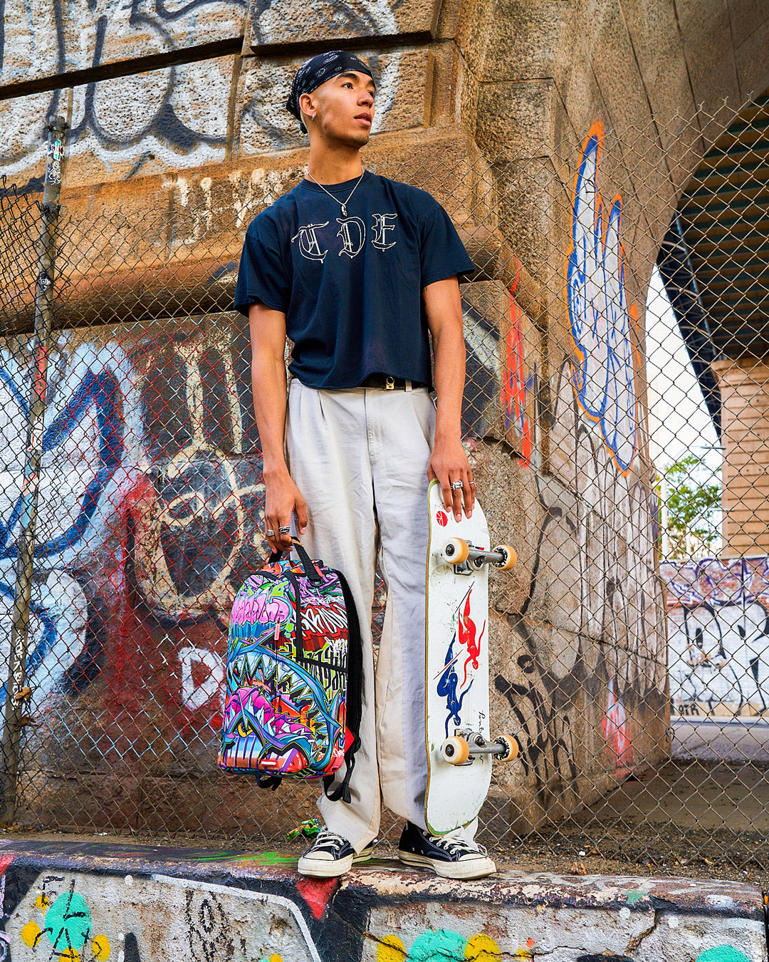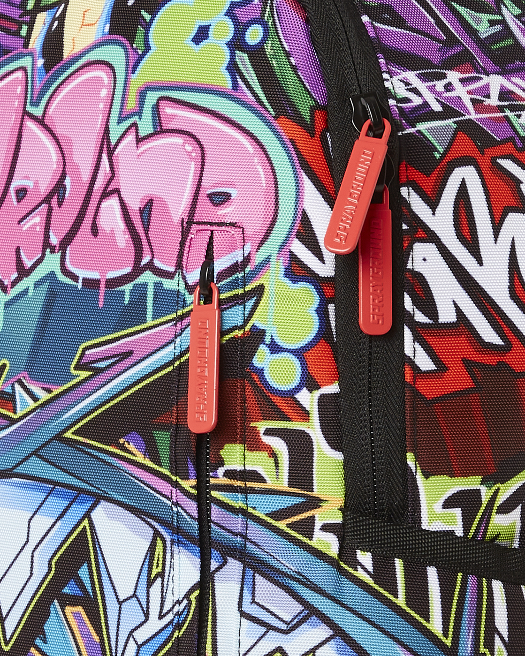 Dimensions: 18' x 6' x 11.5' • Front zipper pocket • Side pockets • Zippered Stash pocket • Separate velour sunglass compartment • Ergonomic mesh back padding • Adjustable Straps for custom sizing • Gold zippers with metal hardware • Metal 'Sprayground Authentic' badge • Slide through back sleeve connects to carry-on luggage to free your hands