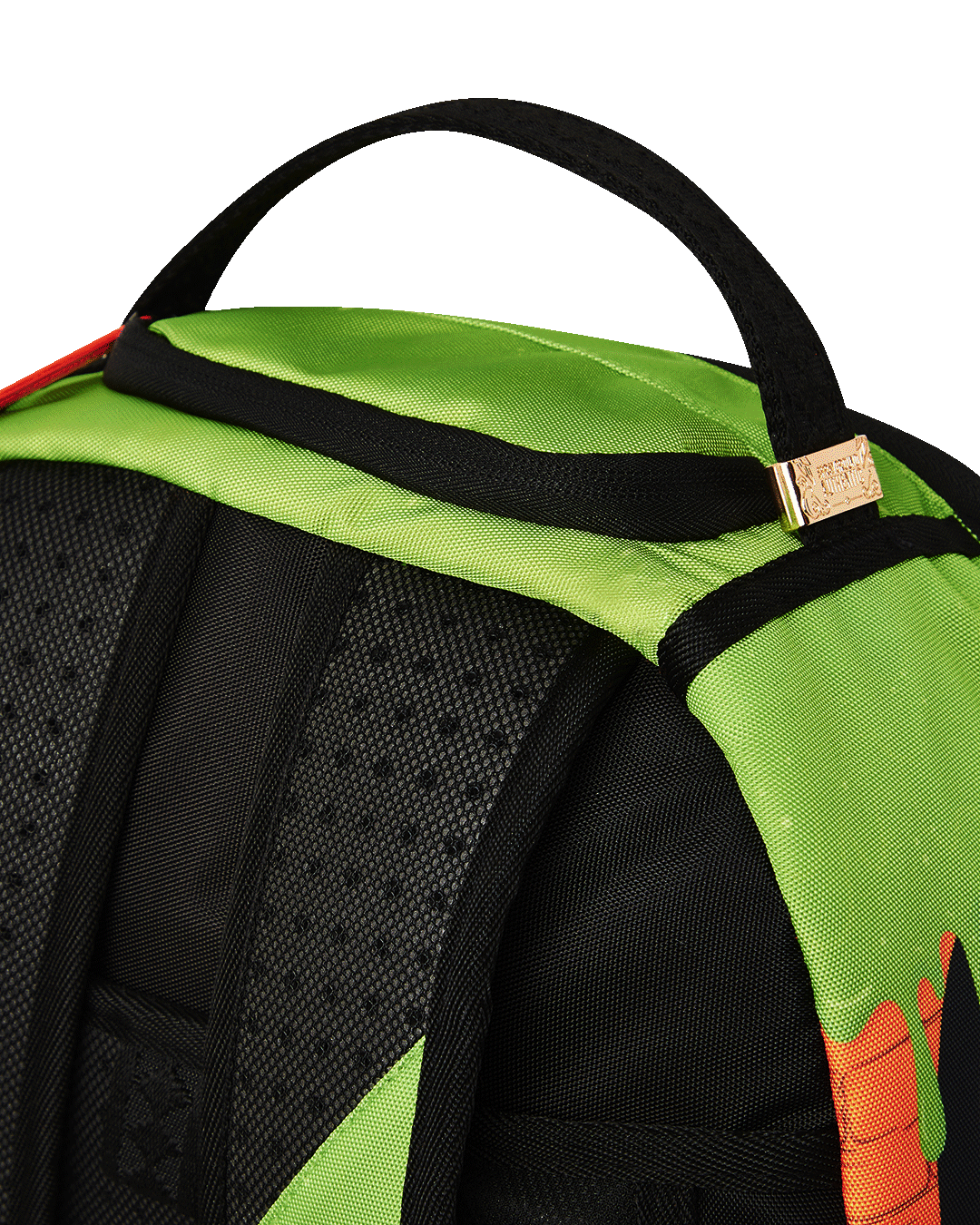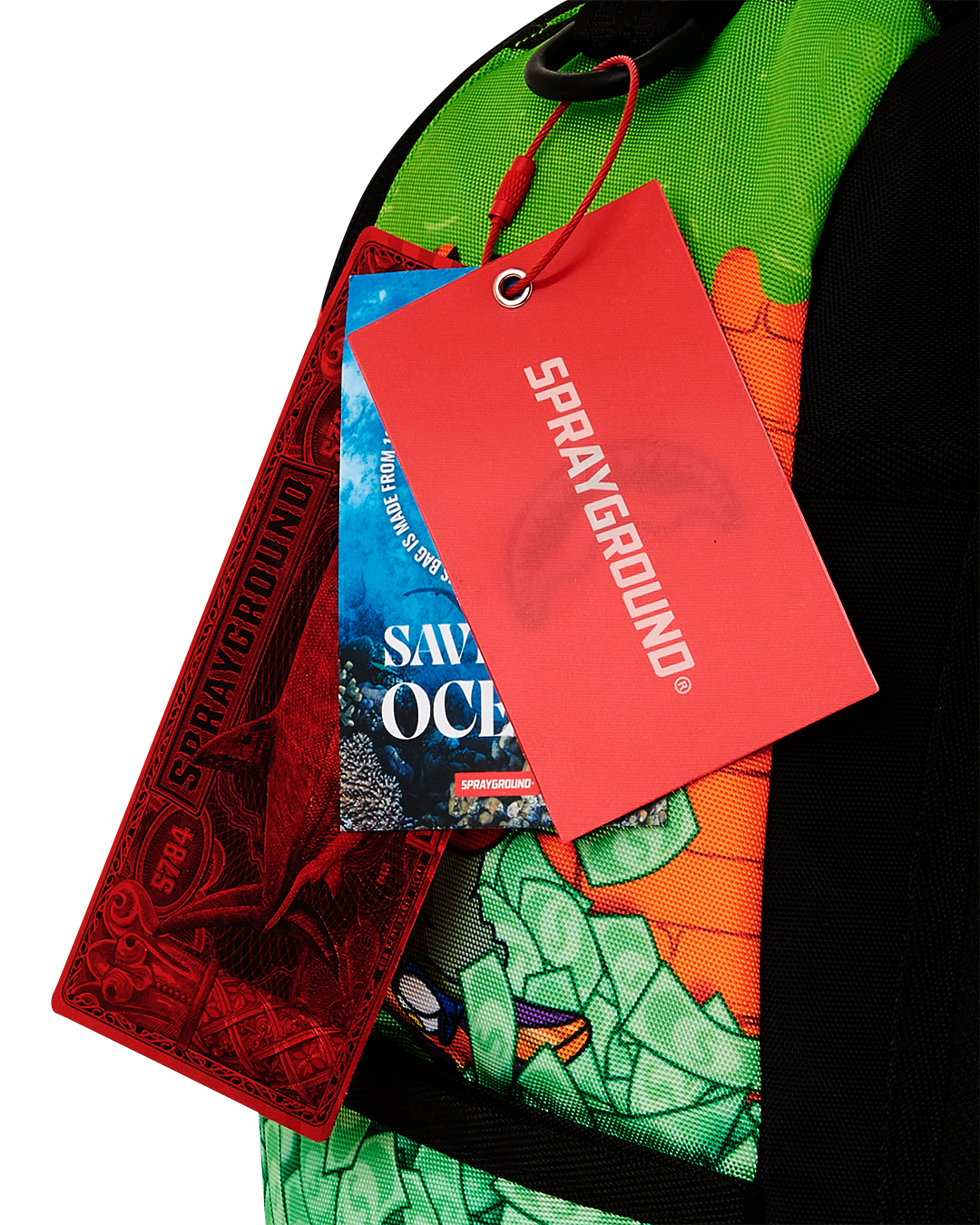 Dimensions: 18' x 6' x 11.5' • Front zipper pocket • Side pockets • Zippered Stash pocket • Separate velour sunglass compartment • Ergonomic mesh back padding • Adjustable Straps for custom sizing • Gold zippers with metal hardware • Metal 'Sprayground Authentic' badge • Slide through back sleeve connects to carry-on luggage to free your hands