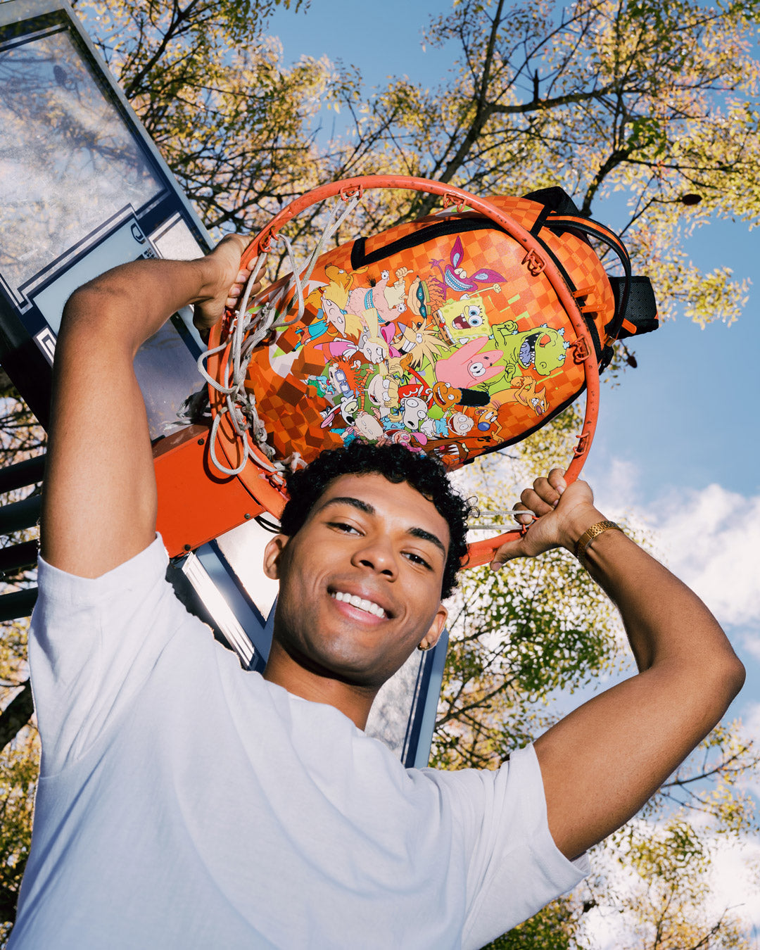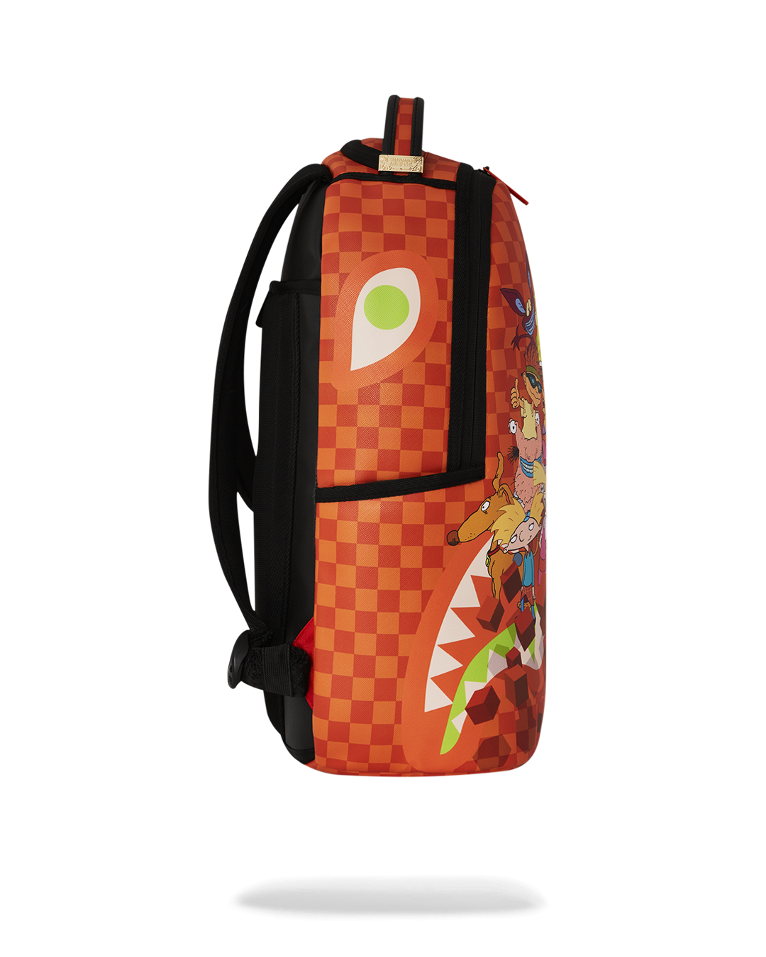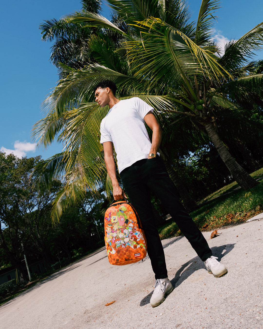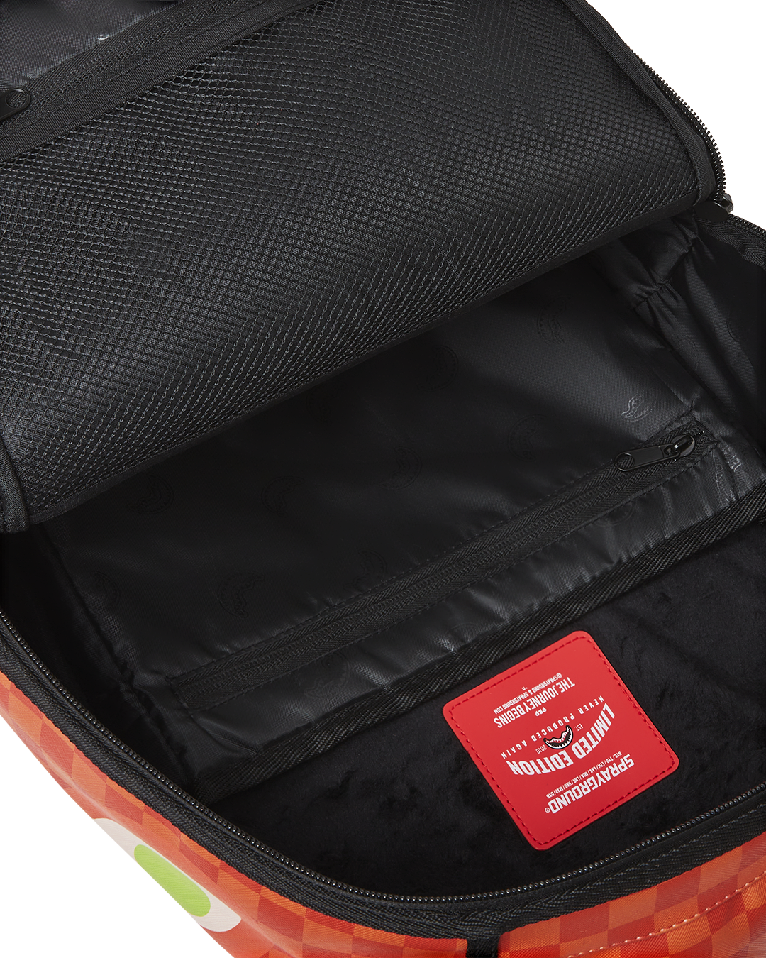 Dimensions: 18' x 6' x 11.5' • Front zipper pocket • Side pockets • Zippered Stash pocket • Separate velour sunglass compartment • Ergonomic mesh back padding • Adjustable Straps for custom sizing • Gold zippers with metal hardware • Metal 'Sprayground Authentic' badge • Slide through back sleeve connects to carry-on luggage to free your hands