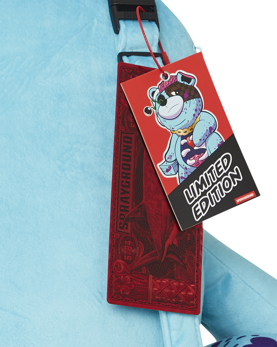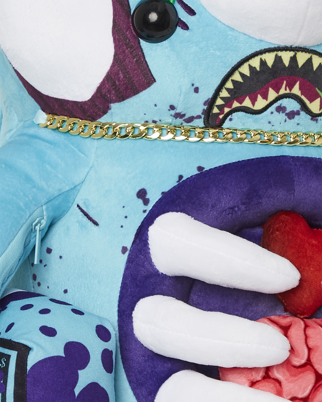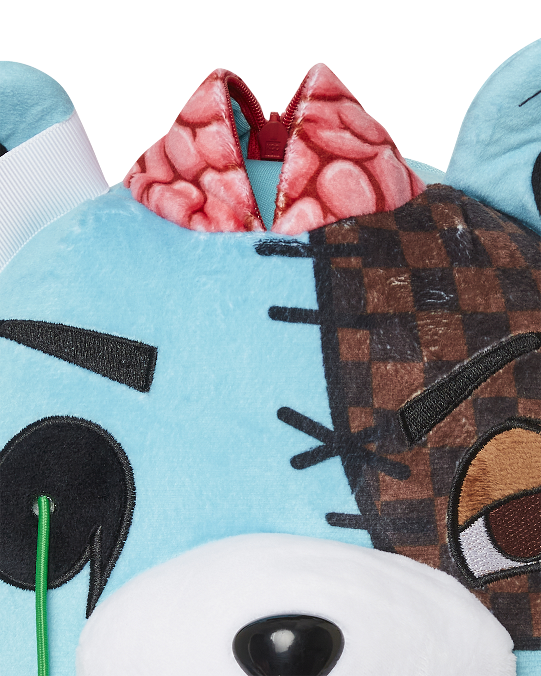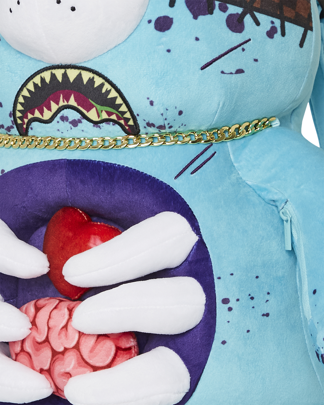 Gory Zombie bear is a heavily detailed plush backpack showing his soft heart, ribs and intestines. Brain unzips as a secret pocket