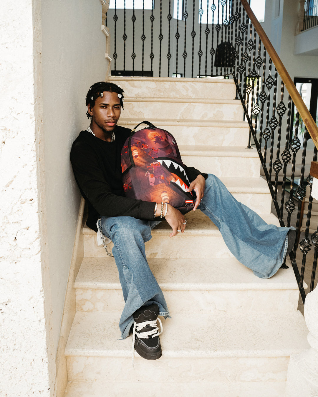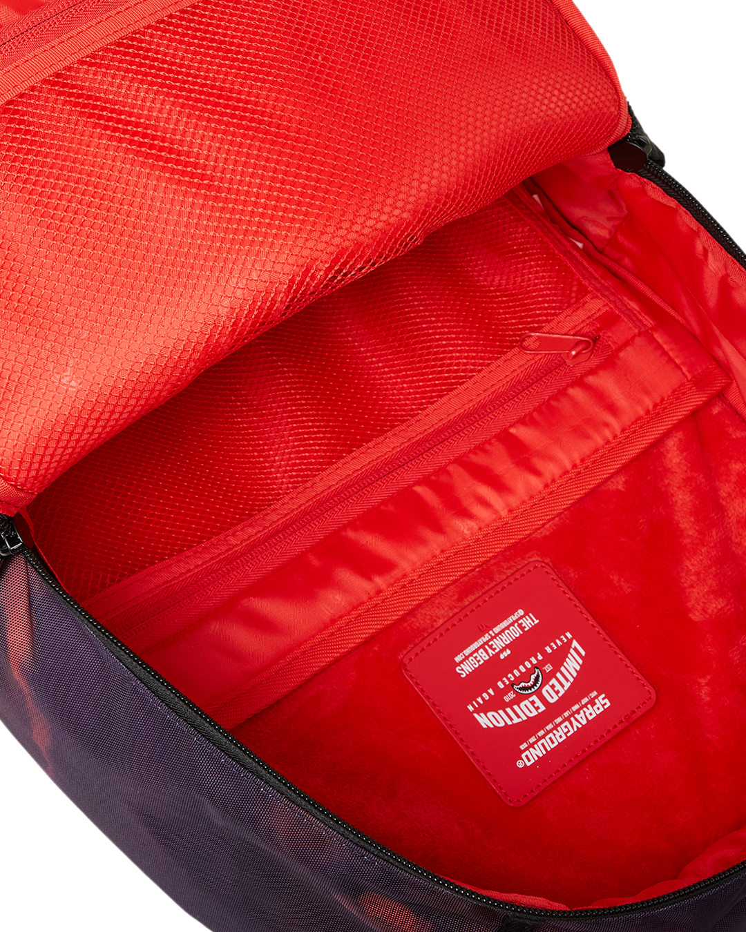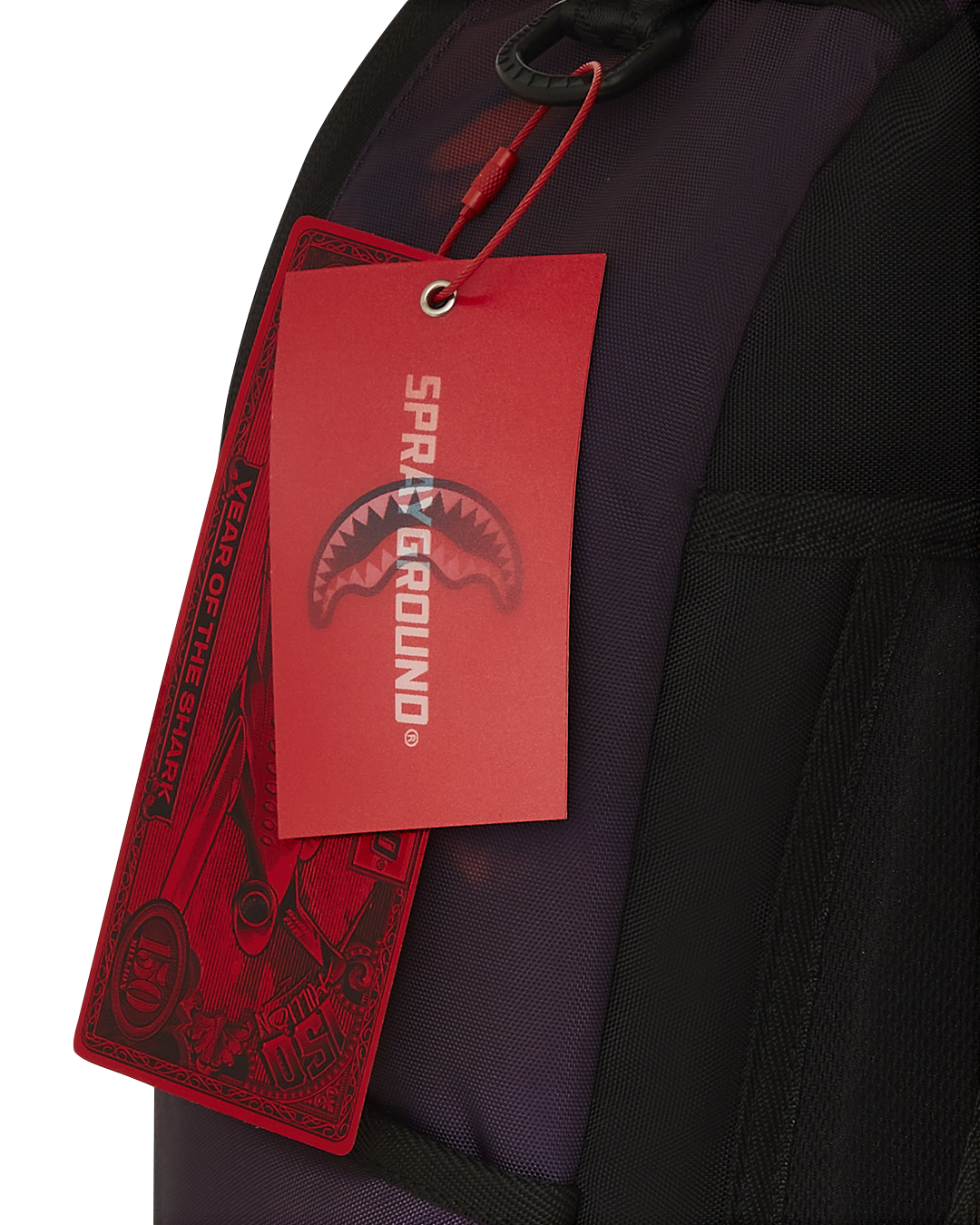 Dimensions: 18' x 6' x 11.5' • Front zipper pocket • Side pockets • Zippered Stash pocket • Separate velour sunglass compartment • Ergonomic mesh back padding • Adjustable Straps for custom sizing • Gold zippers with metal hardware • Metal 'Sprayground Authentic' badge • Slide through back sleeve connects to carry-on luggage to free your hands