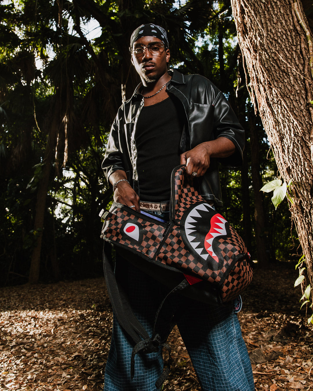Dimensions: 18' x 6' x 11.5' • Front zipper pocket • Side pockets • Zippered Stash pocket • Separate velour sunglass compartment • Ergonomic mesh back padding • Adjustable Straps for custom sizing • Gold zippers with metal hardware • Metal 'Sprayground Authentic' badge • Slide through back sleeve connects to carry-on luggage to free your hands