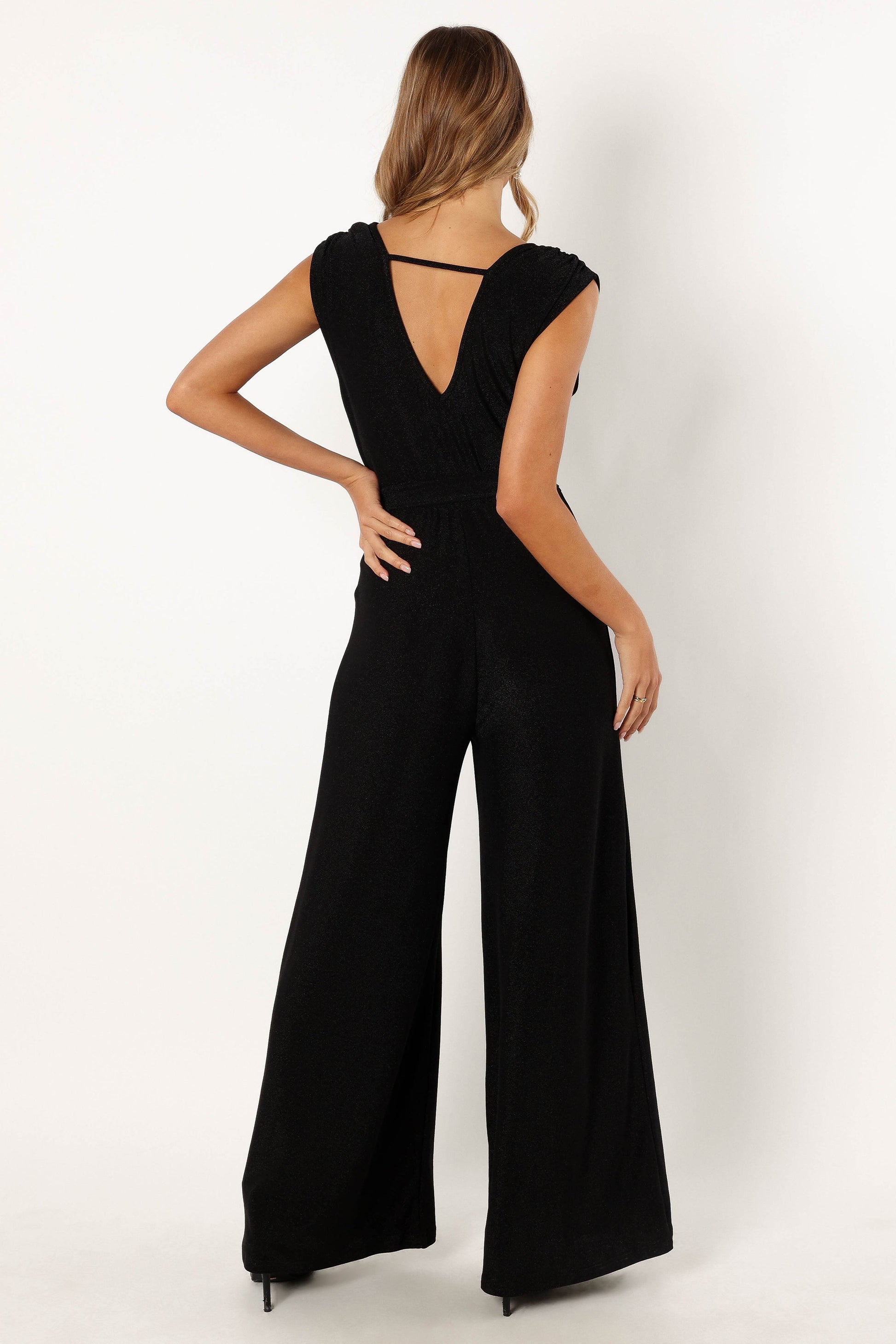 DETAILS Introducing the perfect party jumpsuit! This beautiful sleeveless design is crafted from a luxurious black metallic material, and features an overlay neckline with hook and eye clasp. Additionally, a back v detail adds to its chic style. The wide leg silhouette is complemented by an elasticised waistband and detachable waist tie for extra comfort and versatility.