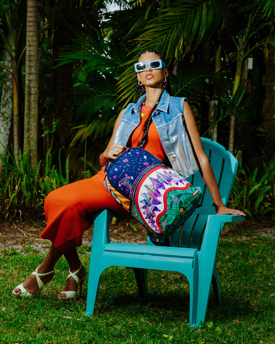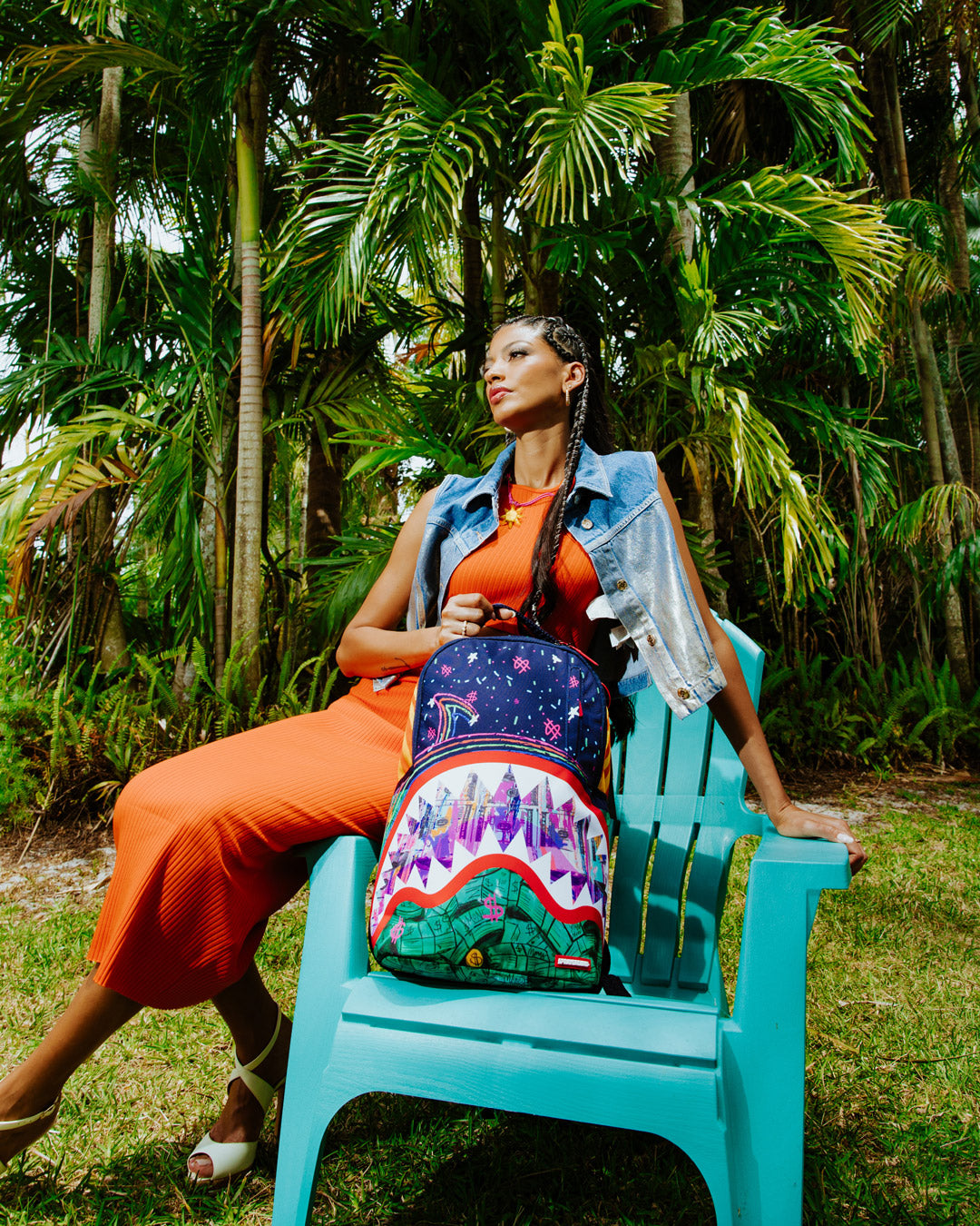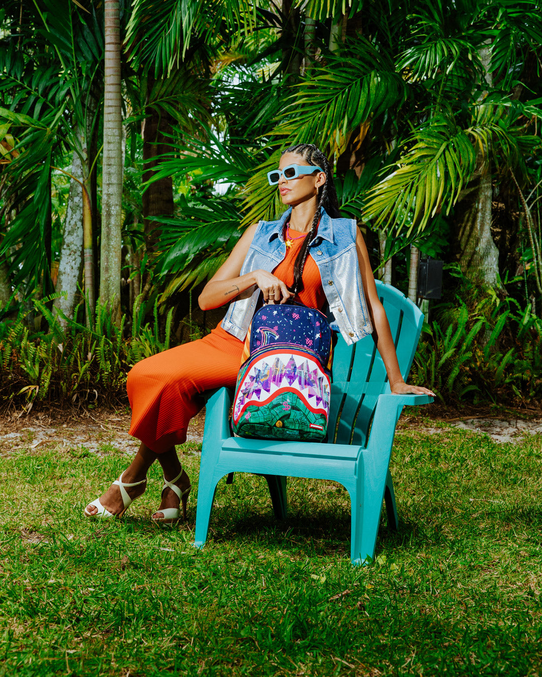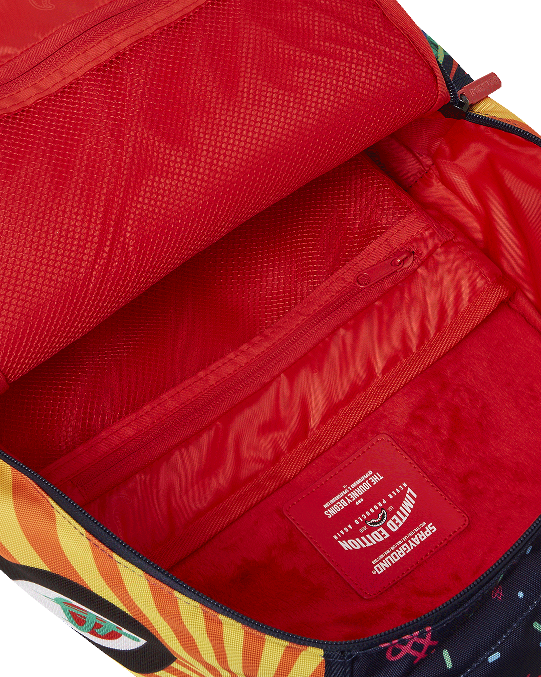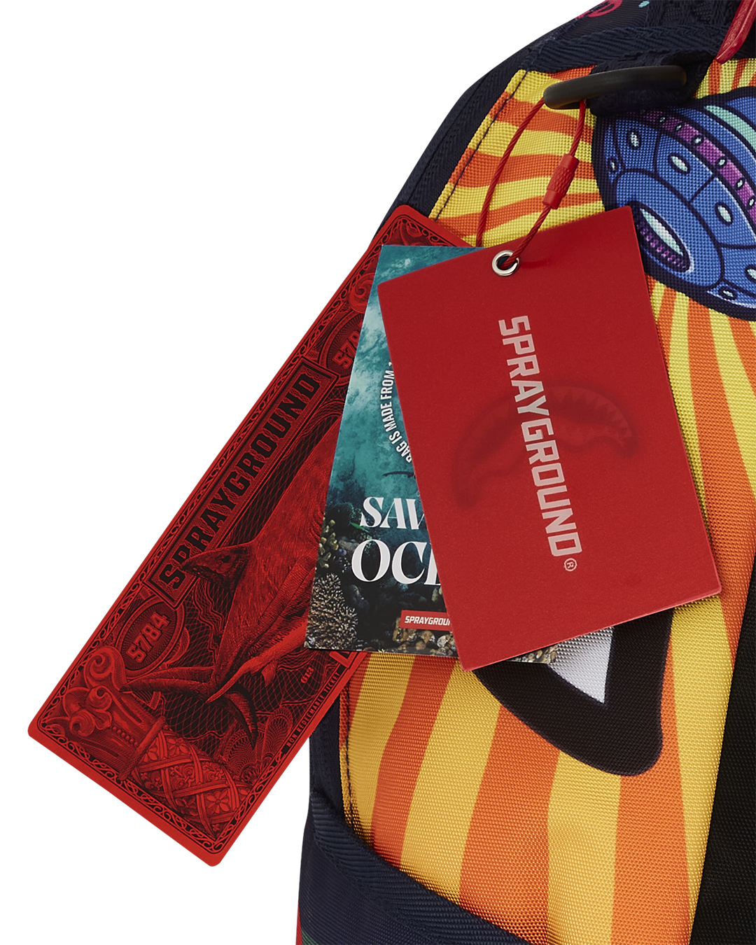 Dimensions: 18' x 6' x 11.5' • Front zipper pocket • Side pockets • Zippered Stash pocket • Separate velour sunglass compartment • Ergonomic mesh back padding • Adjustable Straps for custom sizing • Gold zippers with metal hardware • Metal 'Sprayground Authentic' badge • Slide through back sleeve connects to carry-on luggage to free your hands
