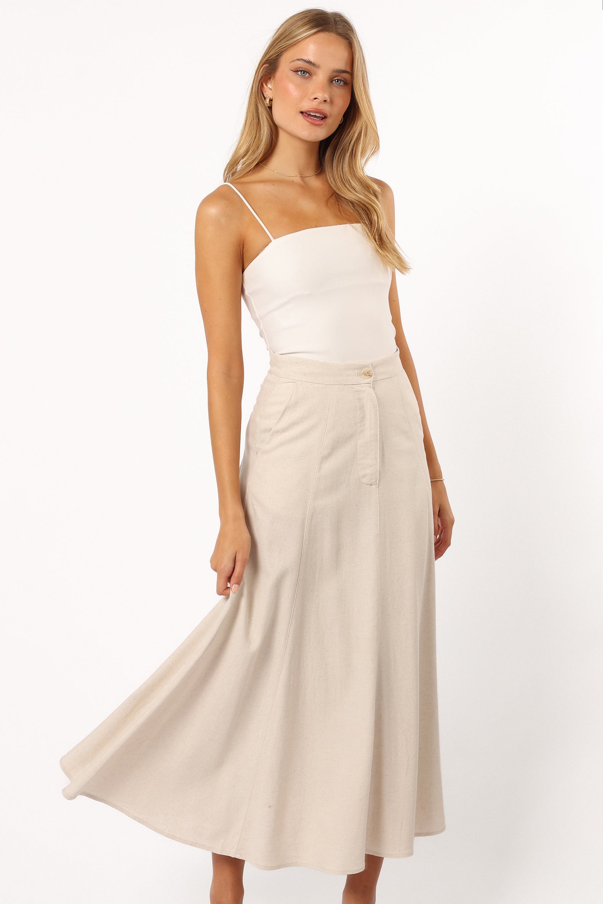 | DETAILS This trendy maxi skirt features a front fly zip with button close for a perfect fit. The a-line design flutters with your every move, whilst the high waist adds comfort and style to your everyday look.