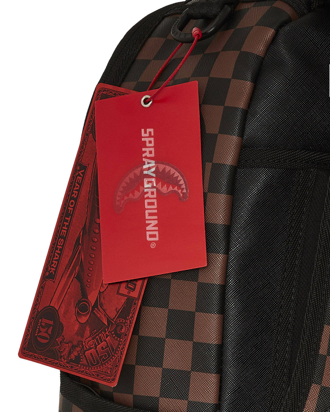 Dimensions: 18' x 6' x 11.5' • Front zipper pocket • Side pockets • Zippered Stash pocket • Separate velour sunglass compartment • Ergonomic mesh back padding • Adjustable Straps for custom sizing • Gold zippers with metal hardware • Metal 'Sprayground Authentic' badge • Slide through back sleeve connects to carry-on luggage to free your hands