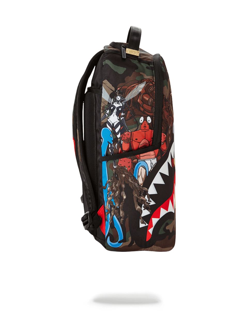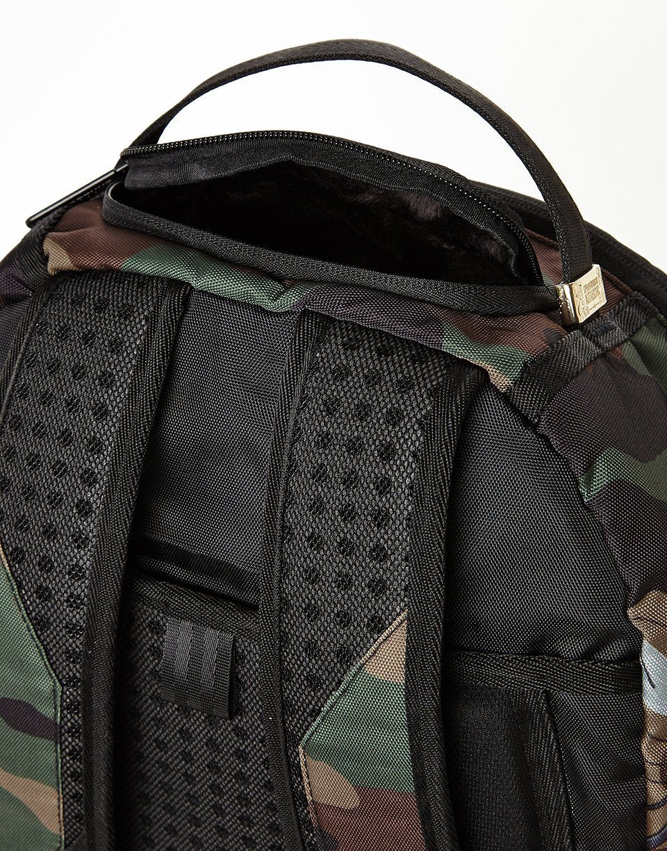 ExteriorDimensions: 18' x 6' x 11.5' • Front zipper pocket • Side pockets • Zippered Stash pocket • Ergonomic mesh back padding • Adjustable Straps for custom sizing • Nylon Zippers with Metal Hardware • Metal 'Sprayground Authentic' badge • Slide through back sleeve connects to Carry on luggage to free your hands