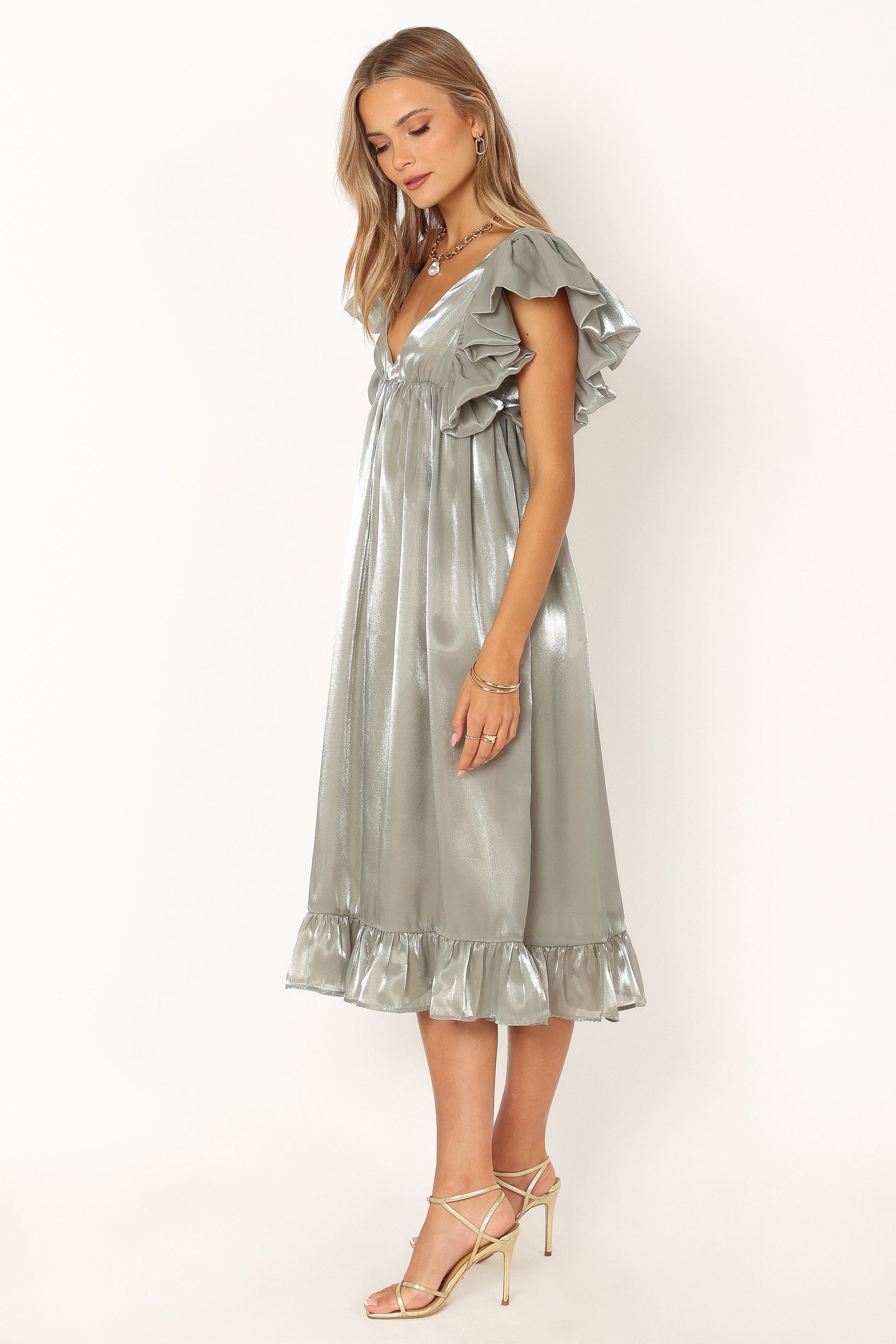 DETAILS Introducing the perfect piece for any special occasion! This maxi dress is made from a luxurious satin sheen material and features an elegant V-neckline, short ruffle sleeves, and a ruffle hem. The back has an invisible zip fastening with hook and eye clasp, as well as a subtle back split that makes it the ideal eventwear.