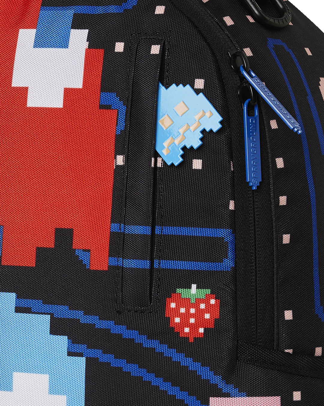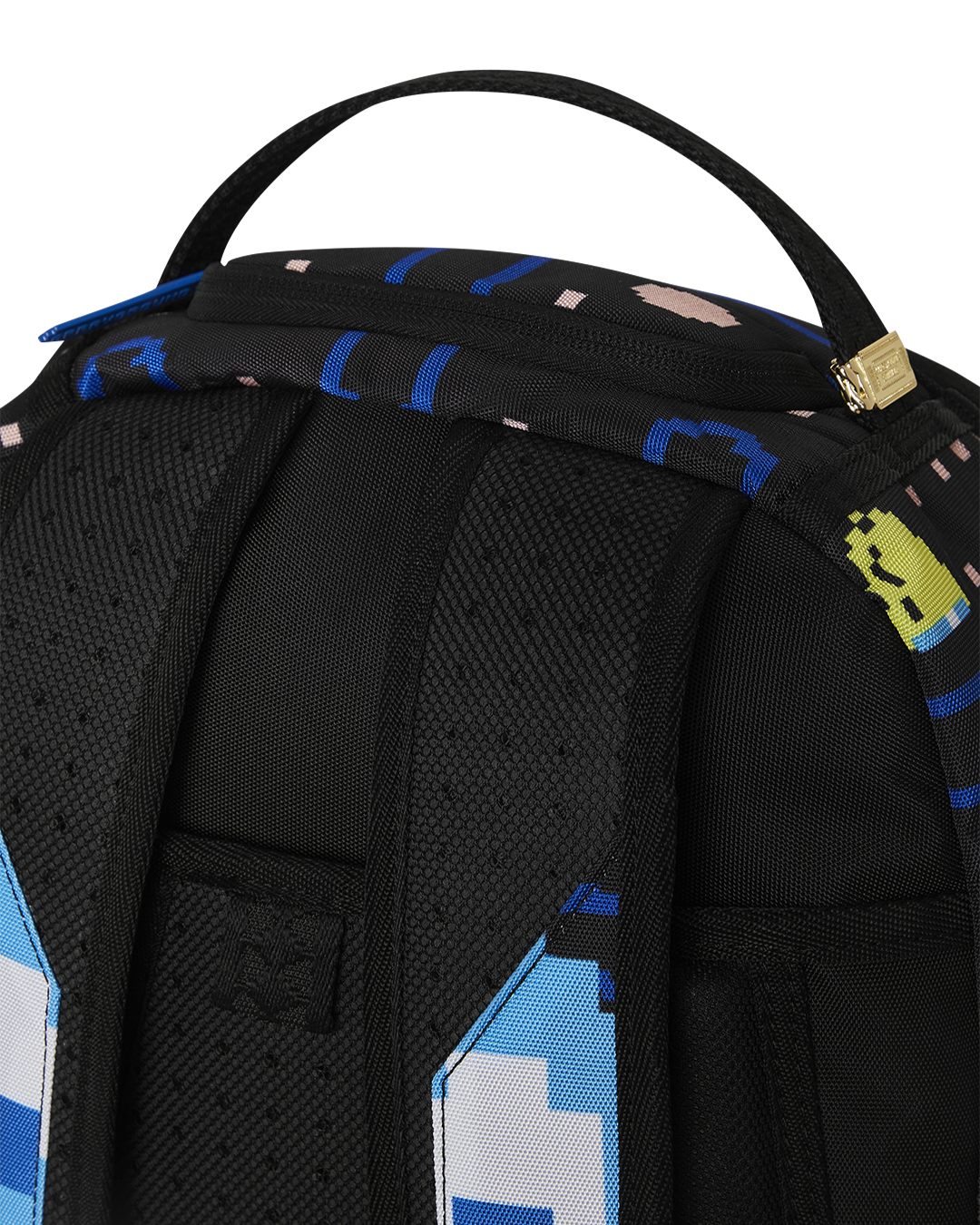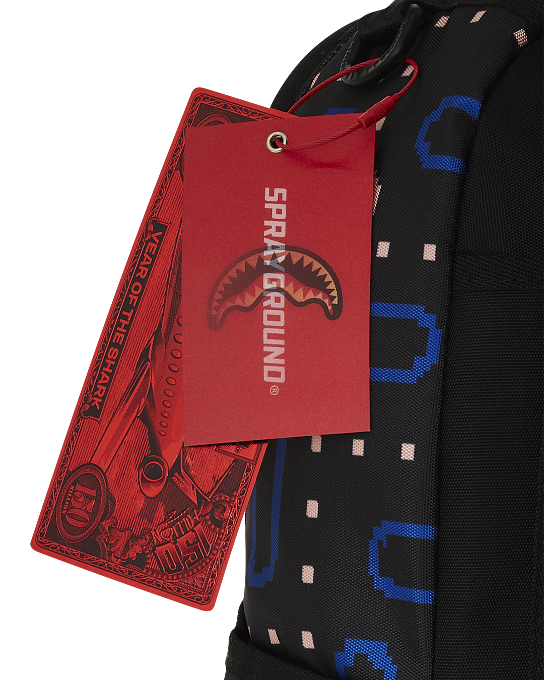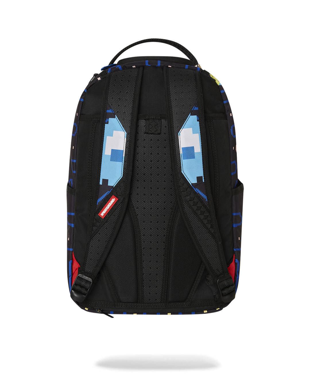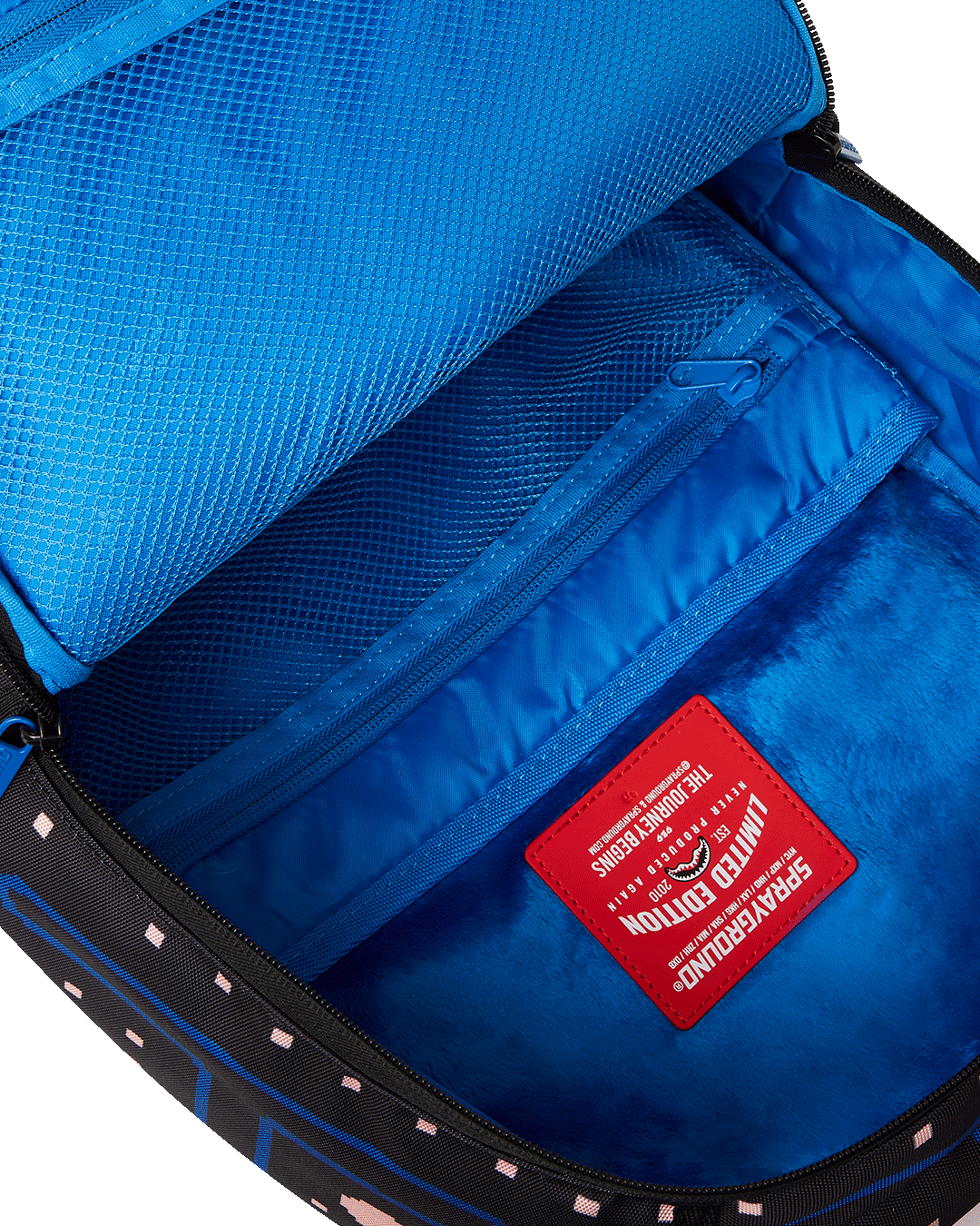 Dimensions: 18' x 6' x 11.5' • Front zipper pocket • Side pockets • Zippered Stash pocket • Separate velour sunglass compartment • Ergonomic mesh back padding • Adjustable Straps for custom sizing • Gold zippers with metal hardware • Metal 'Sprayground Authentic' badge • Slide through back sleeve connects to carry-on luggage to free your hands