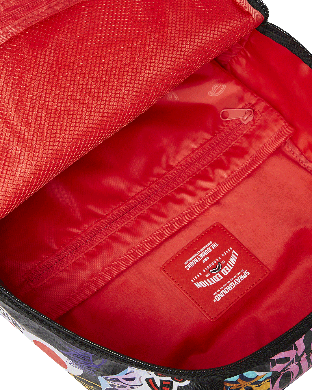 Dimensions: 18' x 6' x 11.5' • Front zipper pocket • Side pockets • Zippered Stash pocket • Separate velour sunglass compartment • Ergonomic mesh back padding • Adjustable Straps for custom sizing • Gold zippers with metal hardware • Metal 'Sprayground Authentic' badge • Slide through back sleeve connects to carry-on luggage to free your hands