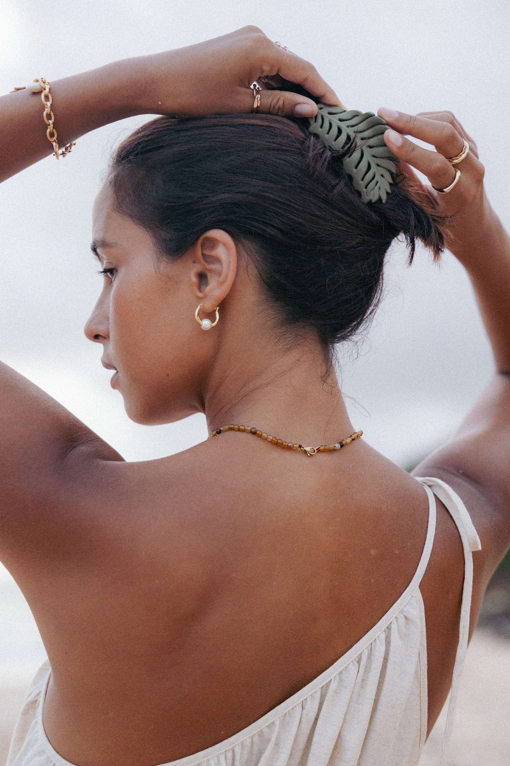 DETAILS Secure your style effortlessly with the Palm Hair Clip in Green, designed to elevate your everyday look with a chic, leaf-inspired design.