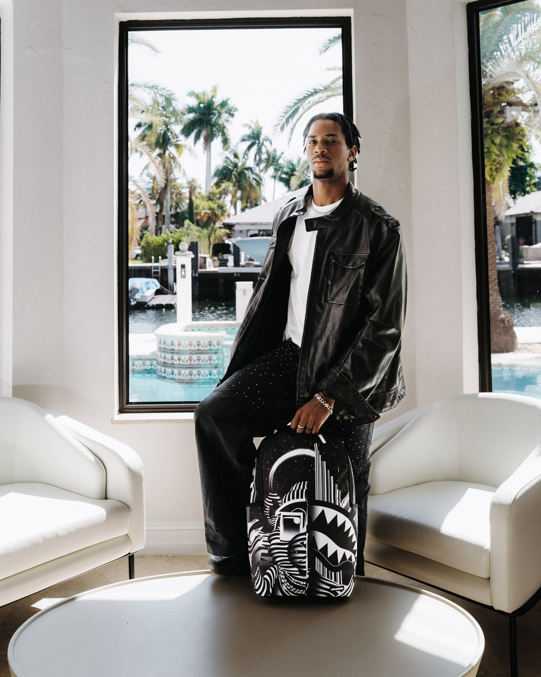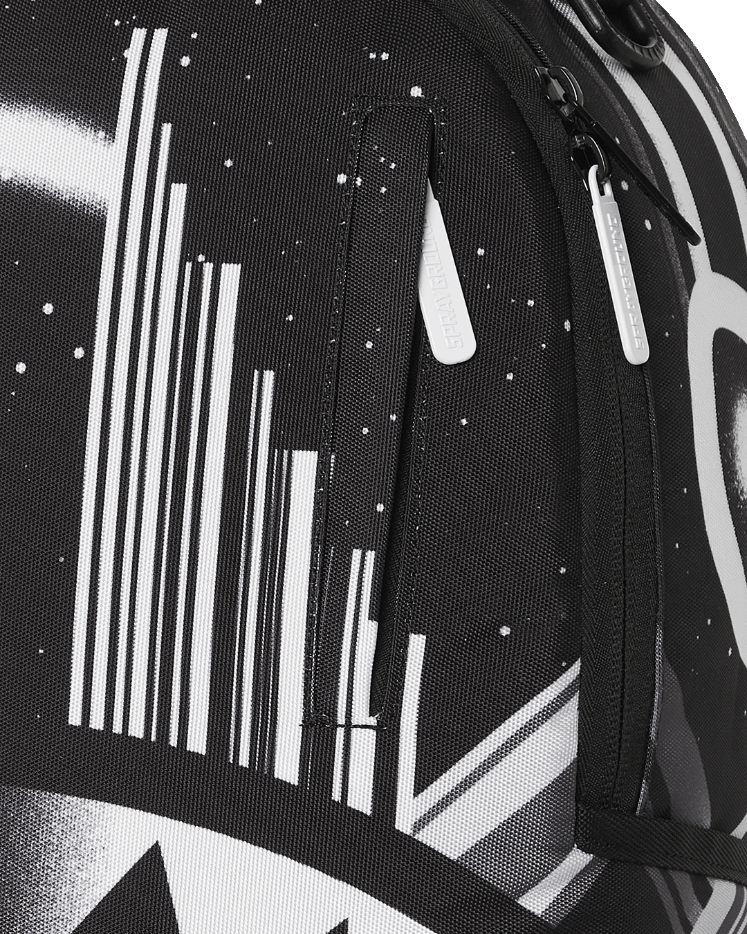 Dimensions: 18' x 6' x 11.5' • Front zipper pocket • Side pockets • Zippered Stash pocket • Separate velour sunglass compartment • Ergonomic mesh back padding • Adjustable Straps for custom sizing • Gold zippers with metal hardware • Metal 'Sprayground Authentic' badge • Slide through back sleeve connects to carry-on luggage to free your hands