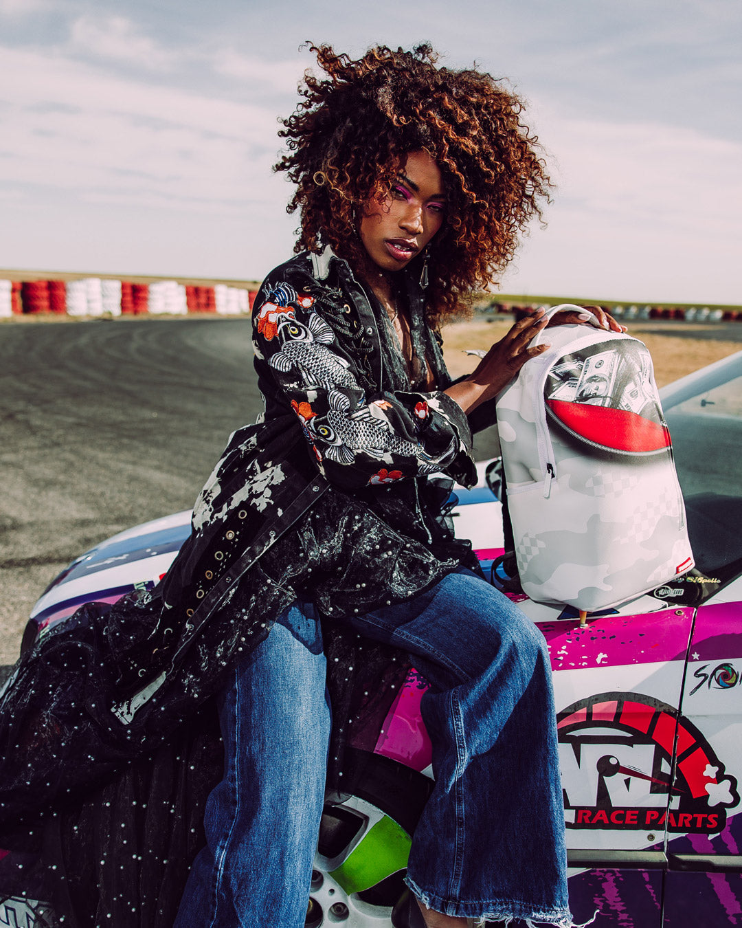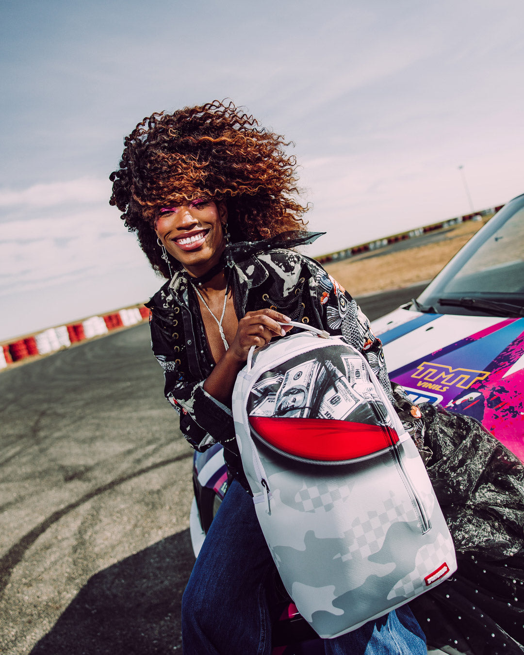Dimensions: 18' x 6' x 11.5' • Front zipper pocket • Side pockets • Zippered Stash pocket • Separate velour sunglass compartment • Ergonomic mesh back padding • Adjustable Straps for custom sizing • Gold zippers with metal hardware • Metal 'Sprayground Authentic' badge • Slide through back sleeve connects to carry-on luggage to free your hands