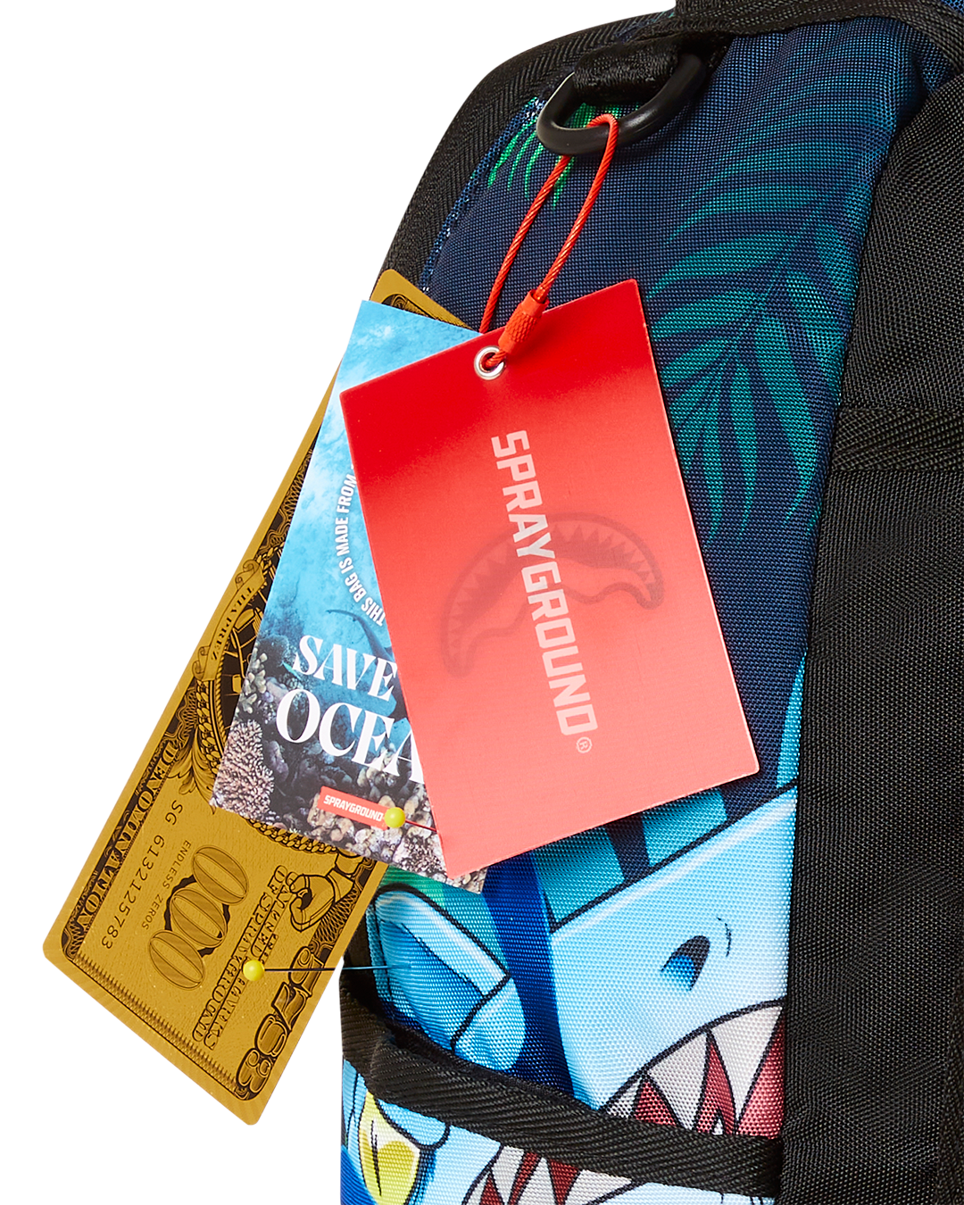 Dimensions: 18' x 6' x 11.5' • Front zipper pocket • Side pockets • Zippered Stash pocket • Separate velour sunglass compartment • Ergonomic mesh back padding • Adjustable Straps for custom sizing • Gold zippers with metal hardware • Metal 'Sprayground Authentic' badge • Slide through back sleeve connects to carry-on luggage to free your hands