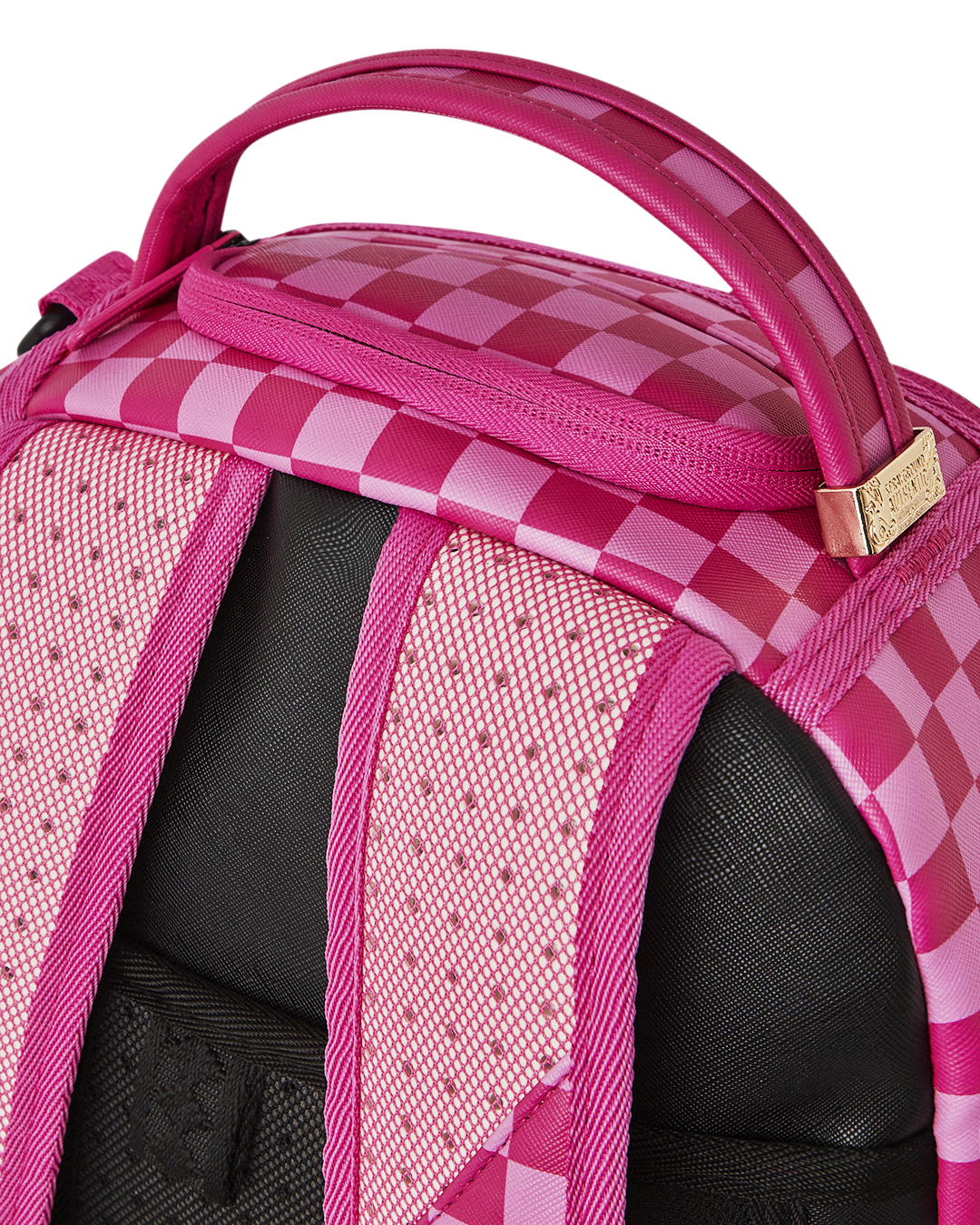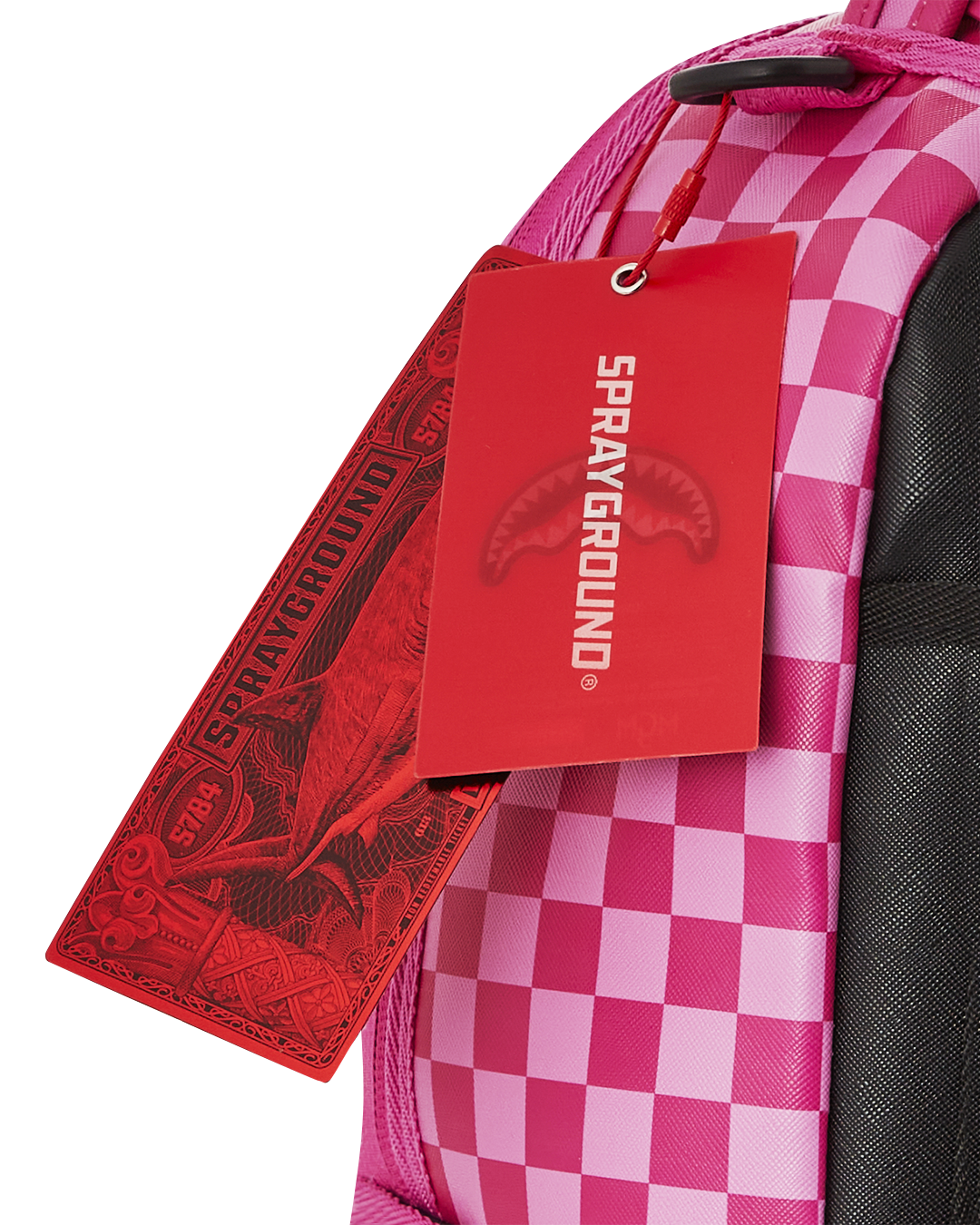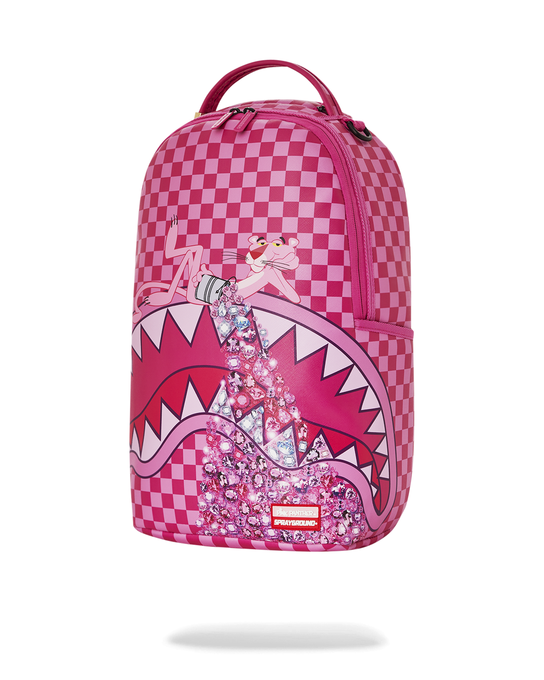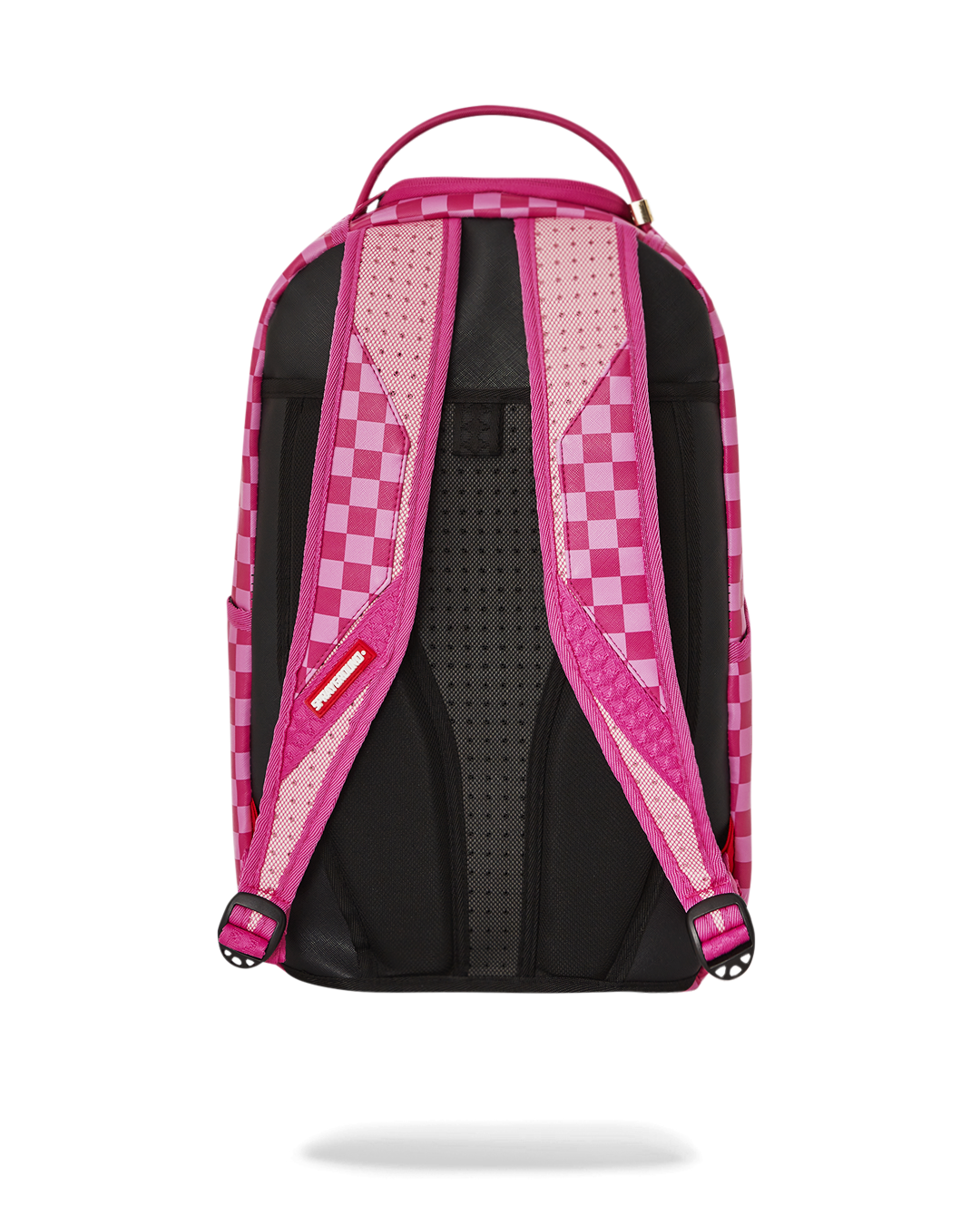 Dimensions: 18' x 6' x 11.5' • Front zipper pocket • Side pockets • Zippered Stash pocket • Separate velour sunglass compartment • Ergonomic mesh back padding • Adjustable Straps for custom sizing • Gold zippers with metal hardware • Metal 'Sprayground Authentic' badge • Slide through back sleeve connects to carry-on luggage to free your hands