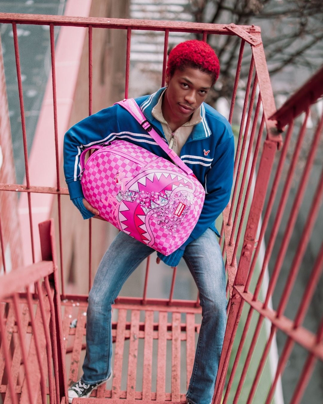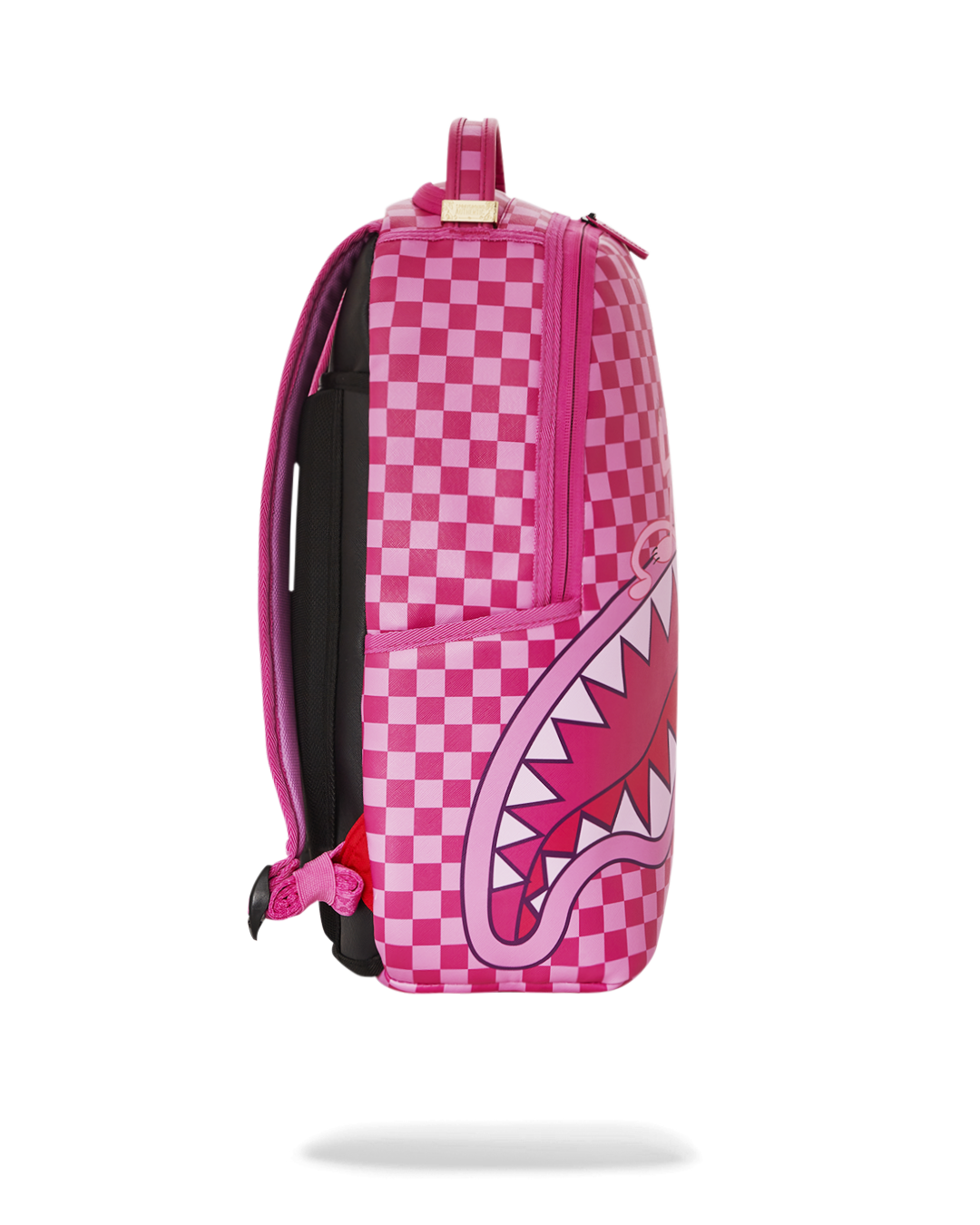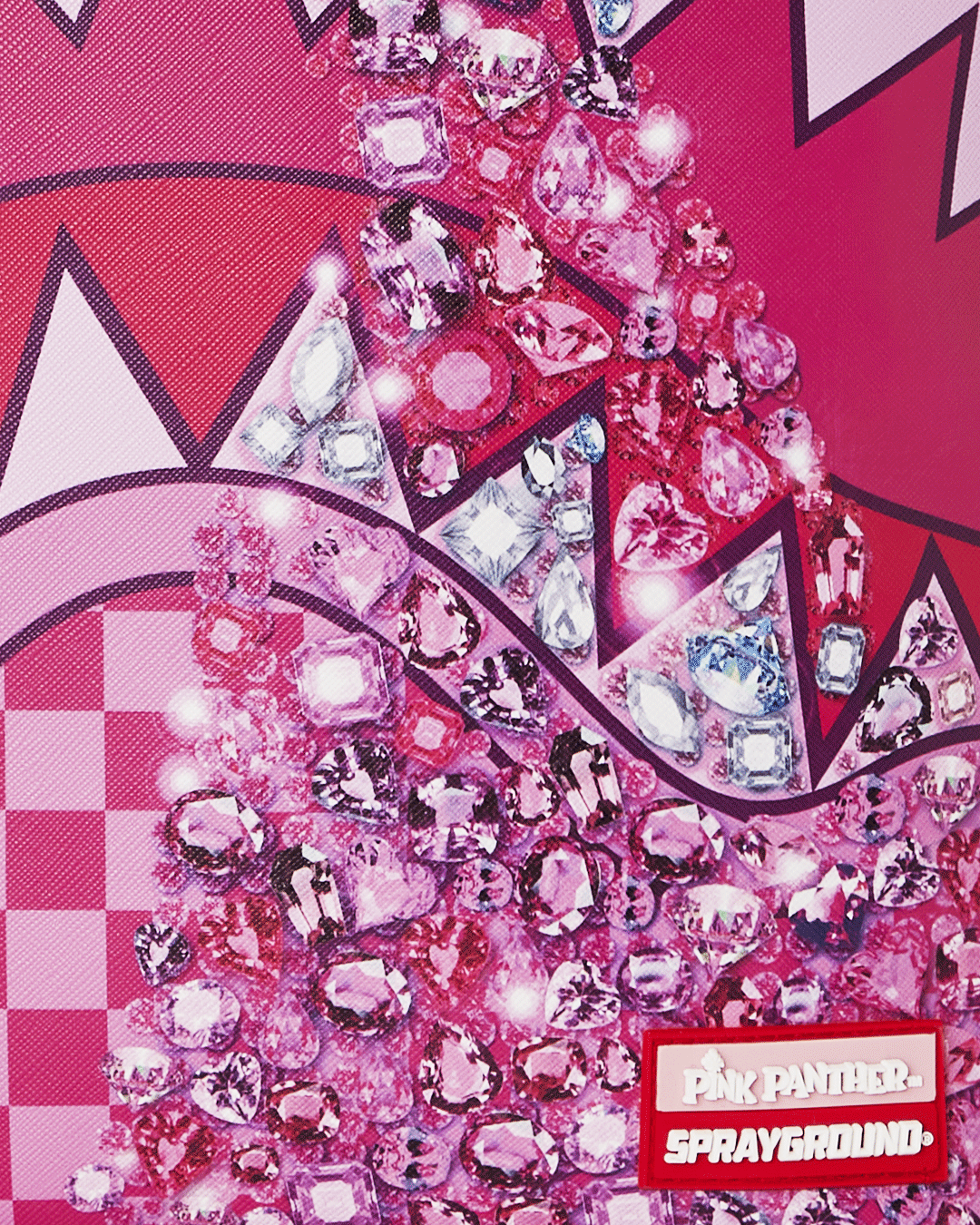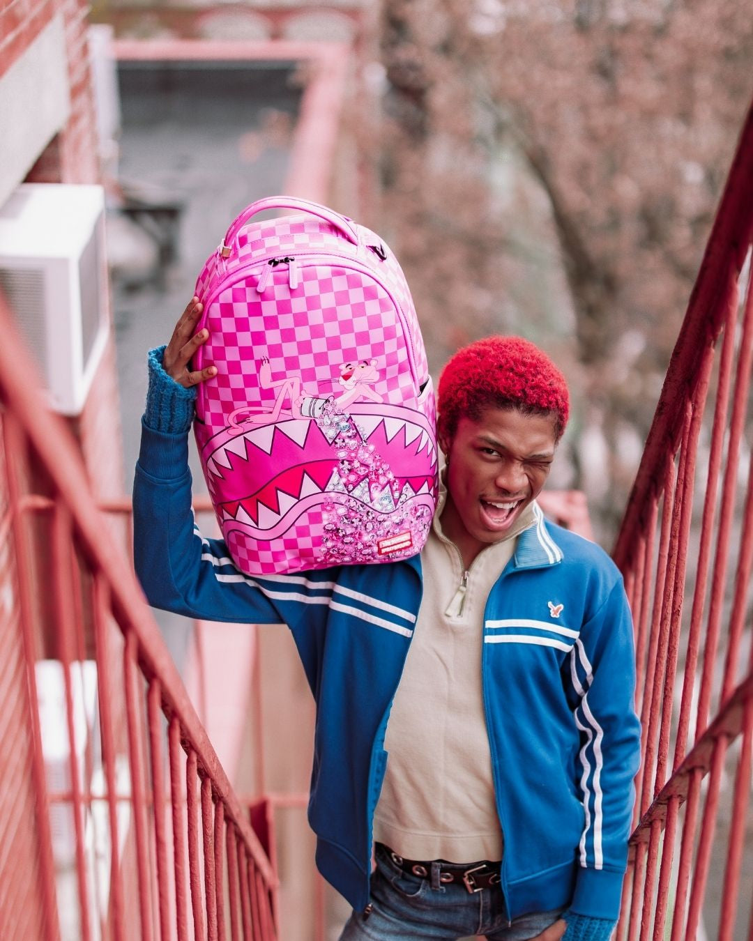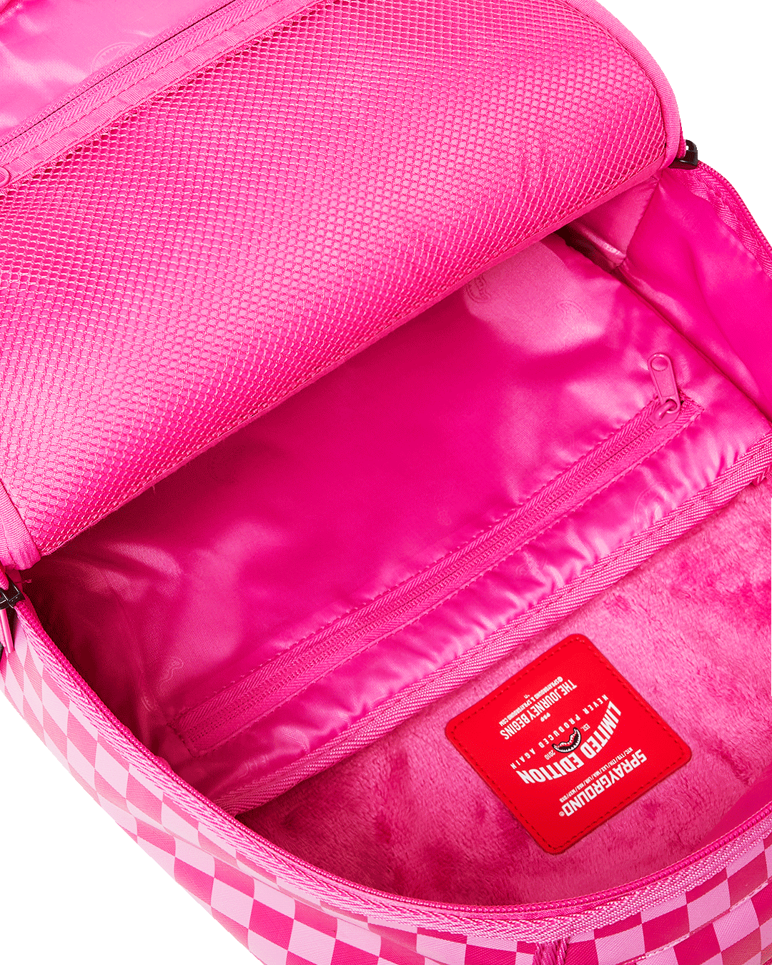 Dimensions: 18' x 6' x 11.5' • Front zipper pocket • Side pockets • Zippered Stash pocket • Separate velour sunglass compartment • Ergonomic mesh back padding • Adjustable Straps for custom sizing • Gold zippers with metal hardware • Metal 'Sprayground Authentic' badge • Slide through back sleeve connects to carry-on luggage to free your hands