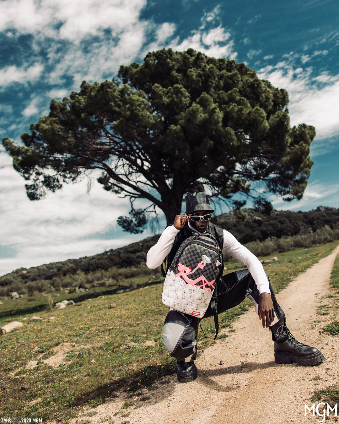 Dimensions: 18' x 6' x 11.5' • Front zipper pocket • Side pockets • Zippered Stash pocket • Separate velour sunglass compartment • Ergonomic mesh back padding • Adjustable Straps for custom sizing • Gold zippers with metal hardware • Metal 'Sprayground Authentic' badge • Slide through back sleeve connects to carry-on luggage to free your hands