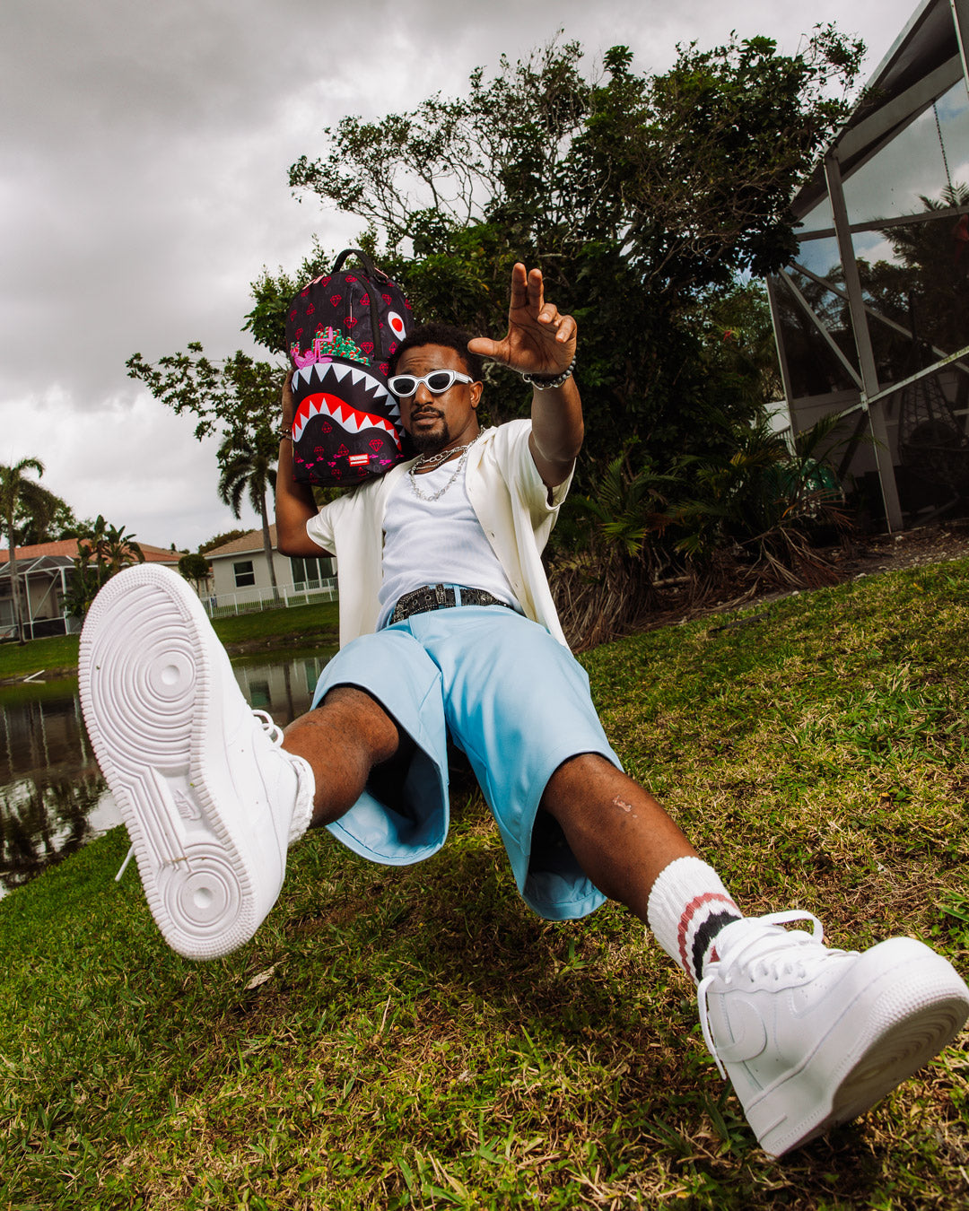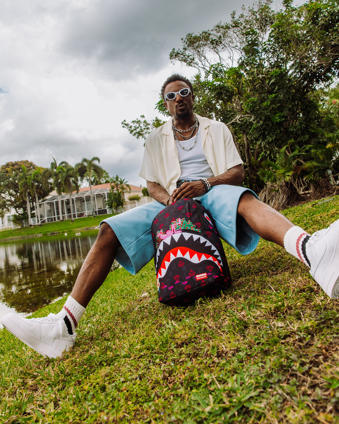 Dimensions: 18' x 6' x 11.5' • Front zipper pocket • Side pockets • Zippered Stash pocket • Separate velour sunglass compartment • Ergonomic mesh back padding • Adjustable Straps for custom sizing • Gold zippers with metal hardware • Metal 'Sprayground Authentic' badge • Slide through back sleeve connects to carry-on luggage to free your hands