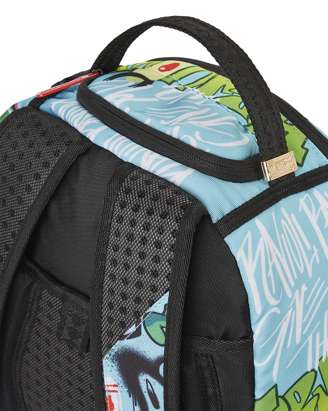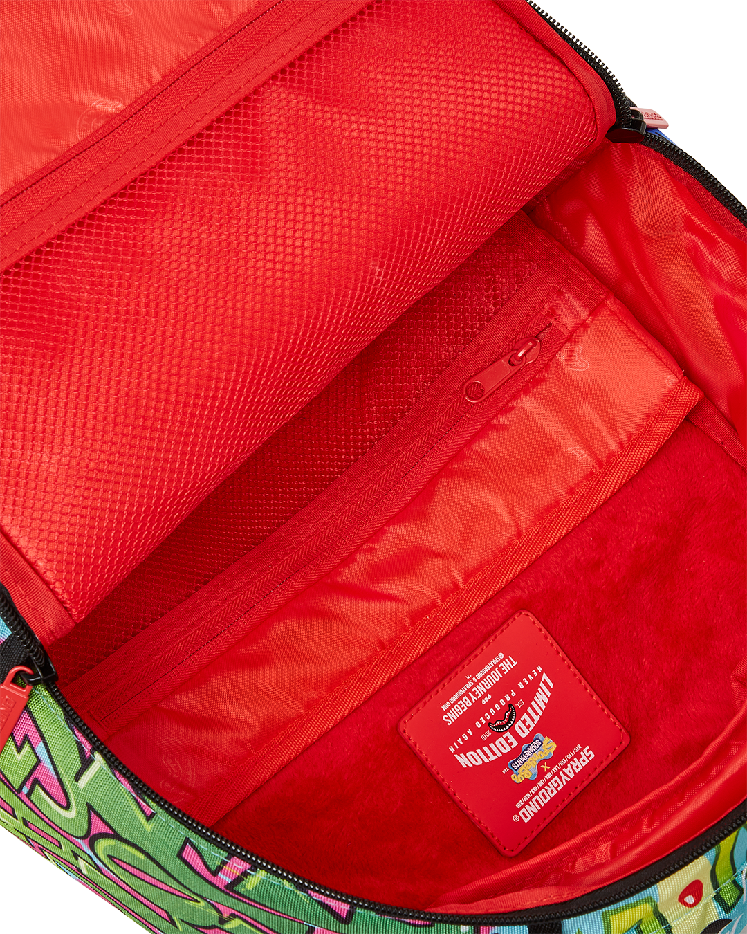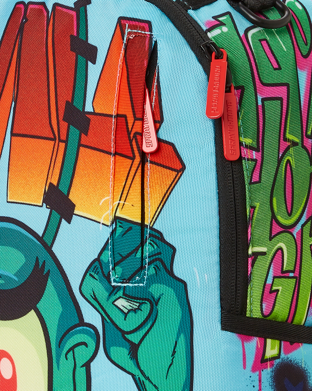 ExteriorDimensions: 18' x 6' x 11.5' • Front zipper pocket • Side pockets • Zippered Stash pocket • Separate velour sunglass compartment • Ergonomic mesh back padding • Adjustable Straps for custom sizing • Green zippers with metal hardware • Metal 'Sprayground Authentic' badge • Slide through back sleeve connects to carry on luggage to free your hands
