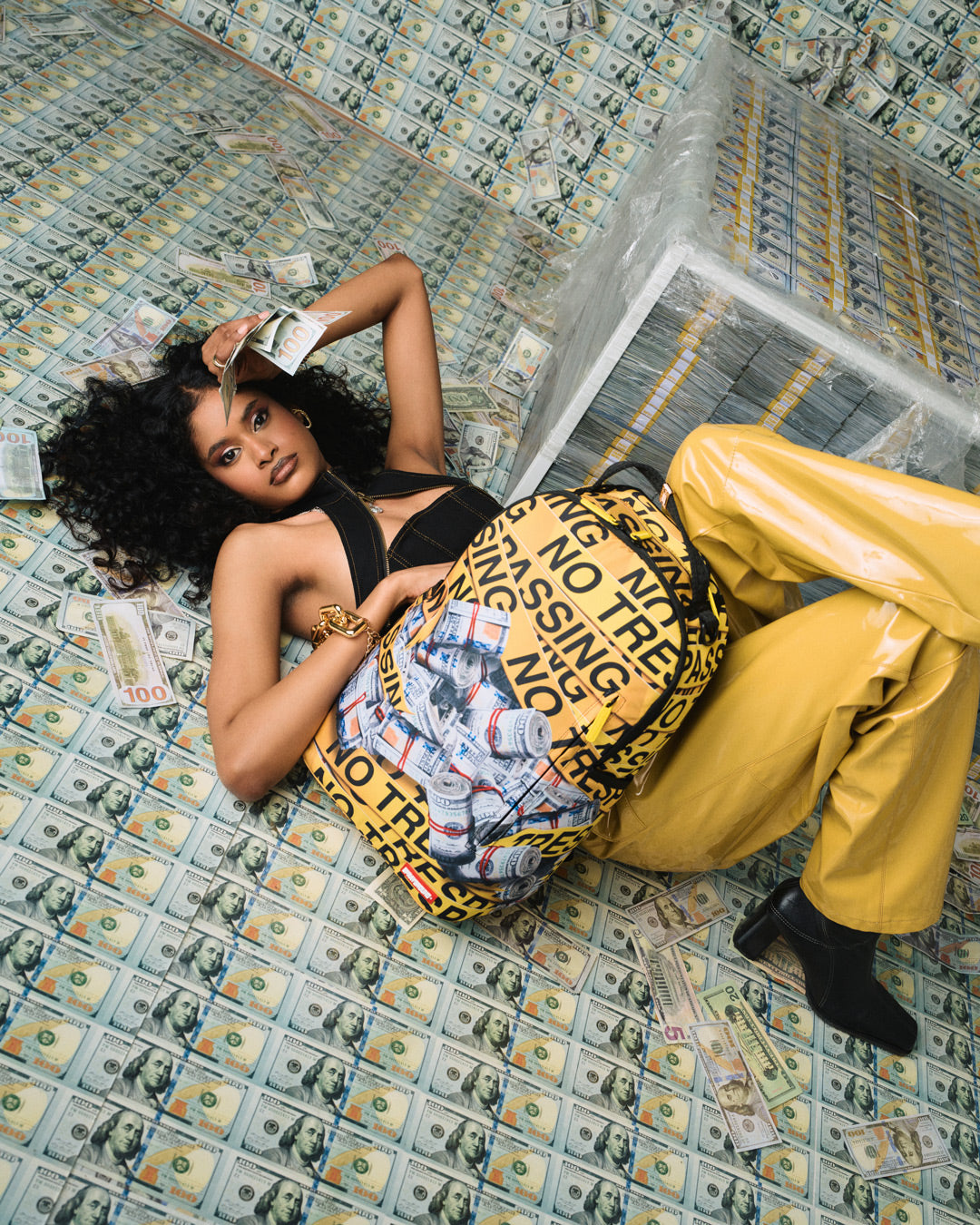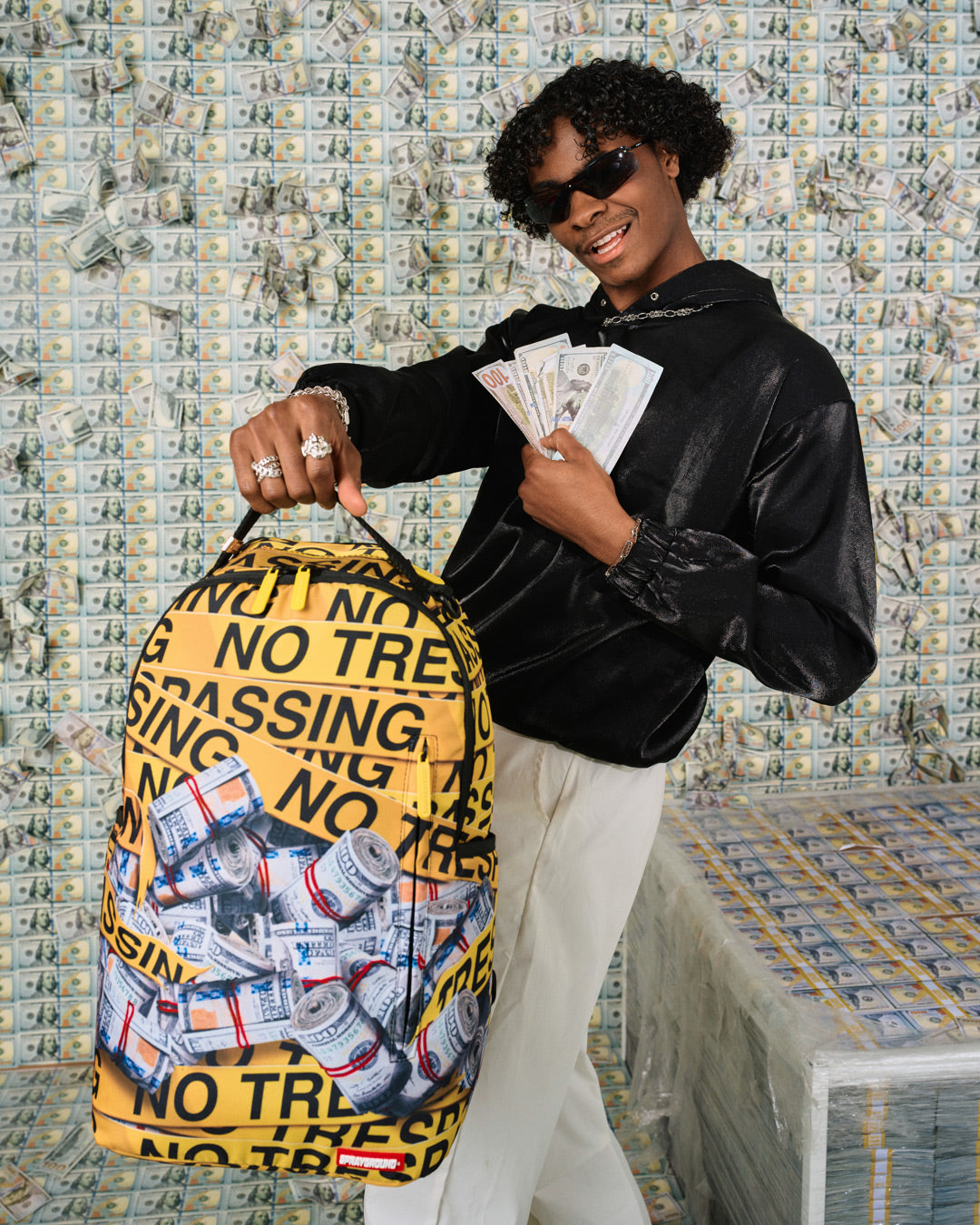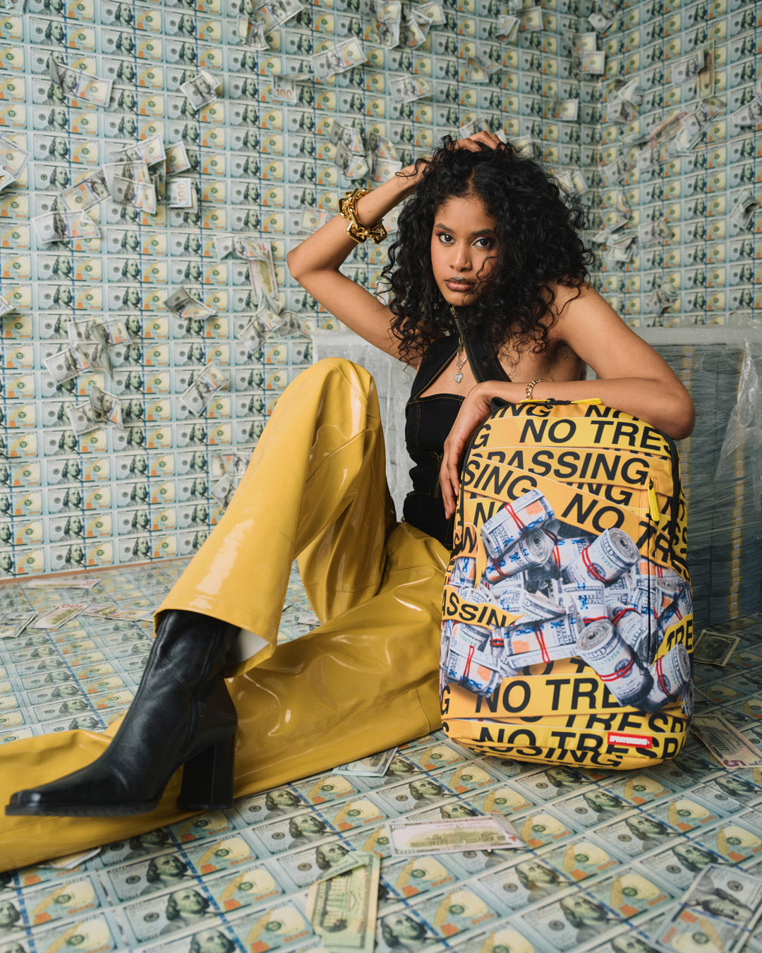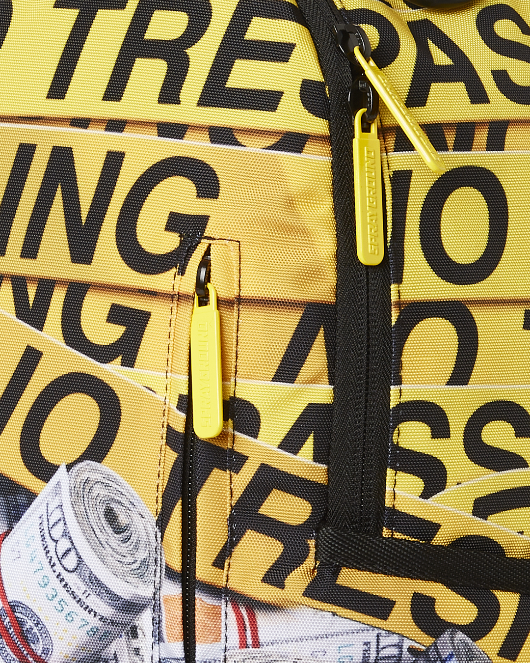 Dimensions: 18' x 6' x 11.5' • Front zipper pocket • Side pockets • Zippered Stash pocket • Separate velour sunglass compartment • Ergonomic mesh back padding • Adjustable Straps for custom sizing • Gold zippers with metal hardware • Metal 'Sprayground Authentic' badge • Slide through back sleeve connects to carry-on luggage to free your hands