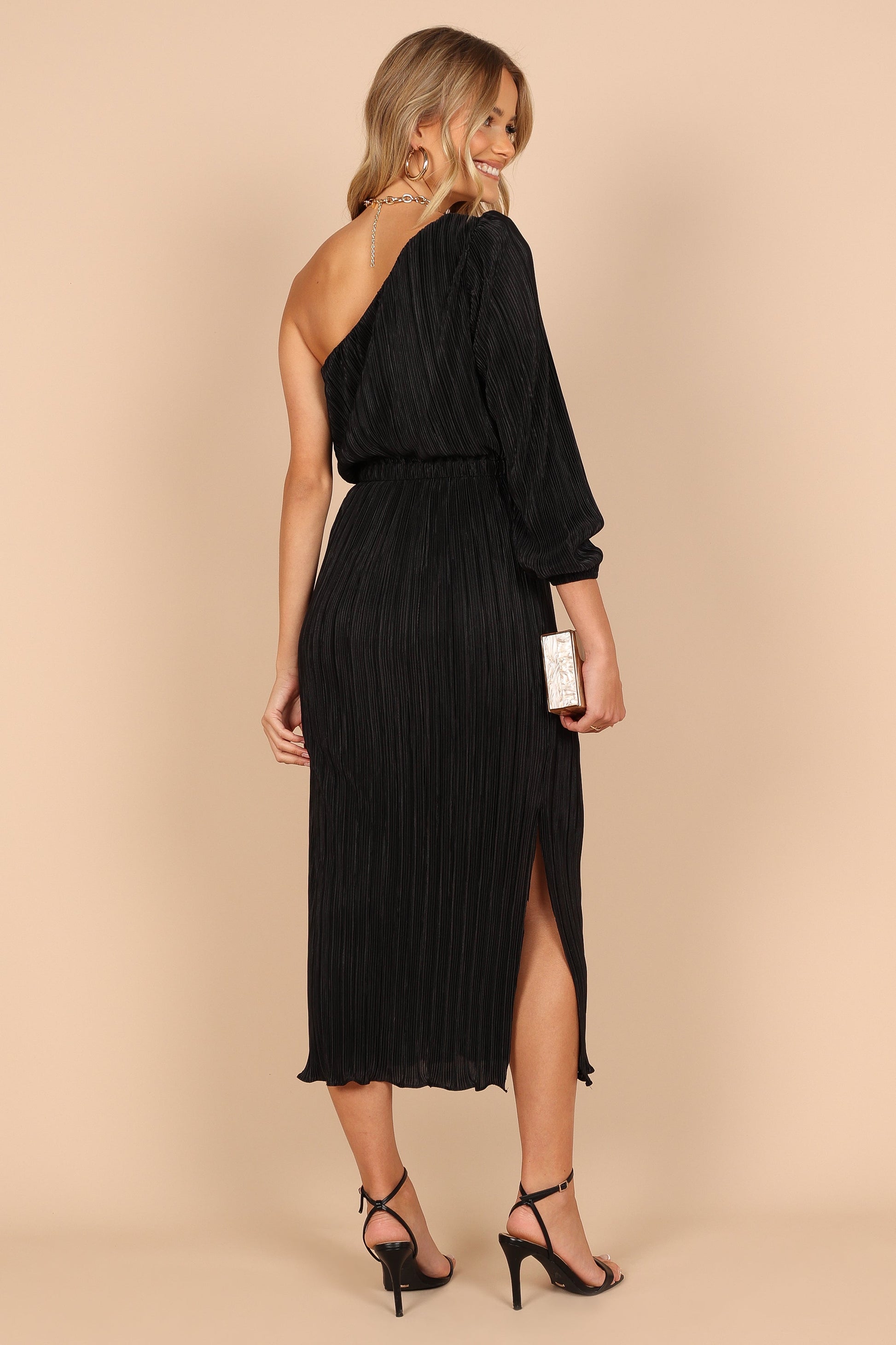 DETAILS Choose a one shoulder style dress for the perfect balance of flirty and elegant. This midi length dress has an asymmetric neckline that's sure to make a statement, while long sleeve with elasticised cuff adds drama to your silhouette. If you are in between sizes, we suggest selecting the size down due to the relaxed fit of this dress.
