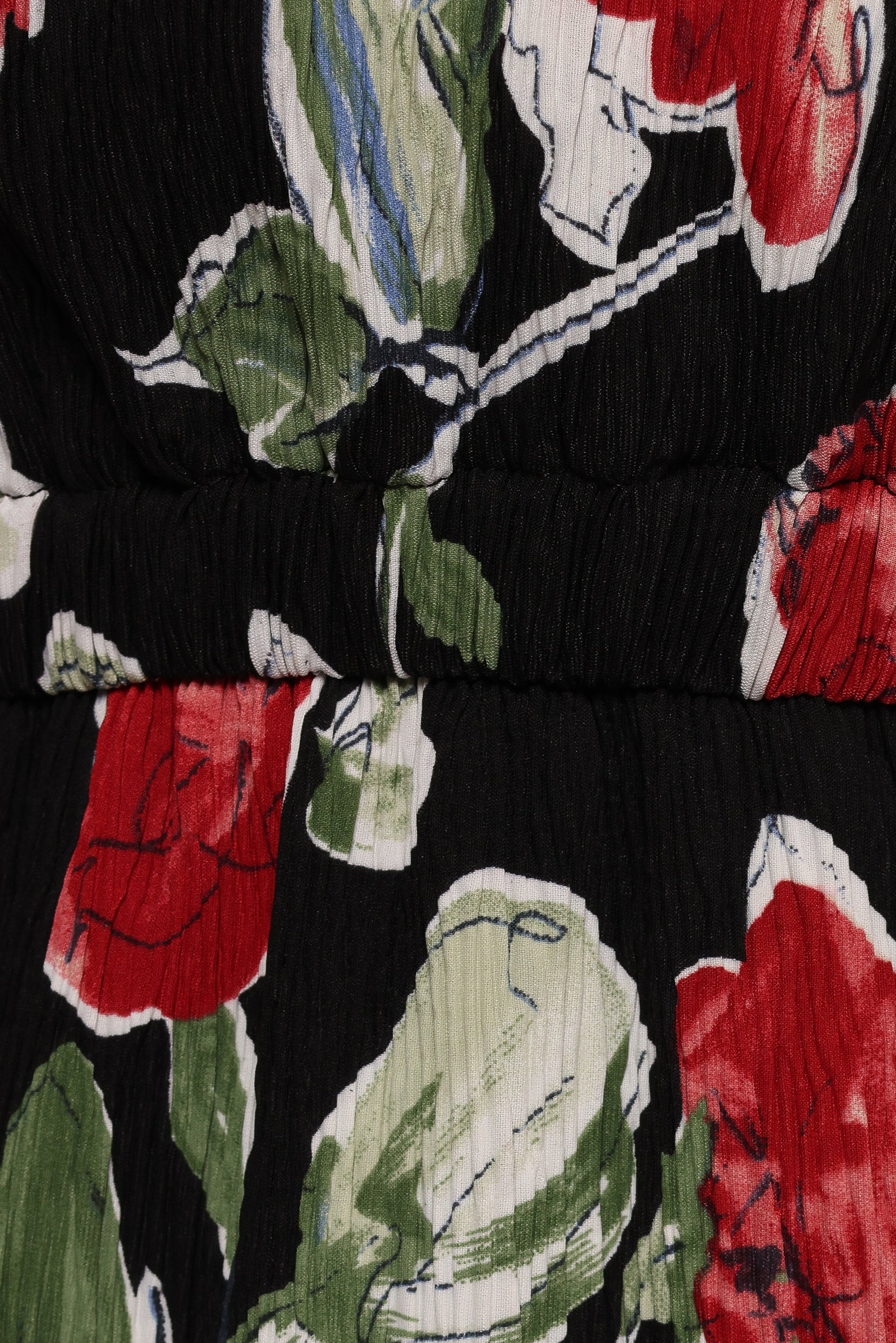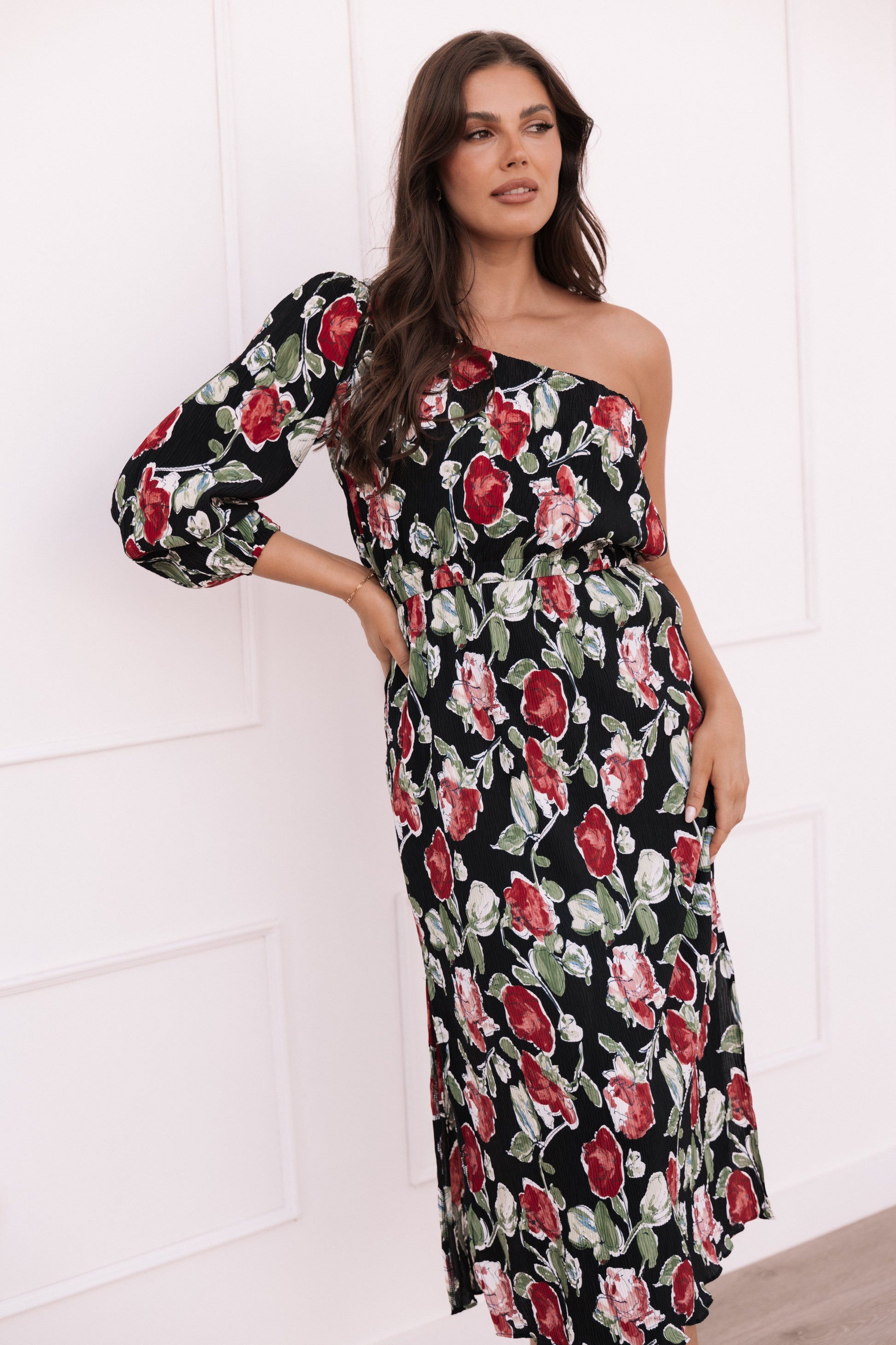 Pontee One Shoulder Pleated Midi Dress - Black Rose Print