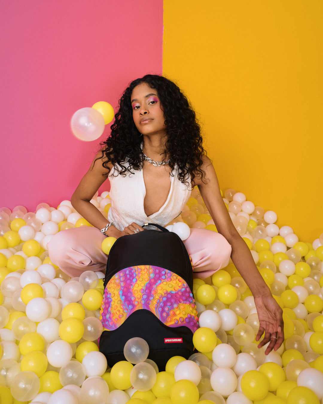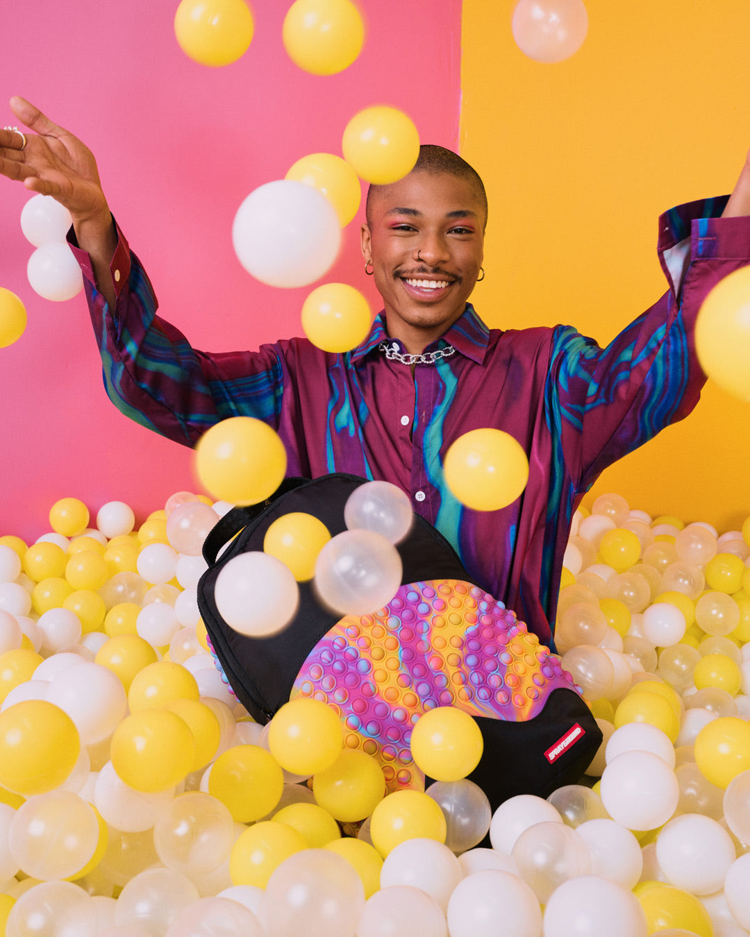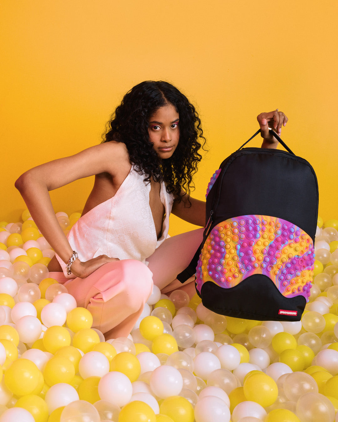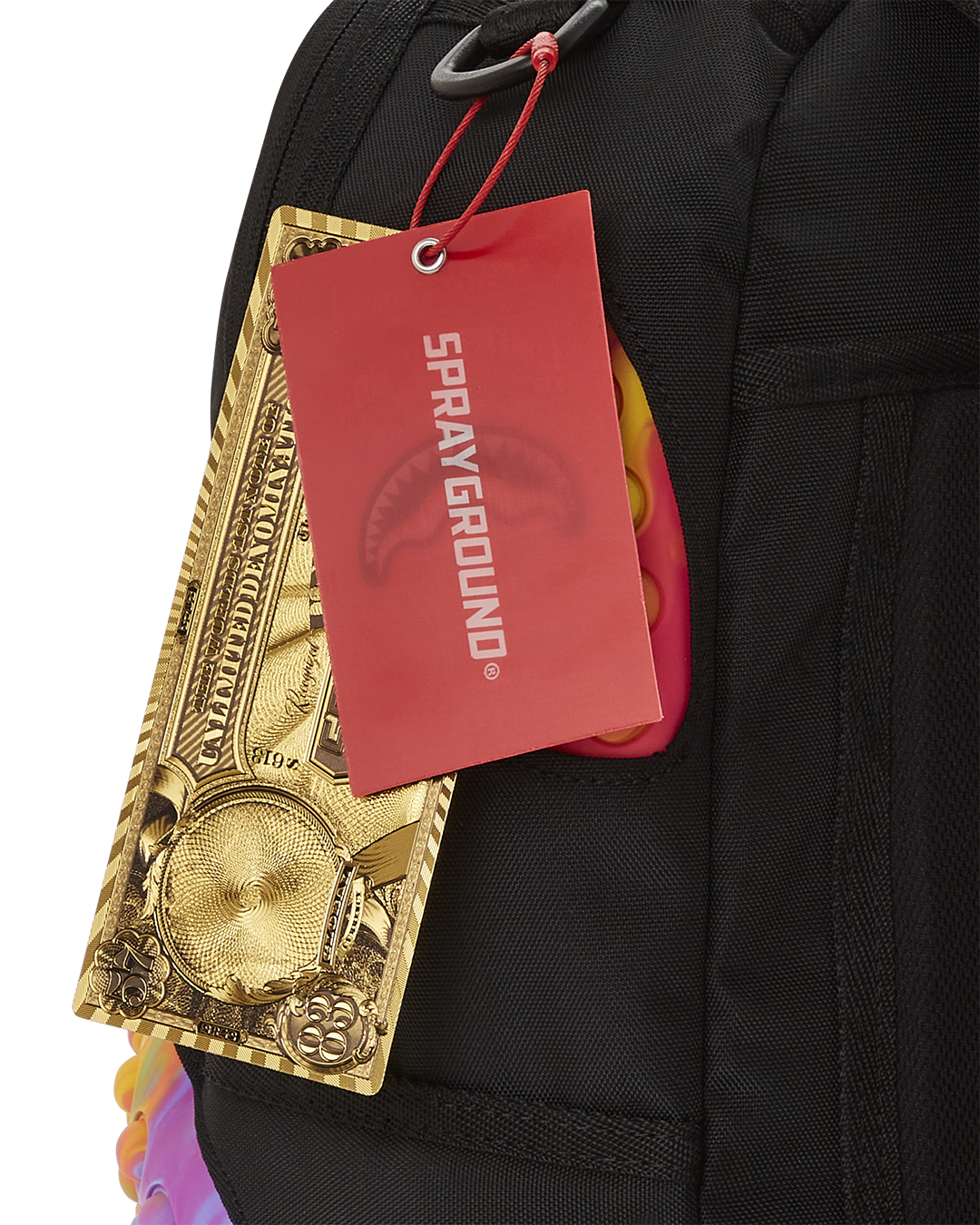 Dimensions: 18' x 6' x 11.5' • Front zipper pocket • Side pockets • Zippered Stash pocket • Separate velour sunglass compartment • Ergonomic mesh back padding • Adjustable Straps for custom sizing • Gold zippers with metal hardware • Metal 'Sprayground Authentic' badge • Slide through back sleeve connects to carry-on luggage to free your hands