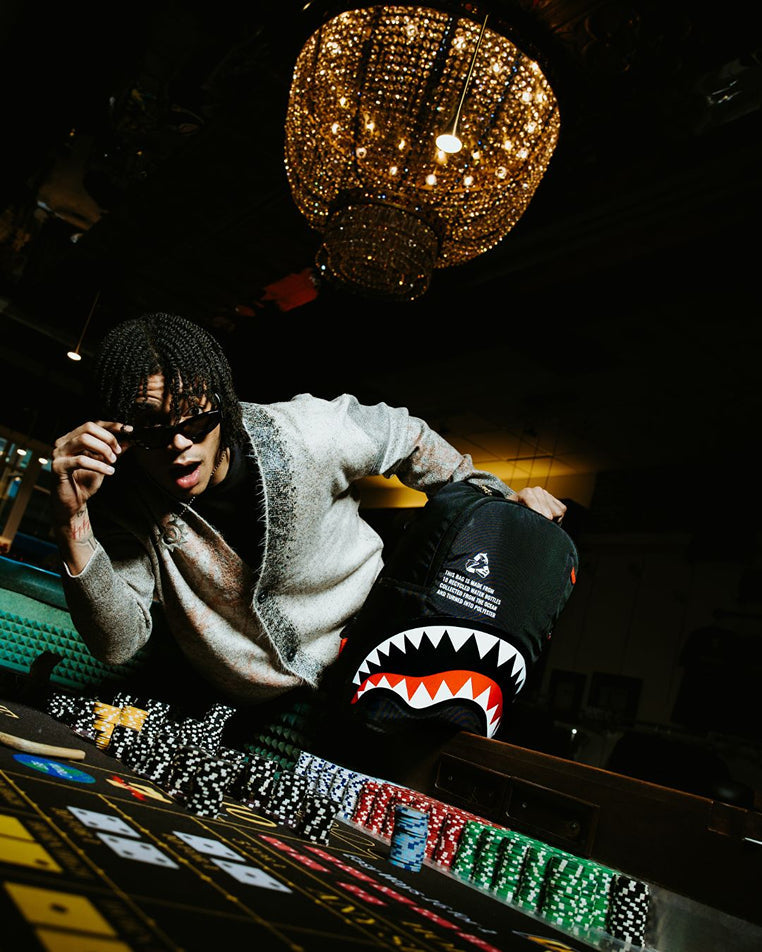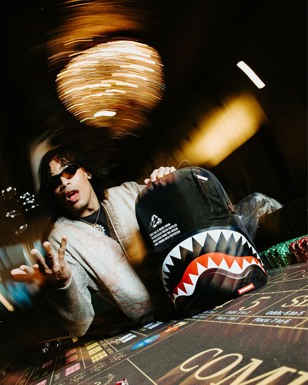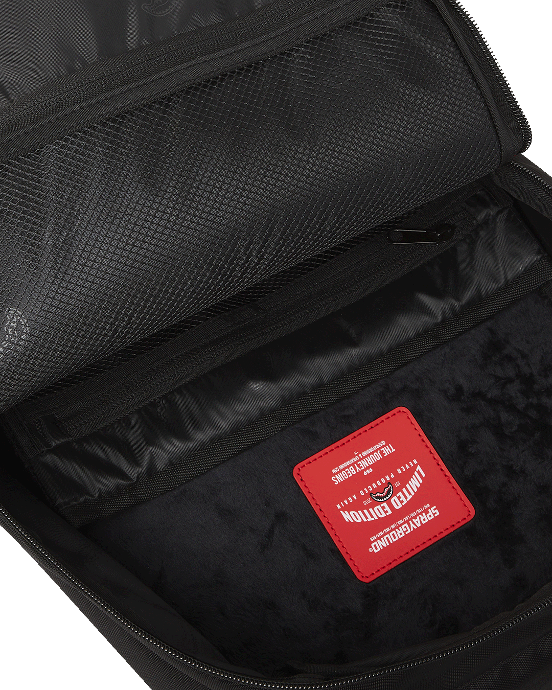 Dimensions: 18' x 6' x 11.5' • Front zipper pocket • Side pockets • Zippered Stash pocket • Separate velour sunglass compartment • Ergonomic mesh back padding • Adjustable Straps for custom sizing • Gold zippers with metal hardware • Metal 'Sprayground Authentic' badge • Slide through back sleeve connects to carry-on luggage to free your hands