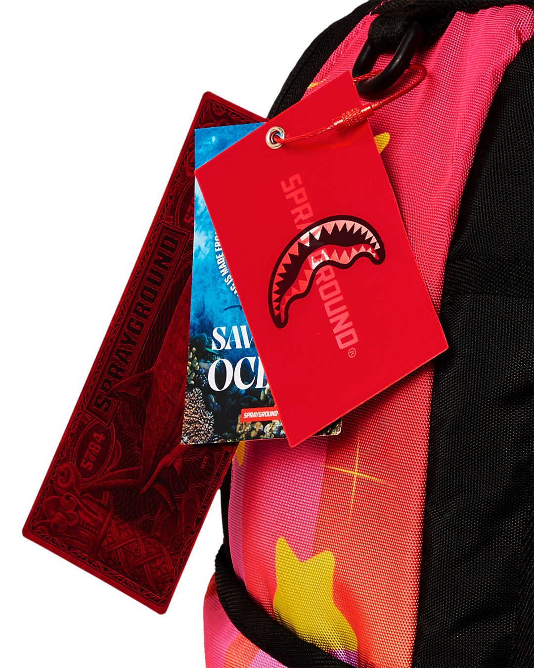 Dimensions: 18' x 6' x 11.5' • Front zipper pocket • Side pockets • Zippered Stash pocket • Separate velour sunglass compartment • Ergonomic mesh back padding • Adjustable Straps for custom sizing • Gold zippers with metal hardware • Metal 'Sprayground Authentic' badge • Slide through back sleeve connects to carry-on luggage to free your hands
