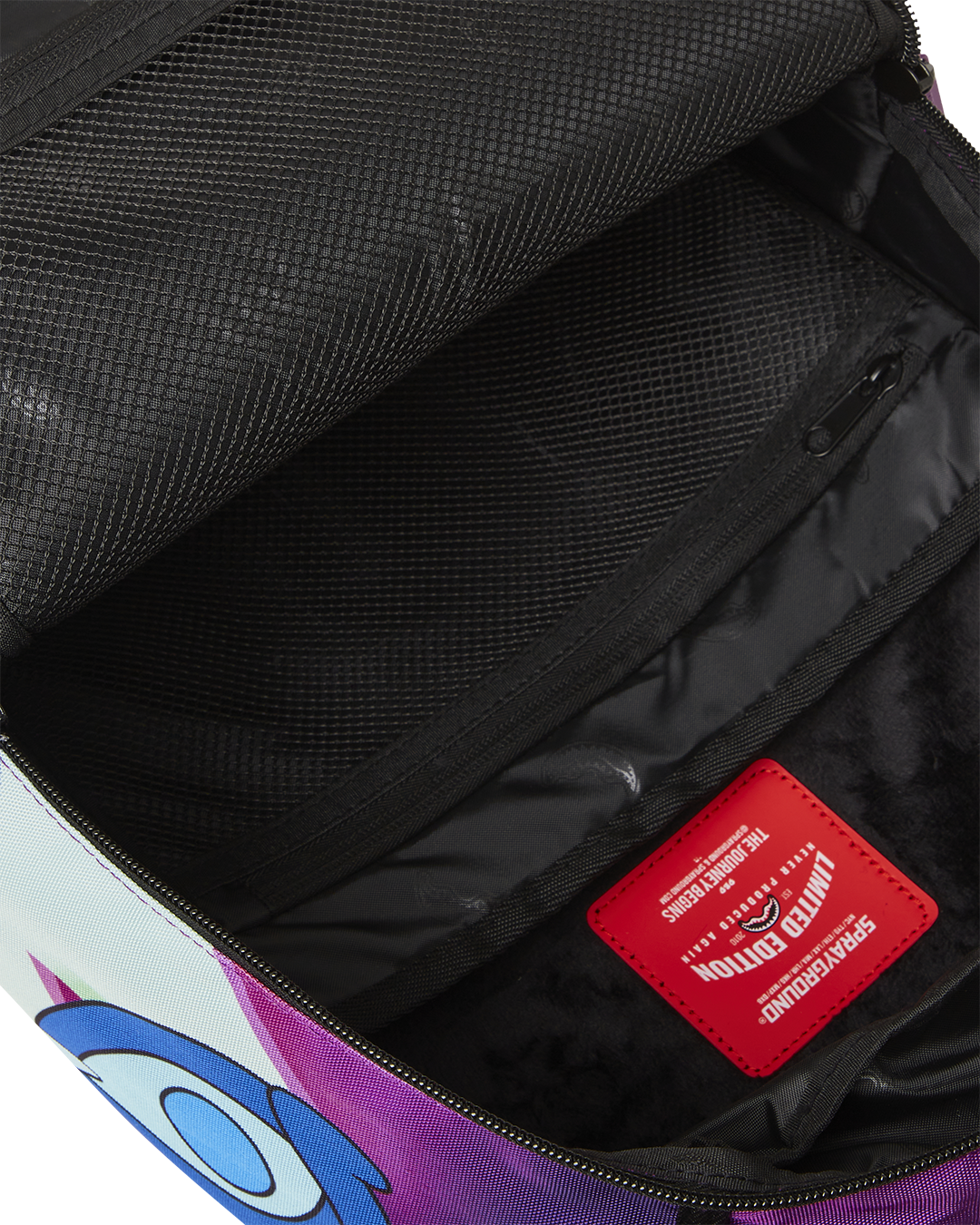Dimensions: 18' x 6' x 11.5' • Front zipper pocket • Side pockets • Zippered Stash pocket • Separate velour sunglass compartment • Ergonomic mesh back padding • Adjustable Straps for custom sizing • Gold zippers with metal hardware • Metal 'Sprayground Authentic' badge • Slide through back sleeve connects to carry-on luggage to free your hands