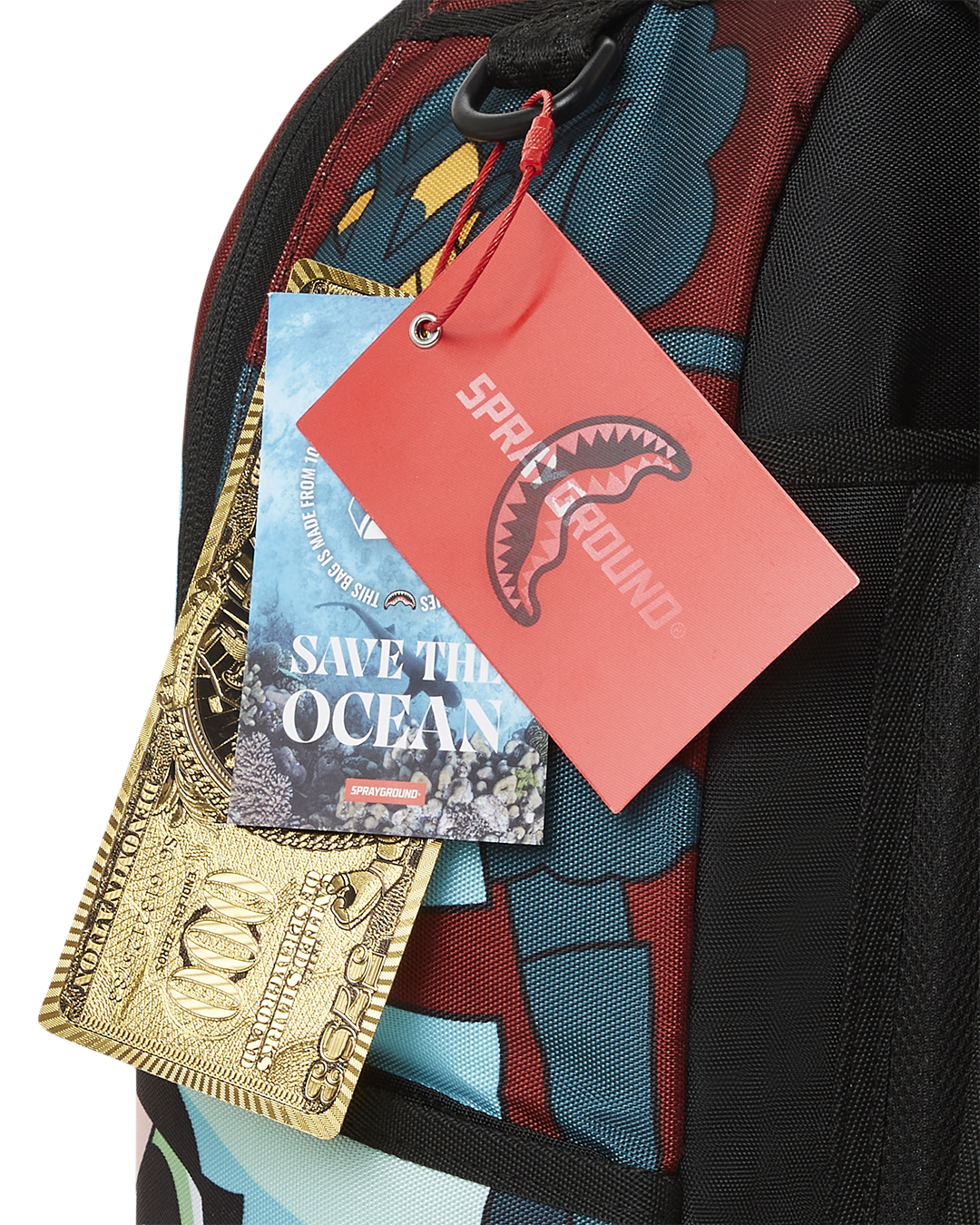 Dimensions: 18' x 6' x 11.5' • Front zipper pocket • Side pockets • Zippered Stash pocket • Separate velour sunglass compartment • Ergonomic mesh back padding • Adjustable Straps for custom sizing • Gold zippers with metal hardware • Metal 'Sprayground Authentic' badge • Slide through back sleeve connects to carry-on luggage to free your hands