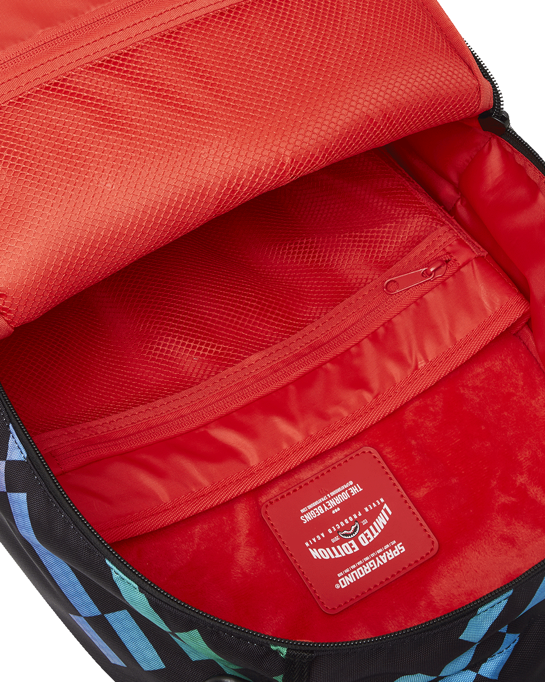 Dimensions: 18' x 6' x 11.5' • Front zipper pocket • Side pockets • Zippered Stash pocket • Separate velour sunglass compartment • Ergonomic mesh back padding • Adjustable Straps for custom sizing • Gold zippers with metal hardware • Metal 'Sprayground Authentic' badge • Slide through back sleeve connects to carry-on luggage to free your hands