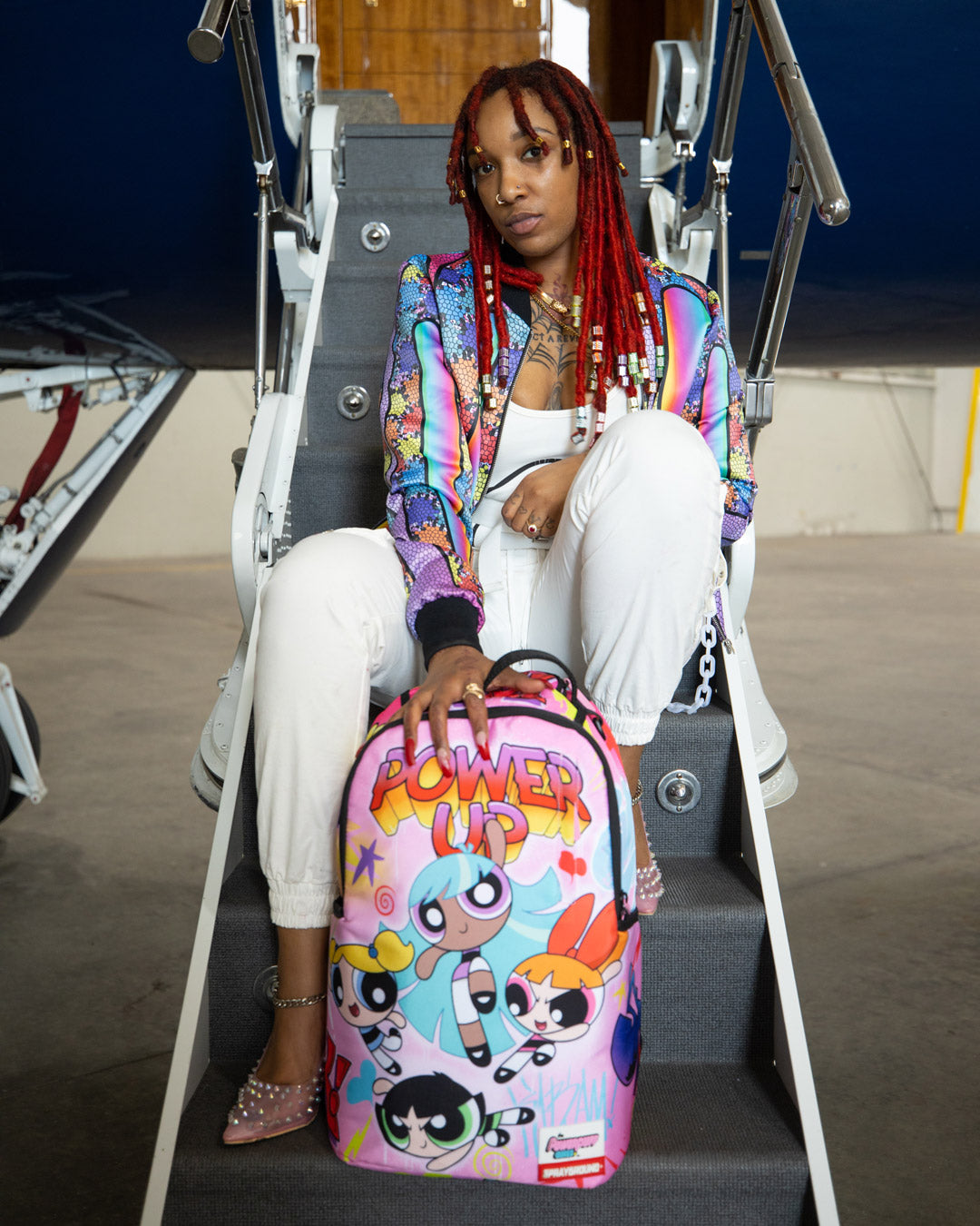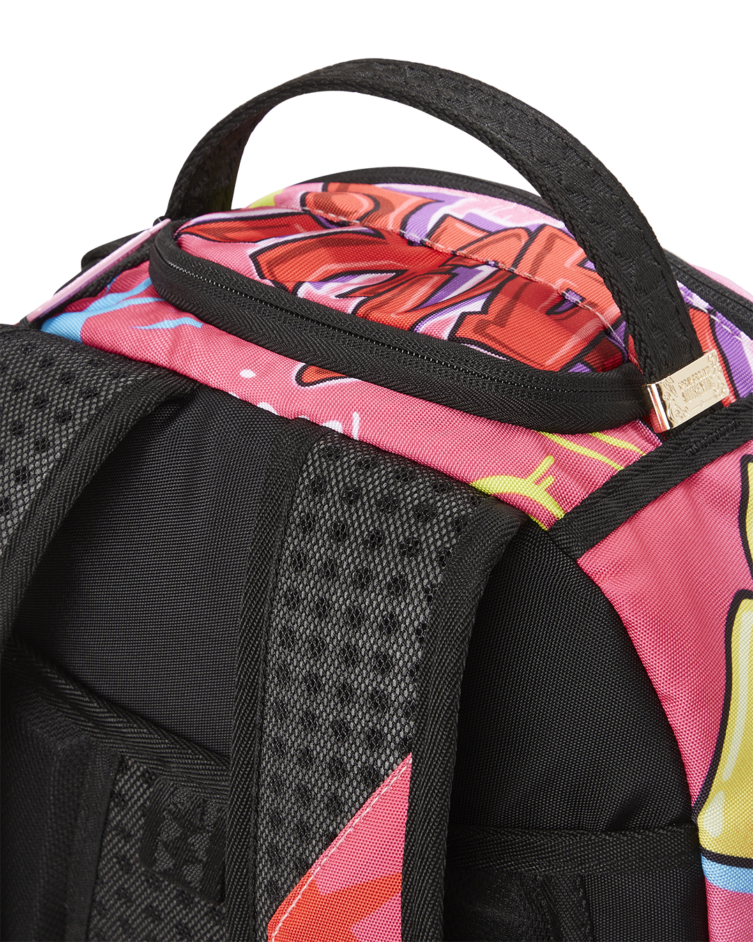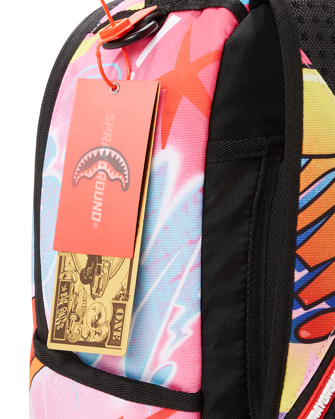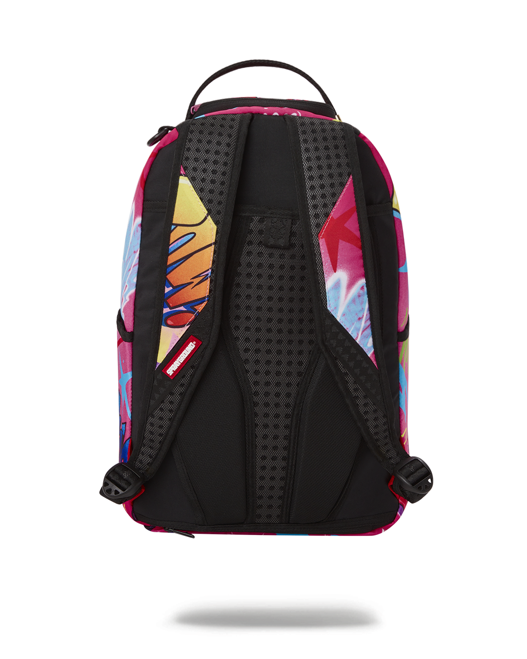 ExteriorDimensions: 18' x 6' x 11.5' • Front zipper pocket • Side pockets • Zippered Stash pocket • Separate velour sunglass compartment • Ergonomic mesh back padding • Adjustable Straps for custom sizing • Green zippers with metal hardware • Metal 'Sprayground Authentic' badge • Slide through back sleeve connects to carry on luggage to free your hands