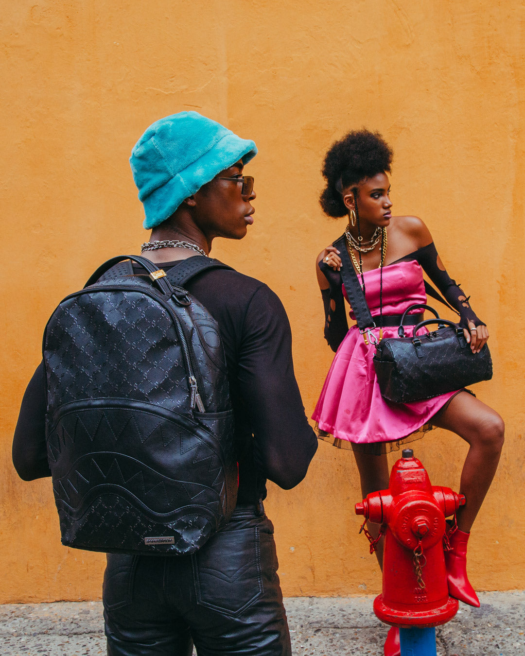 Dimensions: 18' x 6' x 11.5' • Front zipper pocket • Side pockets • Zippered Stash pocket • Separate velour sunglass compartment • Ergonomic mesh back padding • Adjustable Straps for custom sizing • Gold zippers with metal hardware • Metal 'Sprayground Authentic' badge • Slide through back sleeve connects to carry-on luggage to free your hands