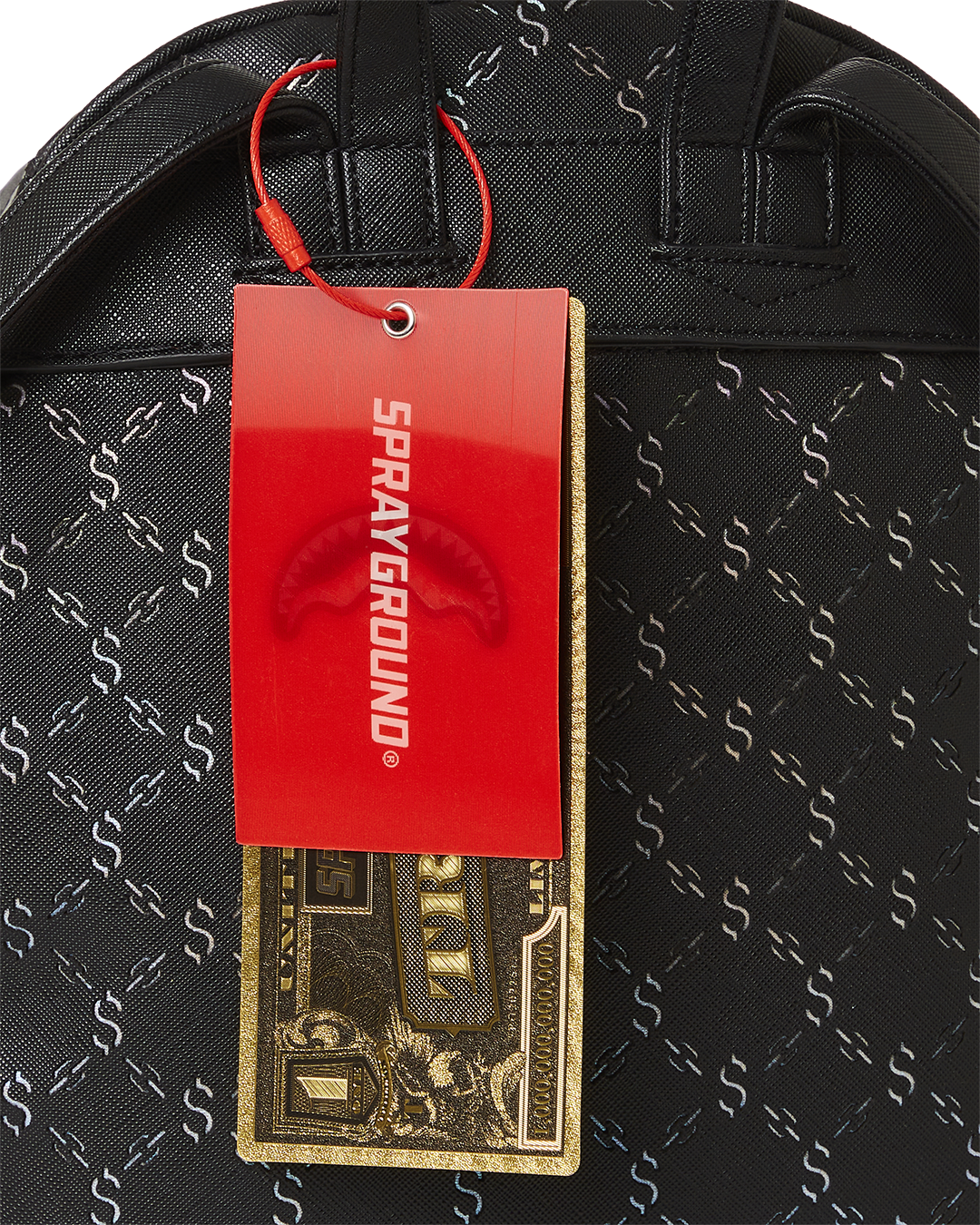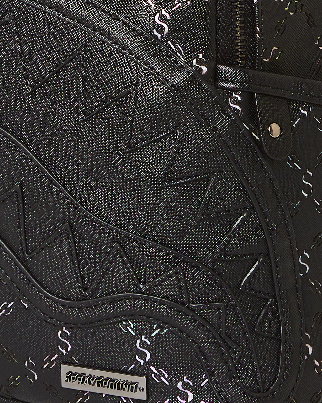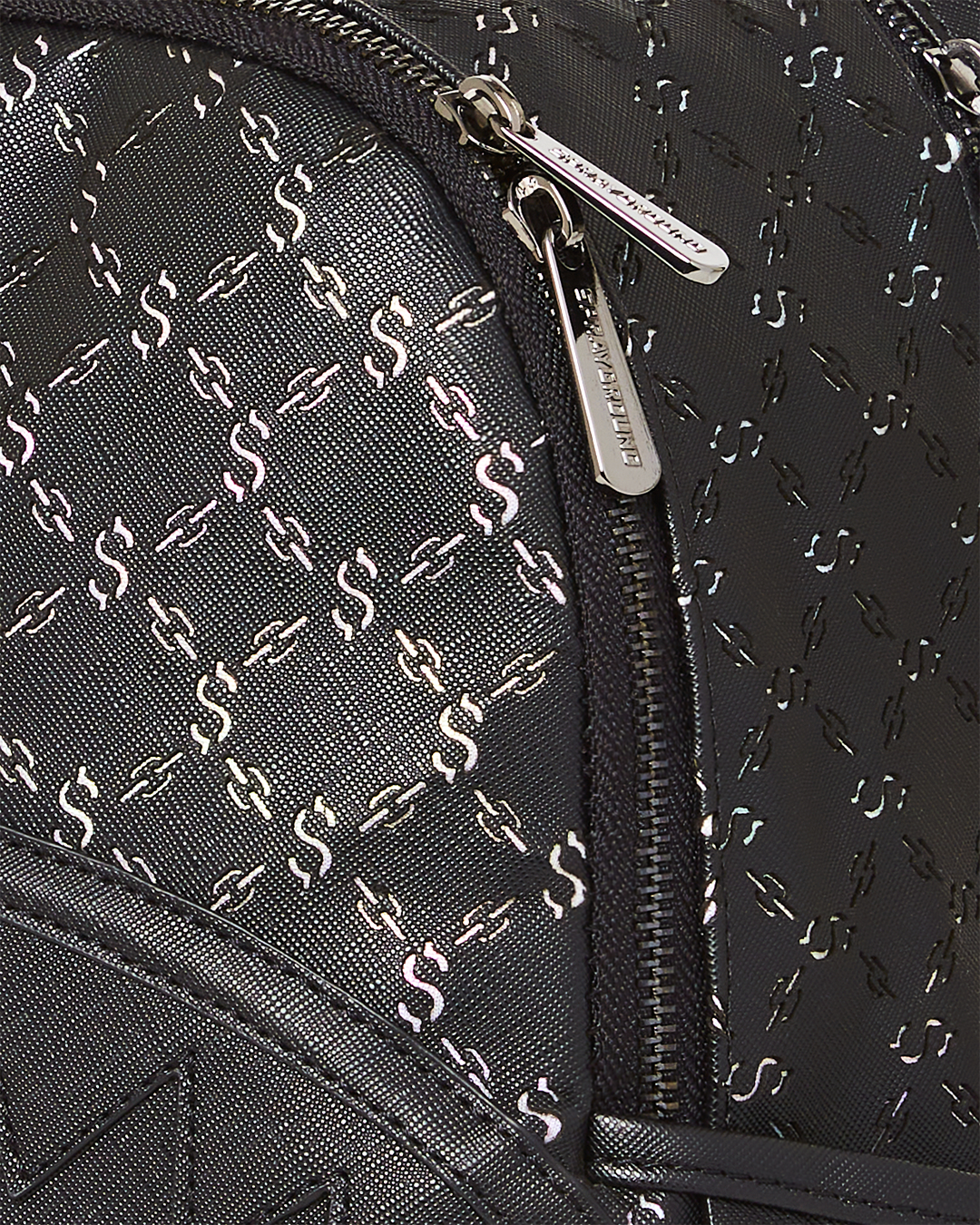 100% PVC with exclusive laser cut money logo pattern applied over metallic iridescent fabric to give a touch of shimmer to the fabric