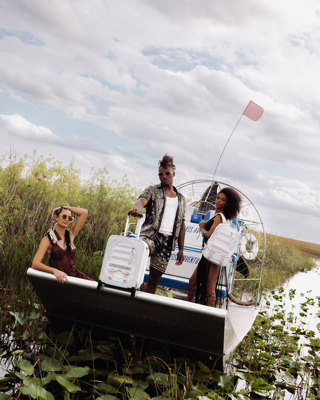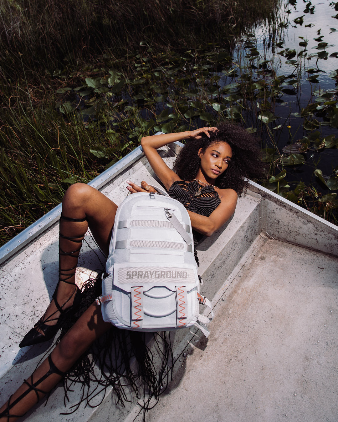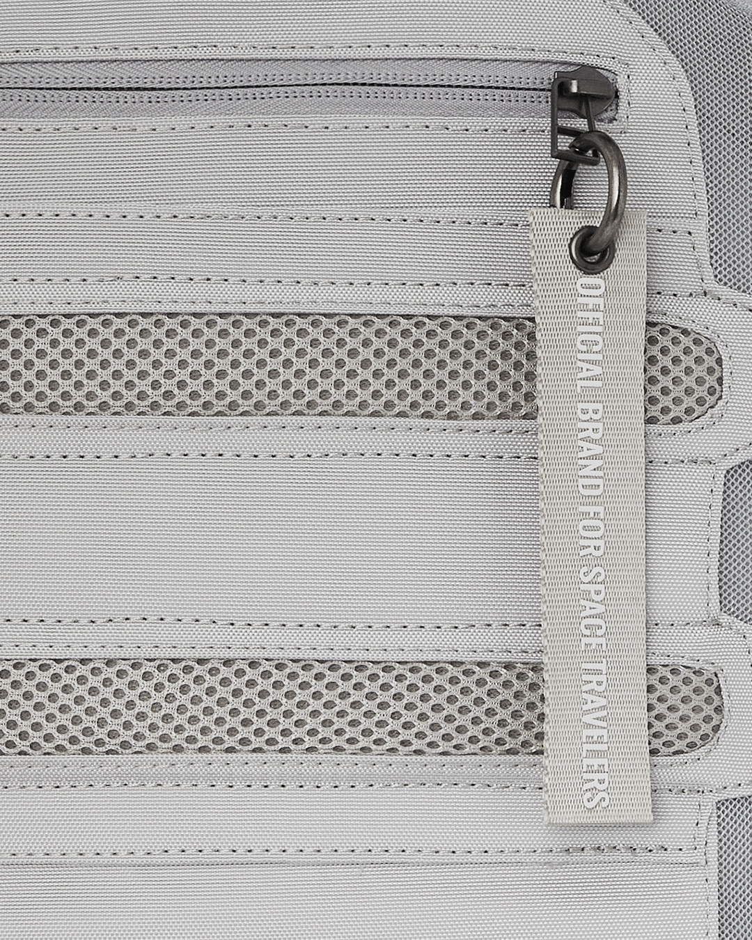 Dimensions: 18' x 6' x 11.5' • Front zipper pocket • Side pockets • Zippered Stash pocket • Separate velour sunglass compartment • Ergonomic mesh back padding • Adjustable Straps for custom sizing • Gold zippers with metal hardware • Metal 'Sprayground Authentic' badge • Slide through back sleeve connects to carry-on luggage to free your hands