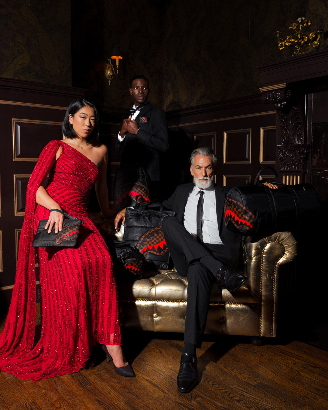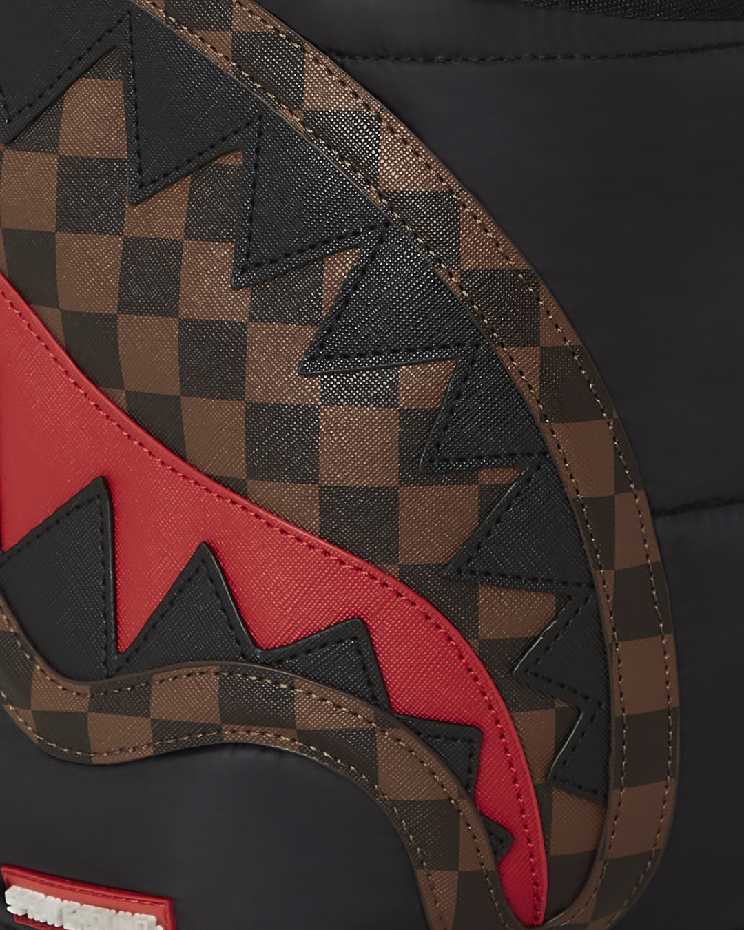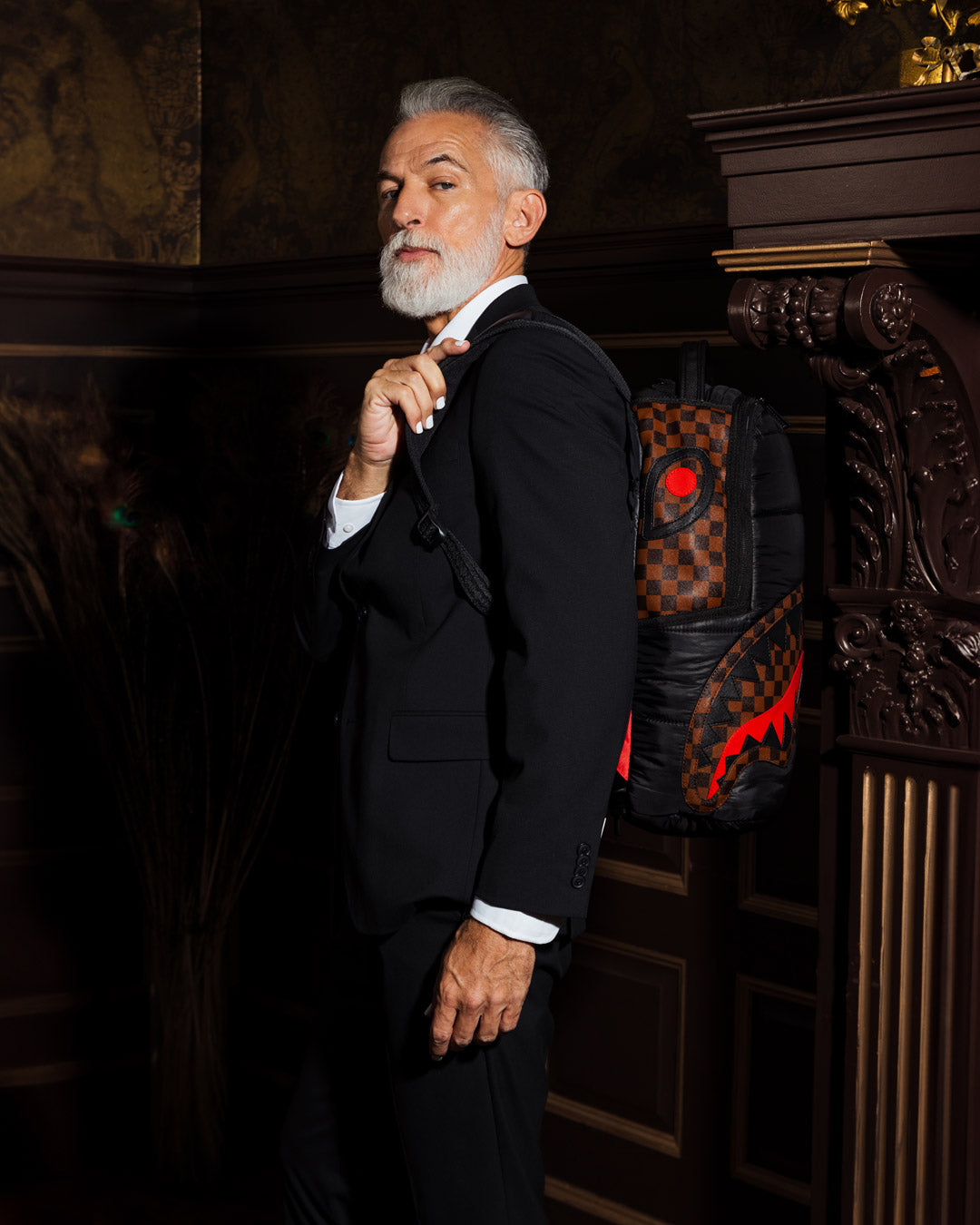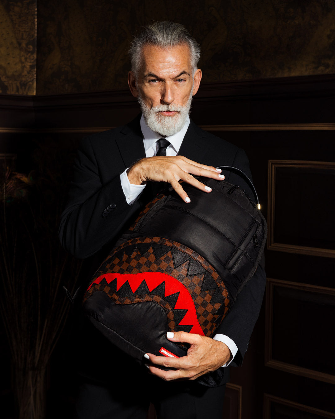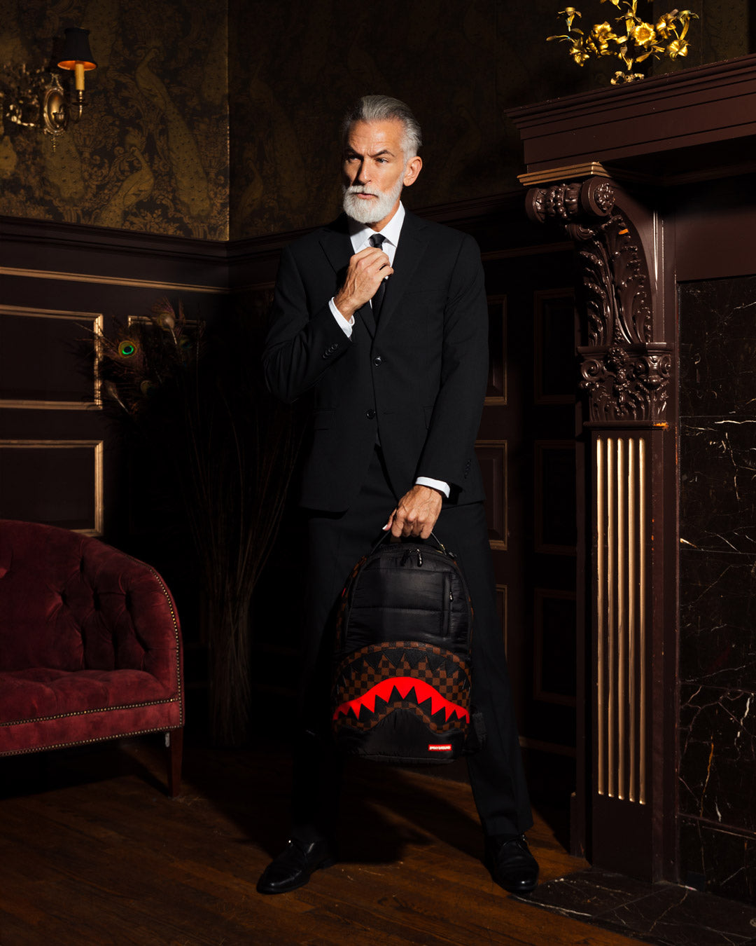 Dimensions: 18' x 6' x 11.5' • Front zipper pocket • Side pockets • Zippered Stash pocket • Separate velour sunglass compartment • Ergonomic mesh back padding • Adjustable Straps for custom sizing • Gold zippers with metal hardware • Metal 'Sprayground Authentic' badge • Slide through back sleeve connects to carry-on luggage to free your hands